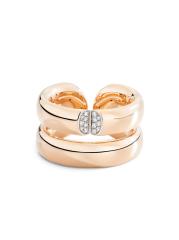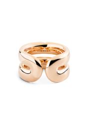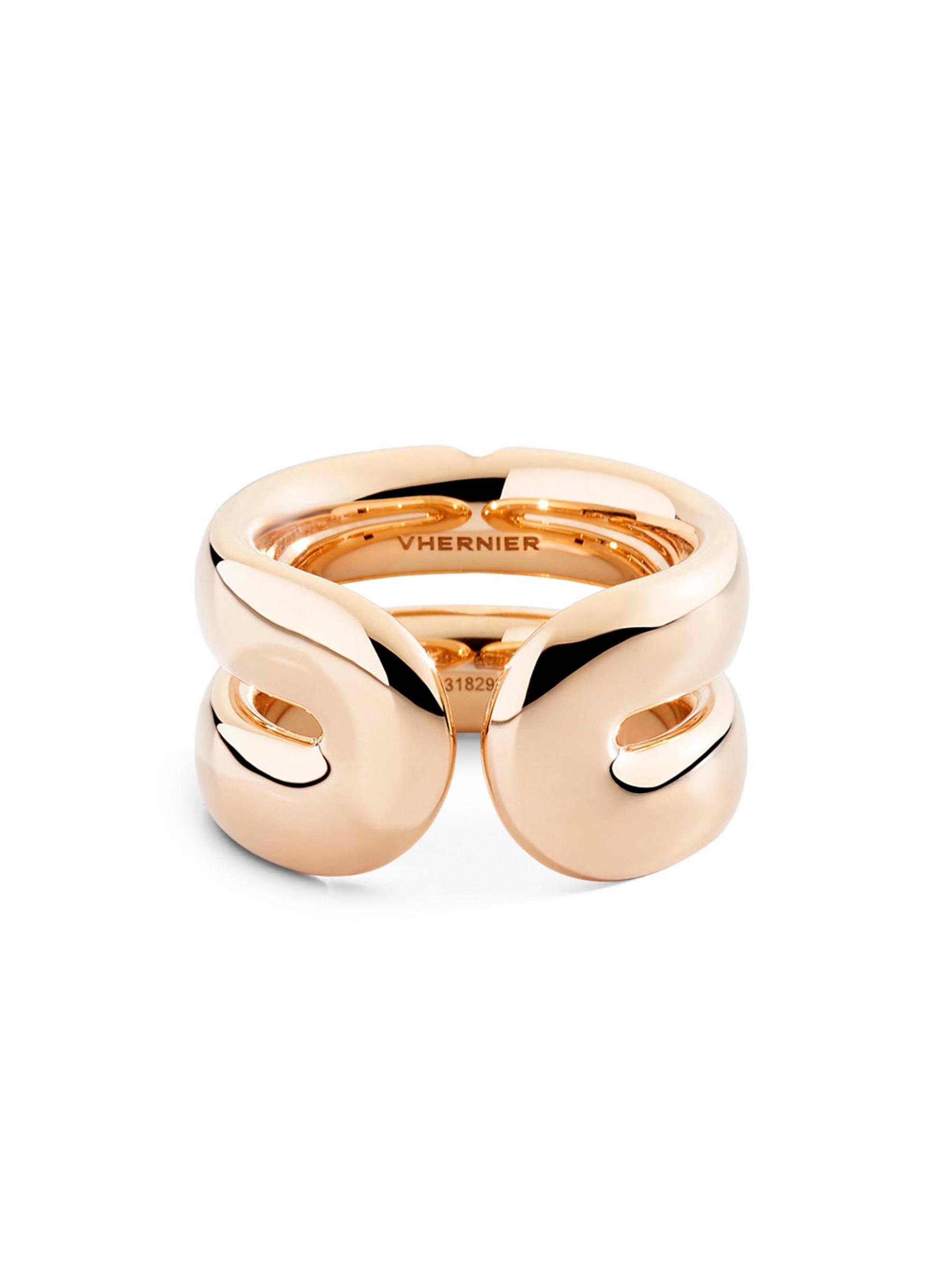 من مجموعة مون جيو. يتميز هذا الخاتم من Vhernier بتصميم شريطي مزدوج مع تفاصيل مدببة، وهو مصنوع يدويًا من الذهب الوردي المصقول عيار 18 قيراطًا والمرصع بأحجار الماس المرصوفة المتلألئة.