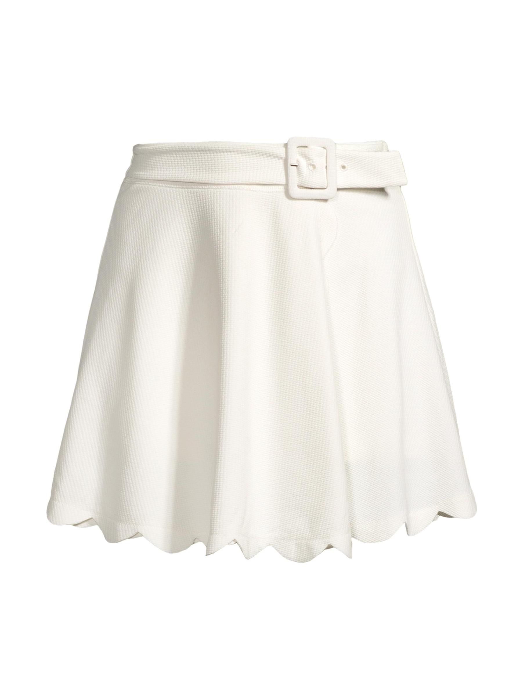 يُحدد الحزام الذاتي خصر تنورة مونيكا من Marysia، المُصممة بحافة صدفية مرحة.