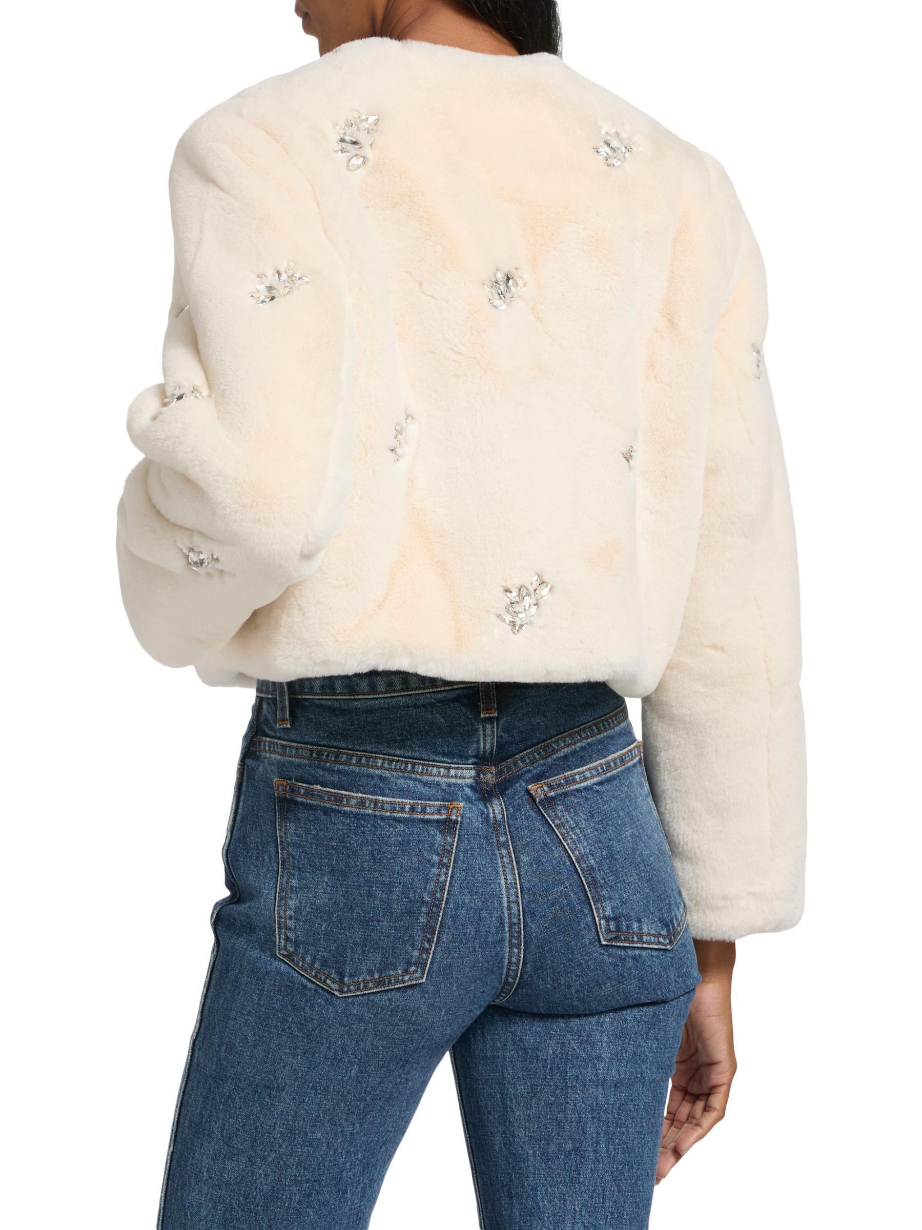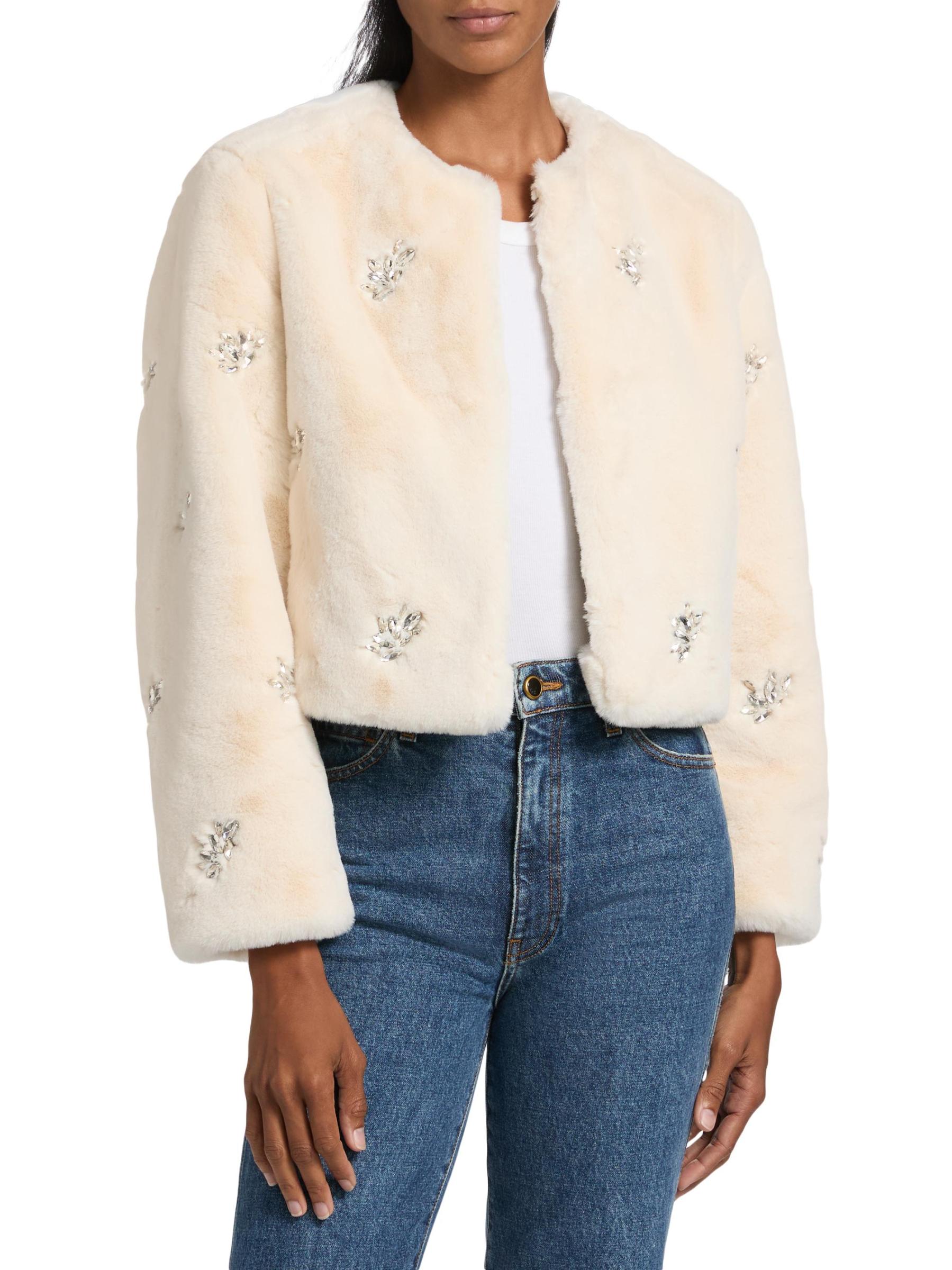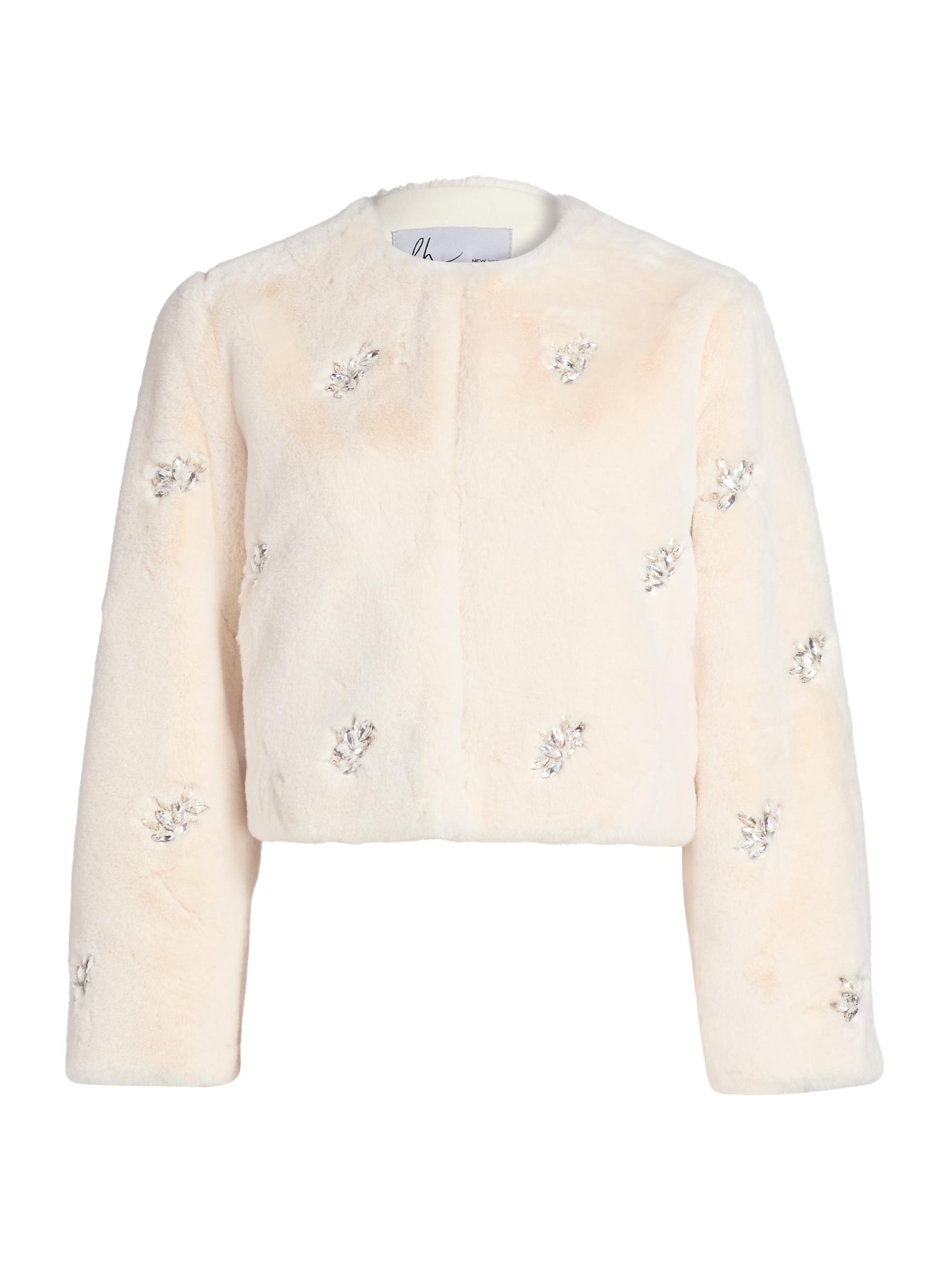 جاكيت Monique من dh New York مصنوع من الفرو الصناعي المخملي ومزين بزخارف كريستالية لامعة.
