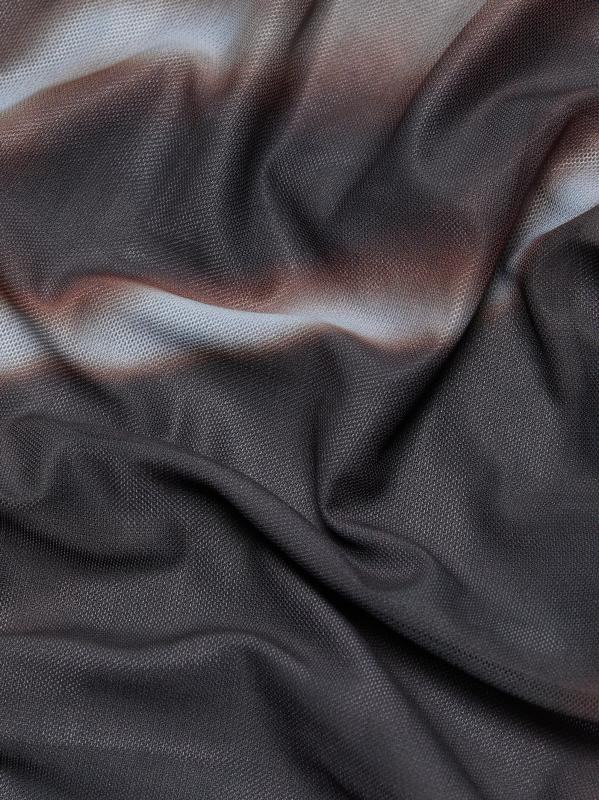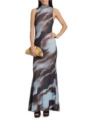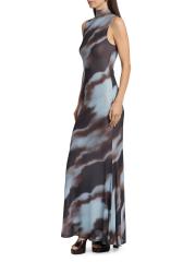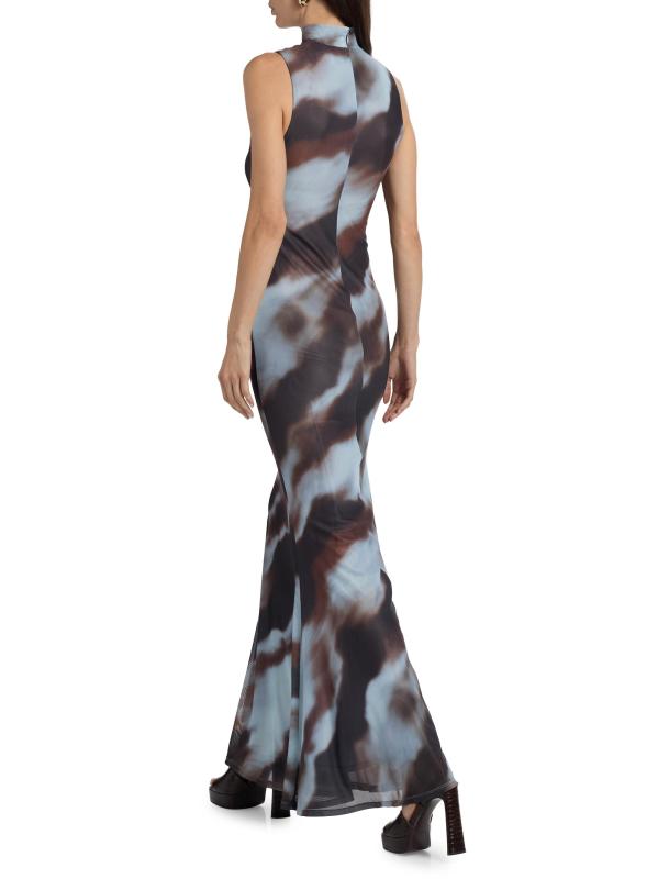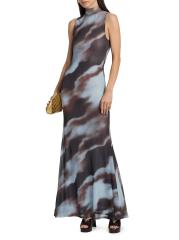 صُمم فستان موريل الطويل من روني كوبو بياقة مدورة وهمية وصورة ظلية بلا أكمام ونمط تجريدي.