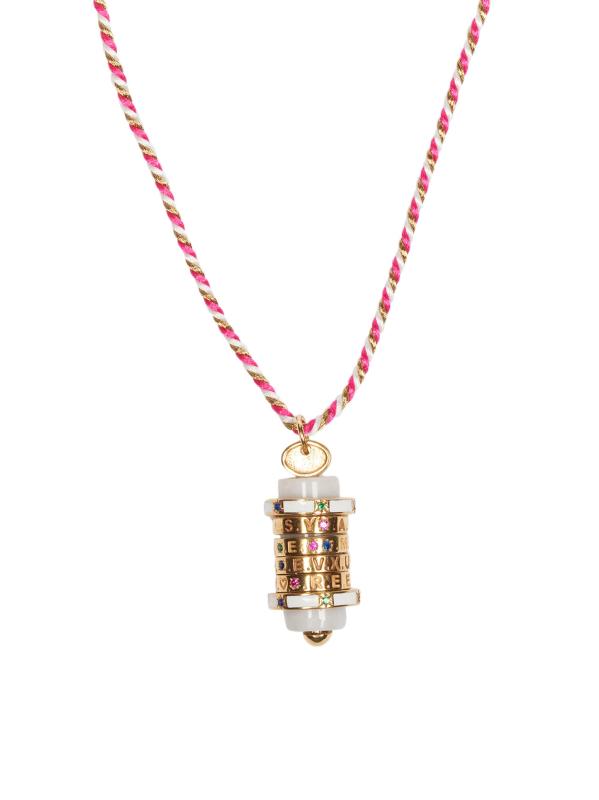 من مجموعة موت دي باس. تتميز قلادة Energetique المصنوعة من الخيوط من Caroline de Benoist، المستوحاة من الأقفال القديمة، بقلادة دوارة من أربع حلقات منقوشة بكلمات «الحب والحب والإثارة والحرية». تضفي المينا الخضراء والزركون اللامع متعدد الألوان لمسة جميلة على هذه القطعة الفريدة.
