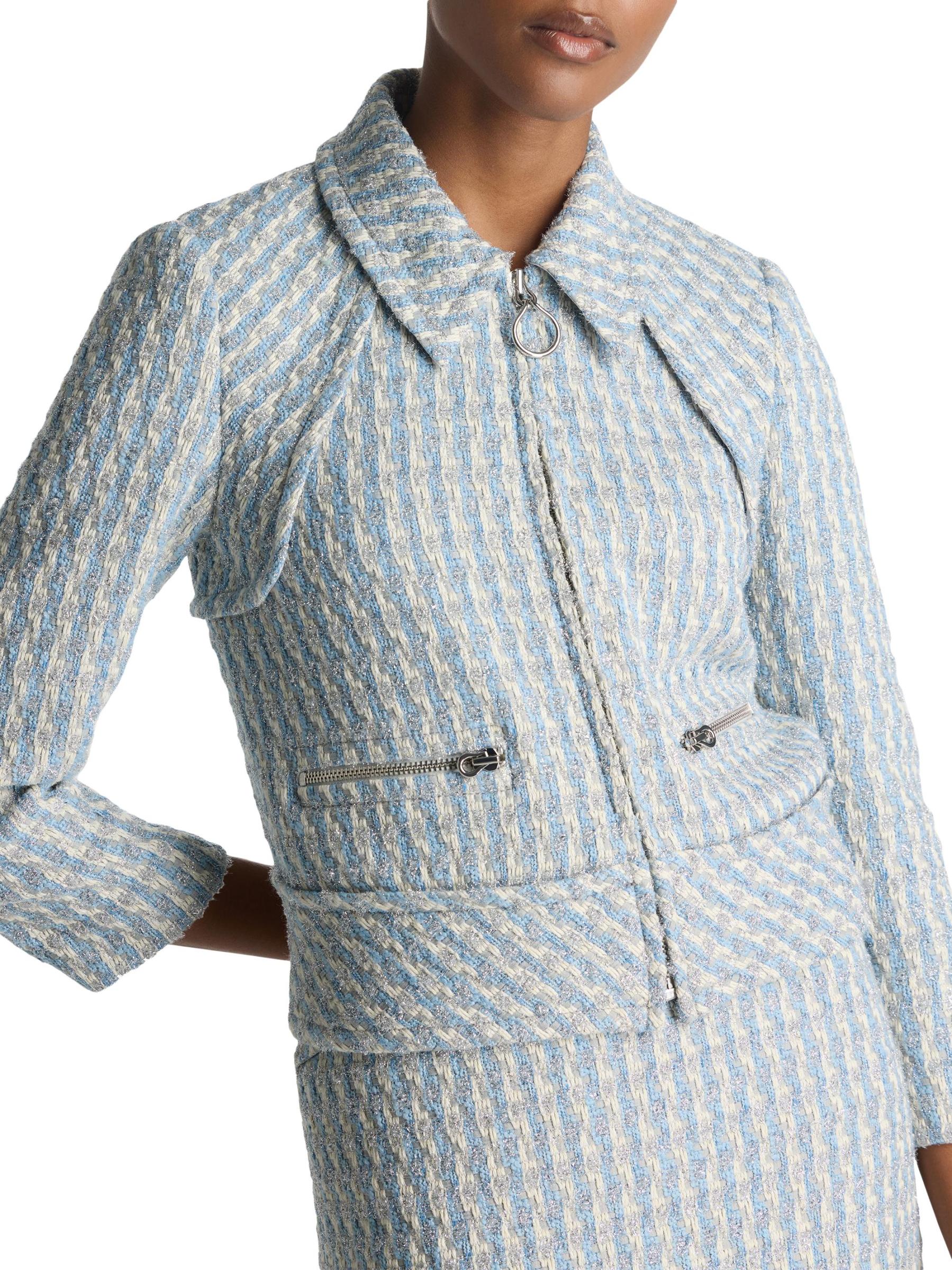 تتميز سترة سانت جون المصنوعة من التويد متعددة الخيوط بلمسات من خيوط الشريط وتفاصيل سحّاب معدني، وكلها مبطنة بدقة لمزيج من الفخامة والأناقة الخالدة.ياقة مدببة أكمام طويلة جيوب أمامية بسحّاب إغلاق بسحّاب أمامي 28% قطن/ 25% نايلون/ 19% أكريليك/18% بوليستر/ 8% بوليستر معدني/ 2% ألياف أخرى تنظيف جاف مستوردة