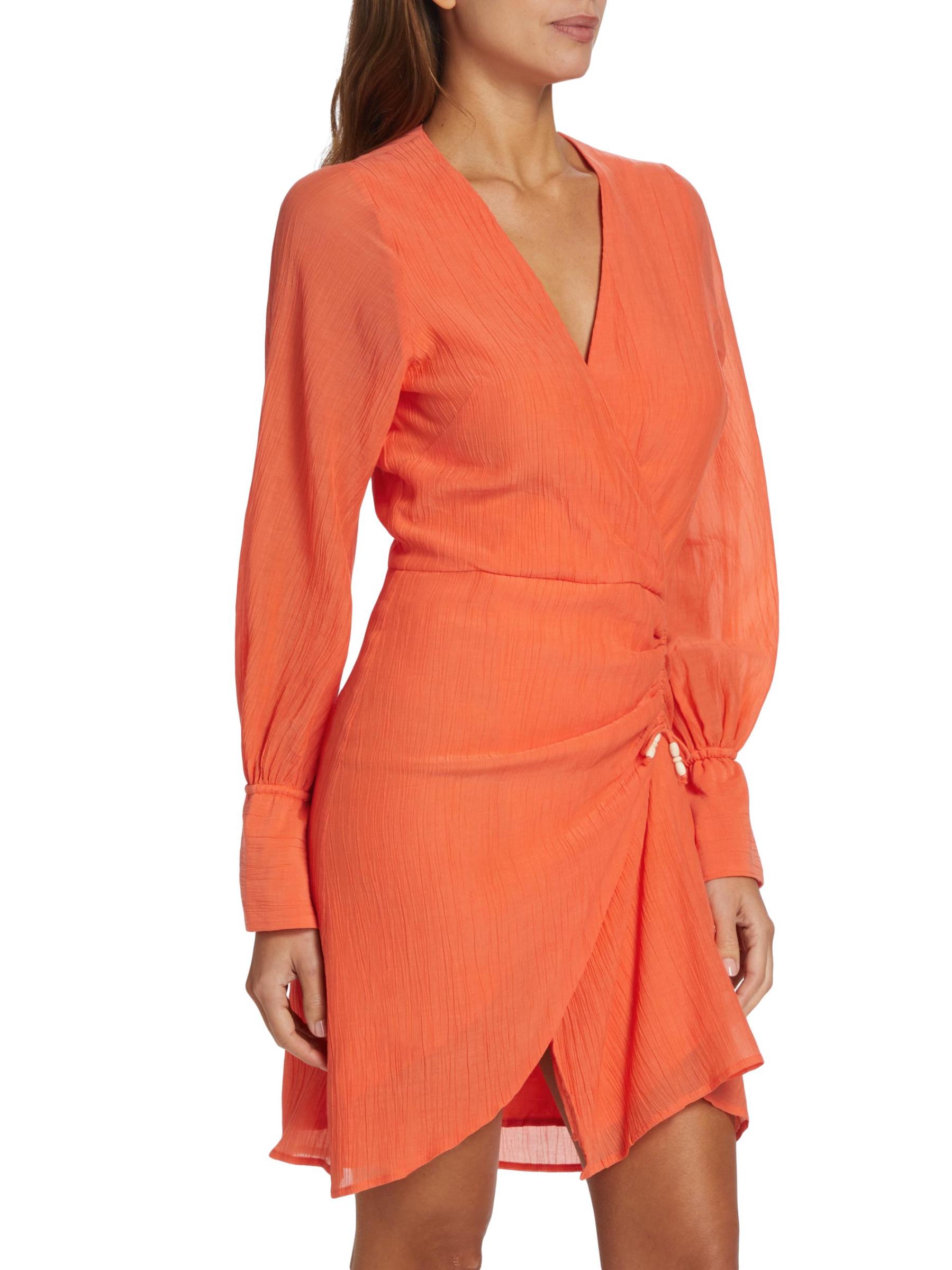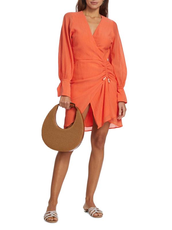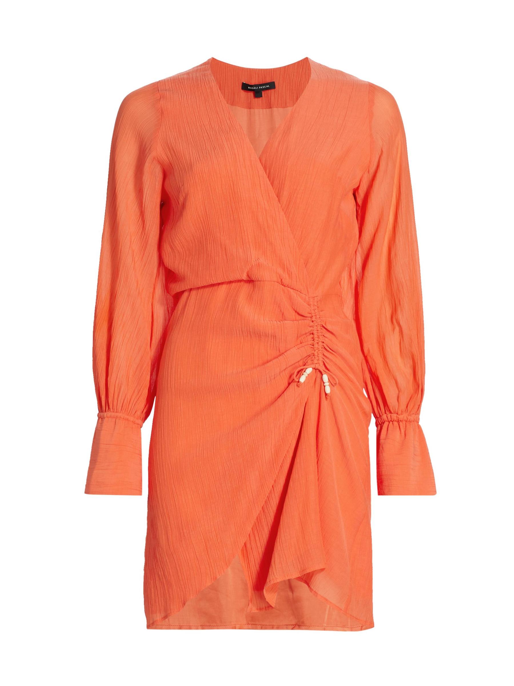 فستان ميرتل القصير من ماغالي باسكال مصنوع من الشاش. يتميز هذا التصميم ذو الشكل الملفوف برقبة مطاطية وأكمام طويلة وواجهة مكشكشة.