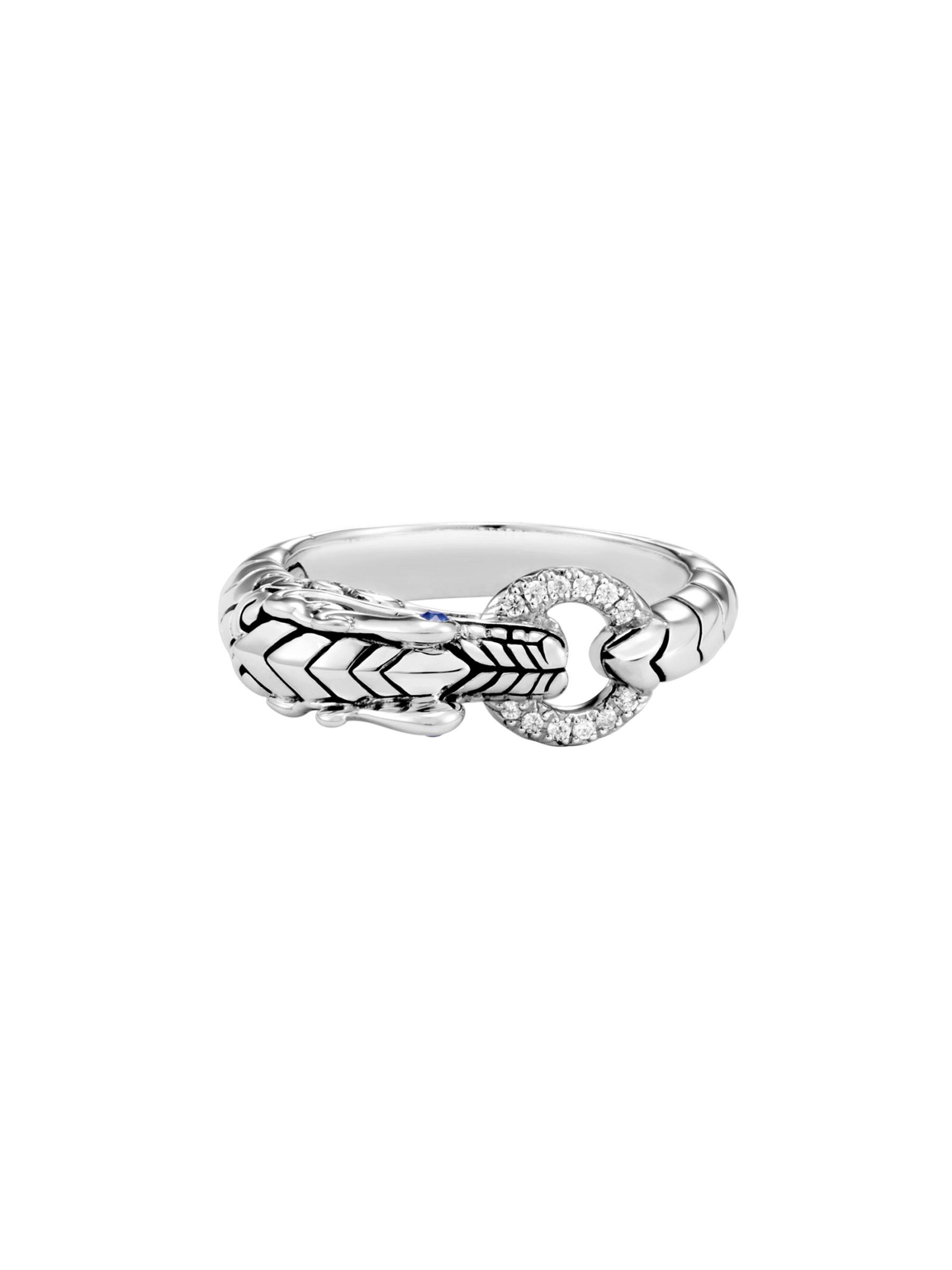 من مجموعة Naga. يتميز الخاتم المذهل من الفضة الإسترلينية بتصميم رأس Naga المثير مع عيون الياقوت الأزرق المفعمة بالحيوية. مزينة بالمرصوف الماسي والزخارف المعقدة المنحوتة يدويًا التي تضفي عليها مظهرًا جرافيكيًا.ألماس أبيض، 0.04 tcw لون الماس: G-H وضوح الماس: S1 الياقوت الأزرق الفضة الإسترلينية مستوردة
