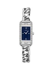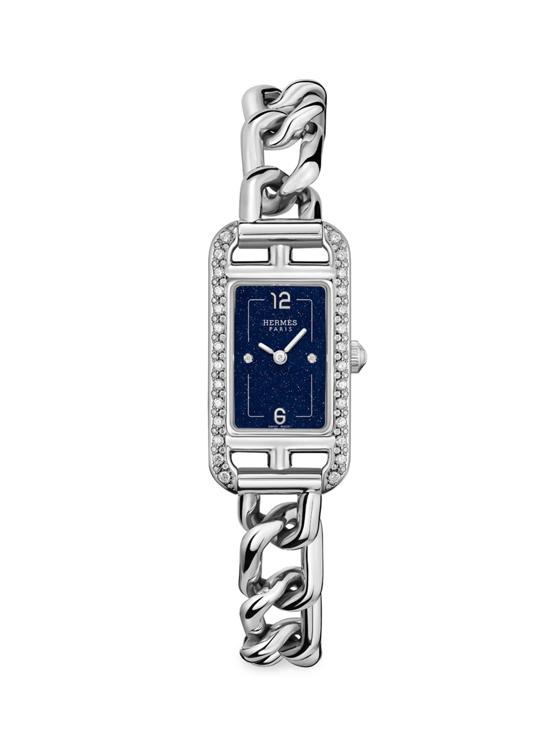من مجموعة نانتوكيت. تتميّز ساعة Hermès المصنوعة من الفولاذ المقاوم للصدأ، المُزوّدة بسوار على شكل سلسلة قصيرة، بعلبة مستطيلة مزينة بأحجار الماس المتلألئة. يُجسّد قرص أفينتورين باللون الأزرق الداكن البسيط جمالية العلامة الأنيقة والخالية من الزمن.