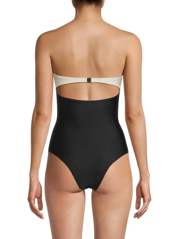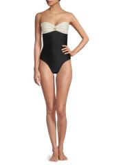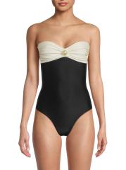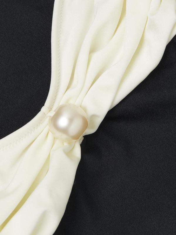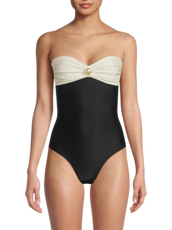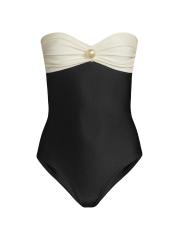 بدلة السباحة Nastya المكونة من قطعة واحدة من Shani Shani Shemer مصنوعة من قماش قابل للتمدد ومصممة برقبة على شكل قلب وصدر مكشكش بدون حمالات مع لؤلؤة صناعية في المنتصف وفتحة ظهر مرحة.