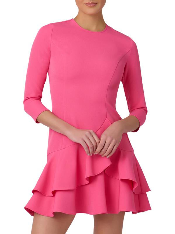 يتميّز فستان Nessa القصير من Shoshanna المصنوع من الكريب المرن بتنورة مكشكشة متعددة الطبقات مع درزات الأميرة لتشكيل الصدّار.رقبة مستديرة أكمام بطول ثلاثة أرباع حافة منفوشة إغلاق بسحّاب خلفي مخفي 100% بوليستر تنظيف جاف صُنع في الولايات المتحدة الأمريكية
