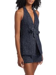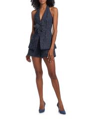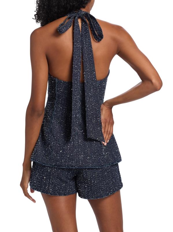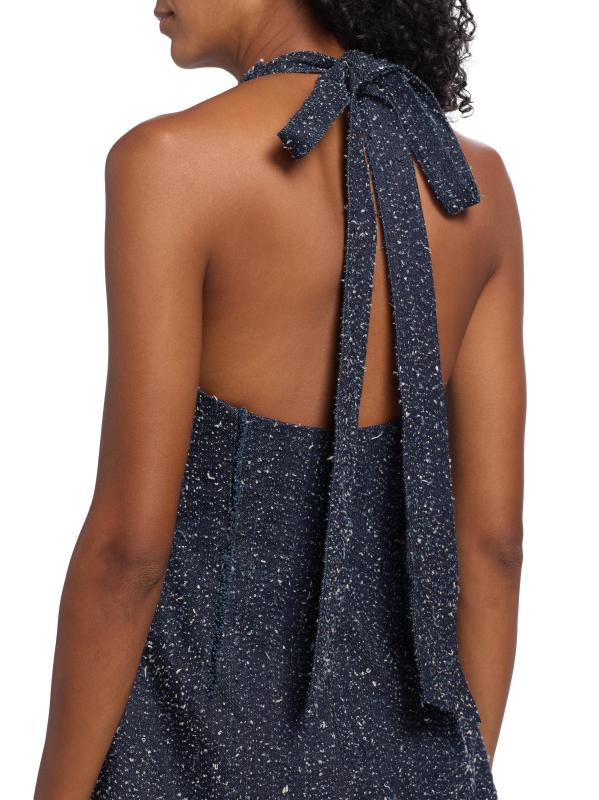 يتميّز رومبير نيفين من Amur، المصنوع من قماش التويد المطرّز من الدنيم، بتقويرة ساحرة على شكل رسن مزيّنة بربطة عنق وشورت متعدد الطبقات وزخرفة الزنبق.هالترميك بدون أكمام إغلاق برباط خلفي إغلاق بسحّاب جانبي قطن بنسبة 100% تنظيف جاف مستوردة