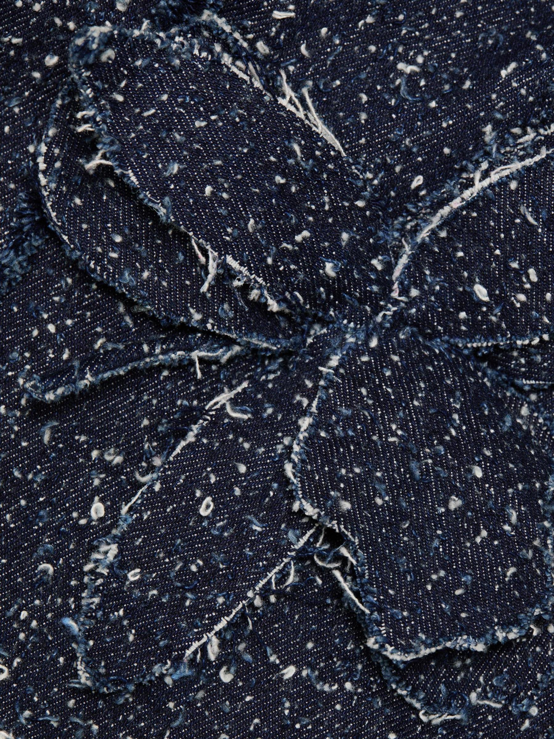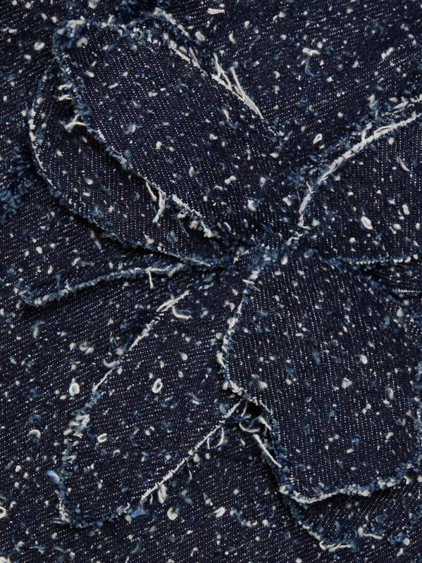 يتميّز رومبير نيفين من Amur، المصنوع من قماش التويد المطرّز من الدنيم، بتقويرة ساحرة على شكل رسن مزيّنة بربطة عنق وشورت متعدد الطبقات وزخرفة الزنبق.