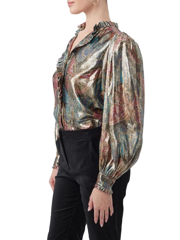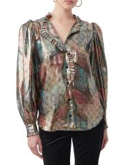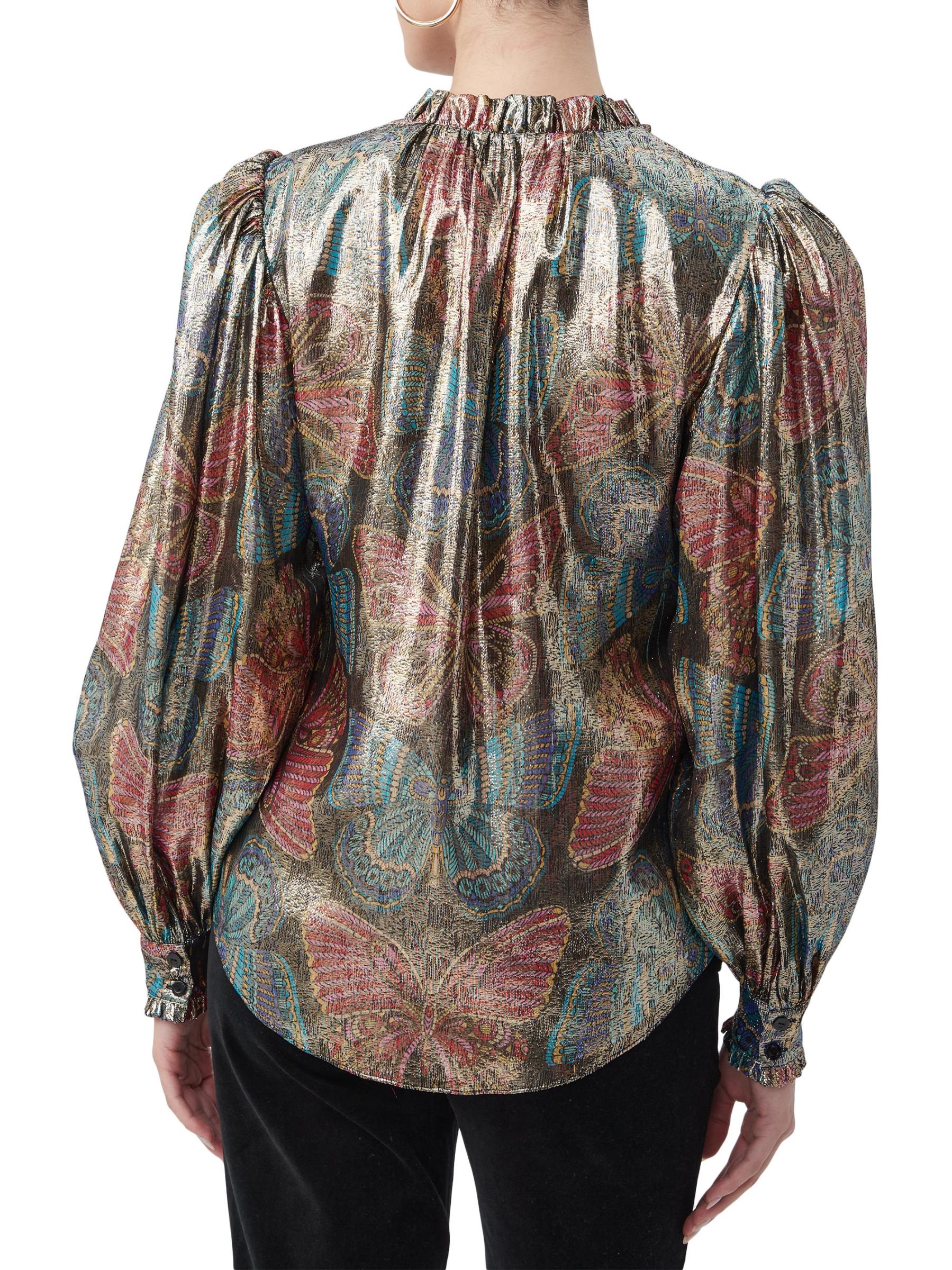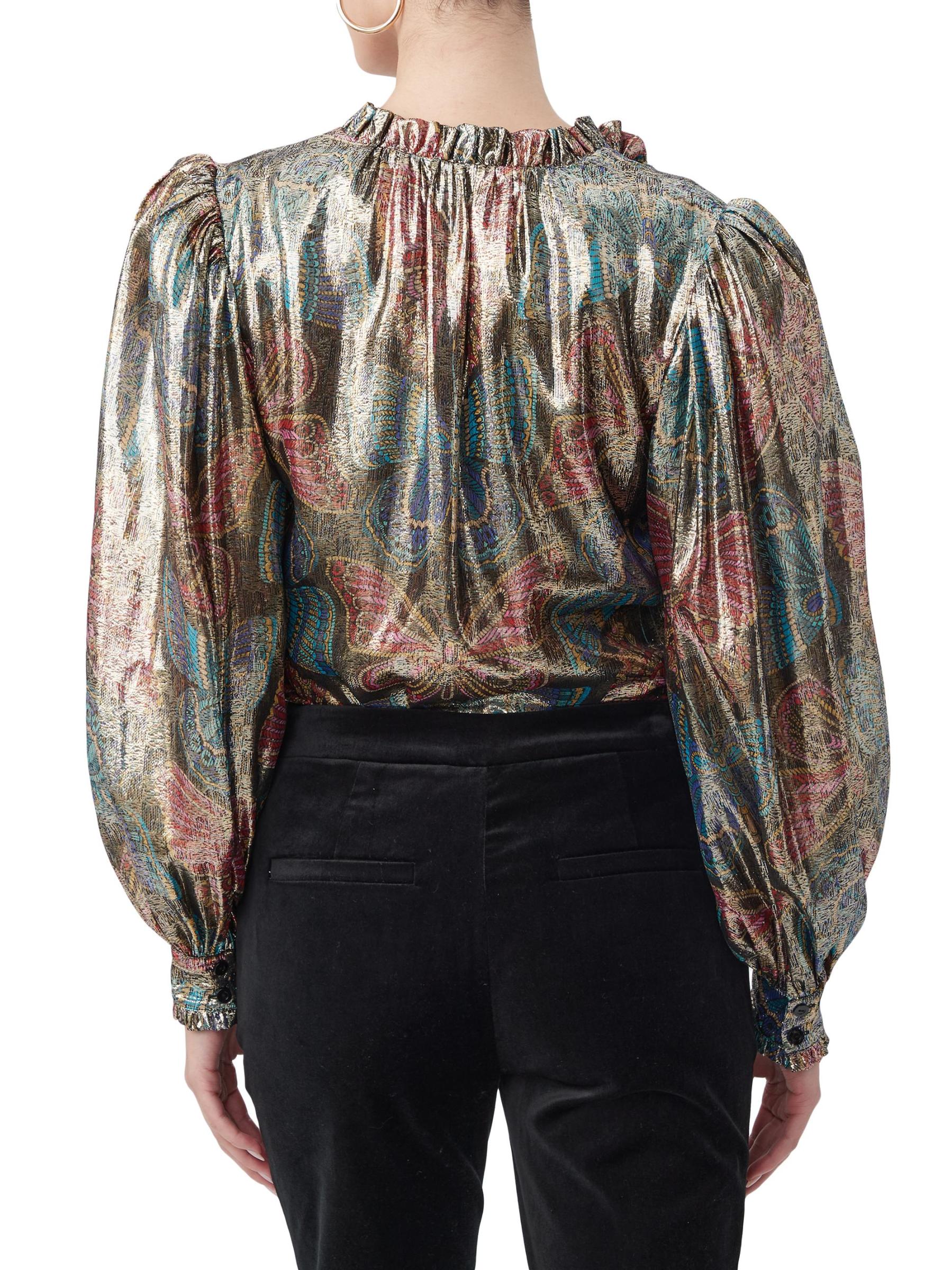 تتميّز بلوزة «نيو مون» من ترينا تورك، المصنوعة من مزيج الحرير الخفيف، بطبعة الفراشة الملكية الغريبة بلمسة نهائية معدنية. تتميز هذه القطعة المريحة بأكمام بلوزة طويلة وتقليم مكشكش.