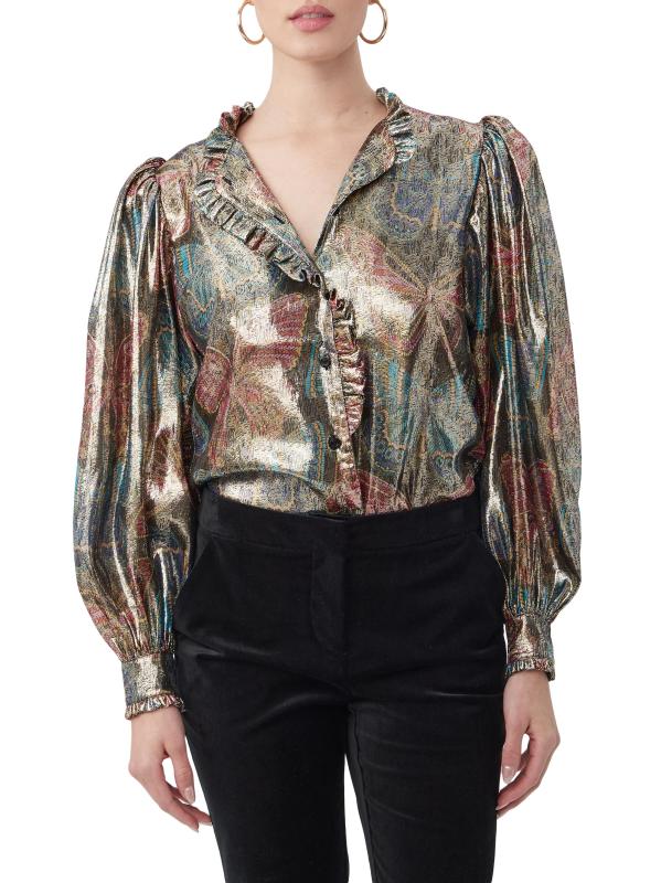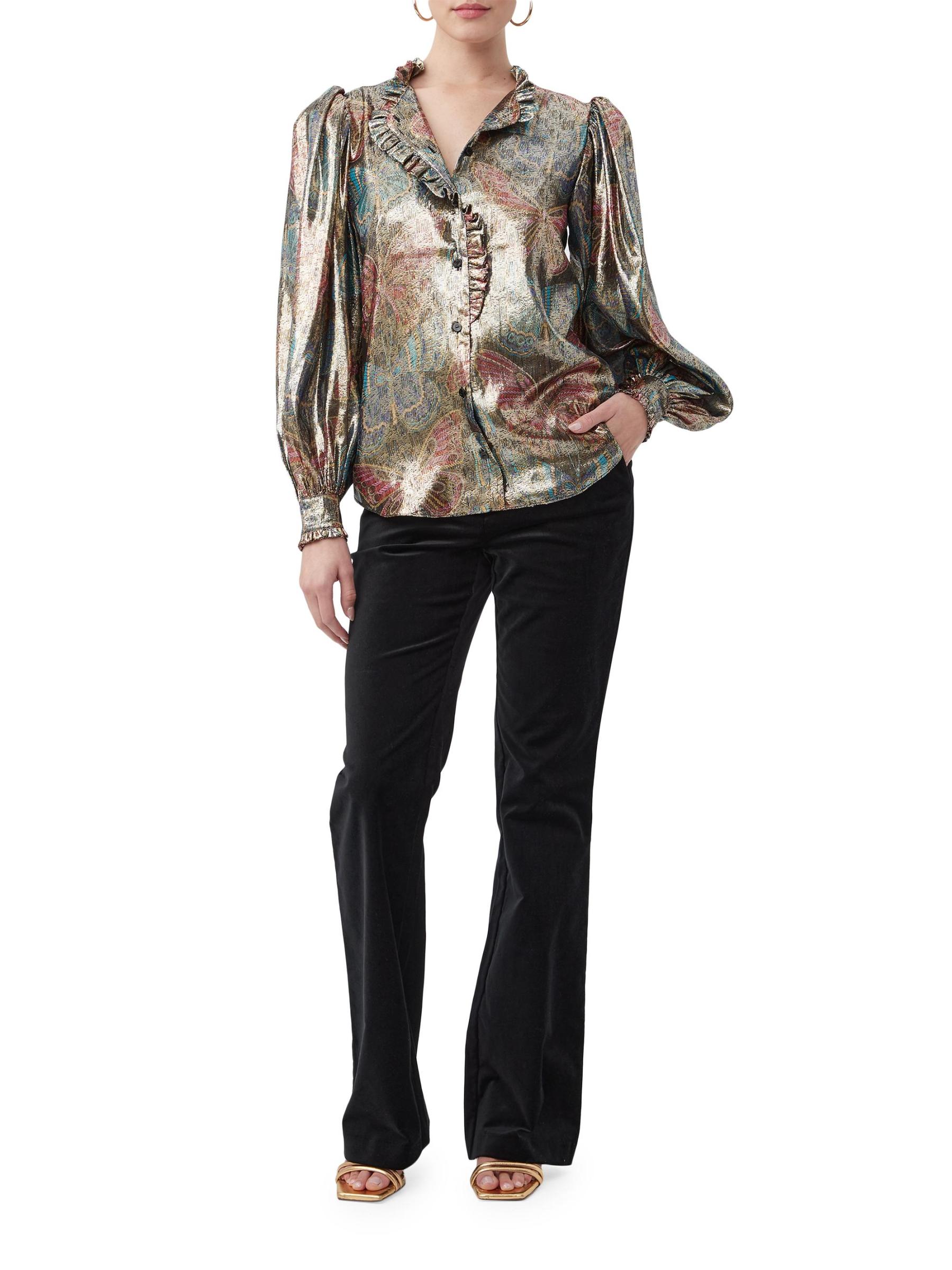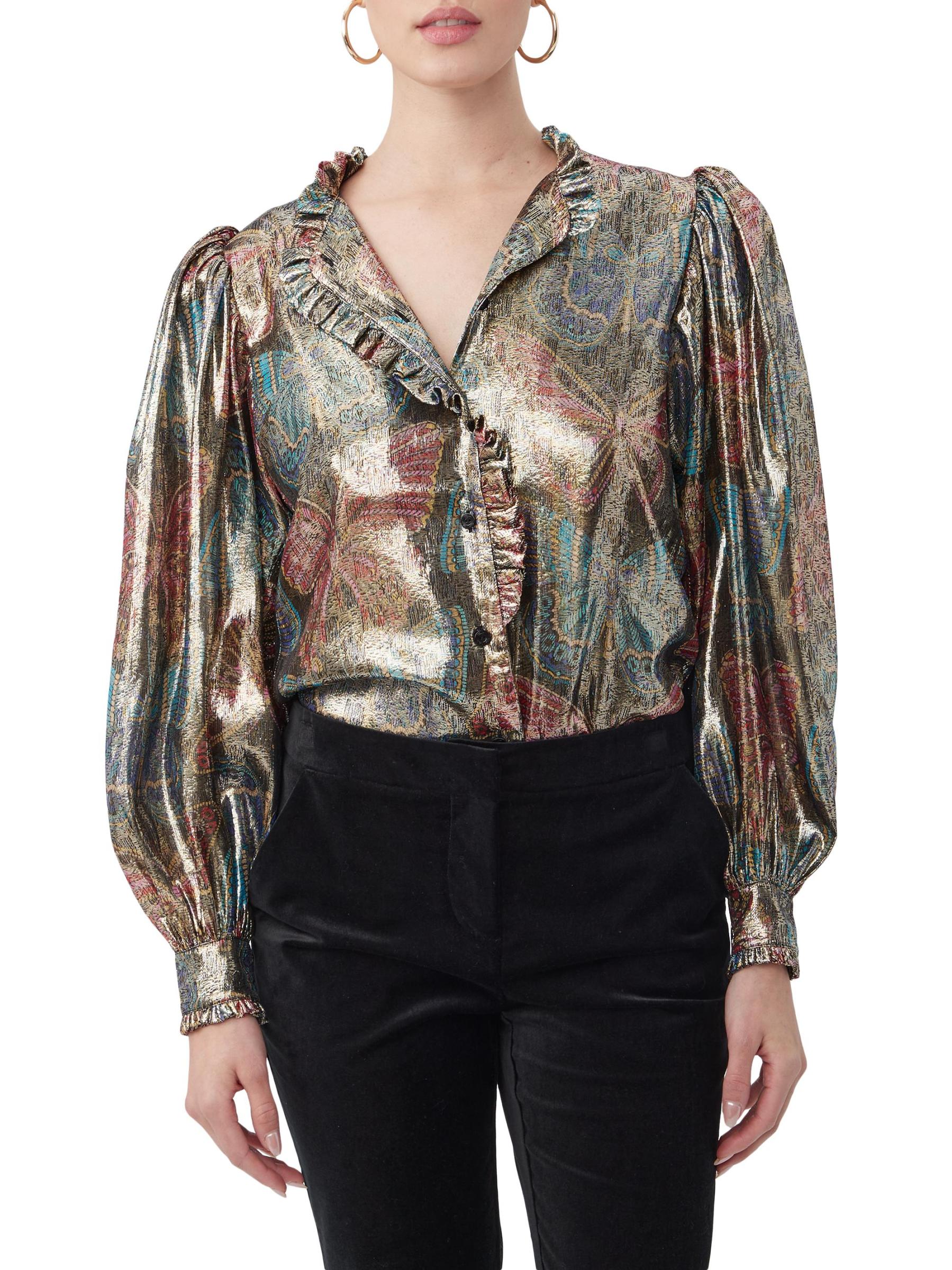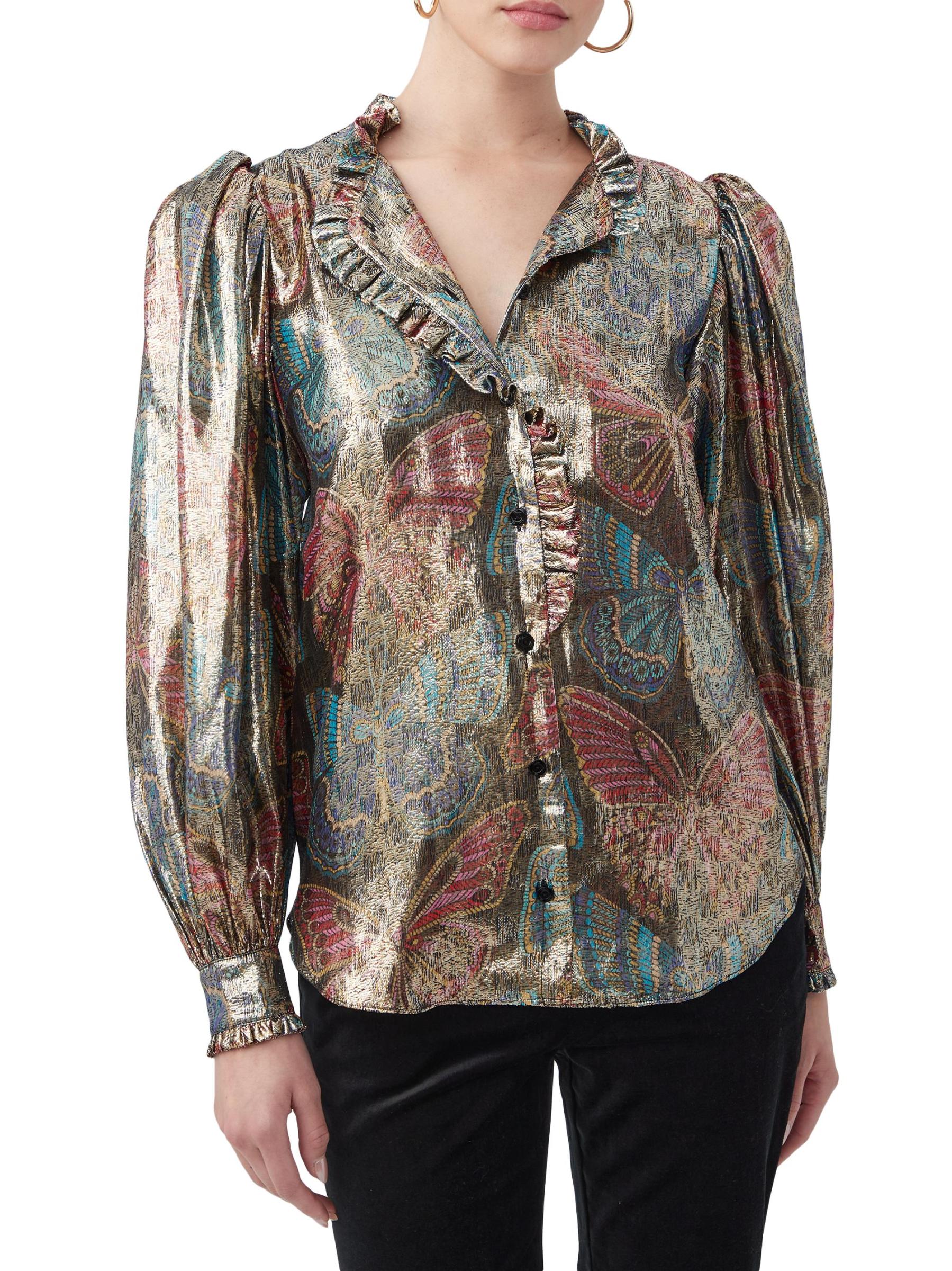 تتميّز بلوزة «نيو مون» من ترينا تورك، المصنوعة من مزيج الحرير الخفيف، بطبعة الفراشة الملكية الغريبة بلمسة نهائية معدنية. تتميز هذه القطعة المريحة بأكمام بلوزة طويلة وتقليم مكشكش.ياقة مفتوحة بلوزة بأكمام طويلة وأساور ضيقة تقليم مكشكش إغلاق بأزرار أمامية 64% حرير/ 36% بوليستر معدني تنظيف جاف مستوردة