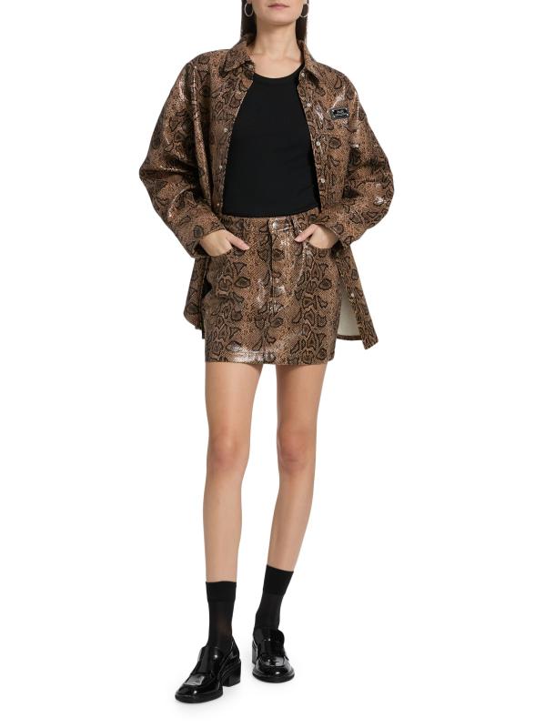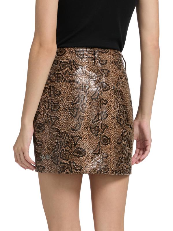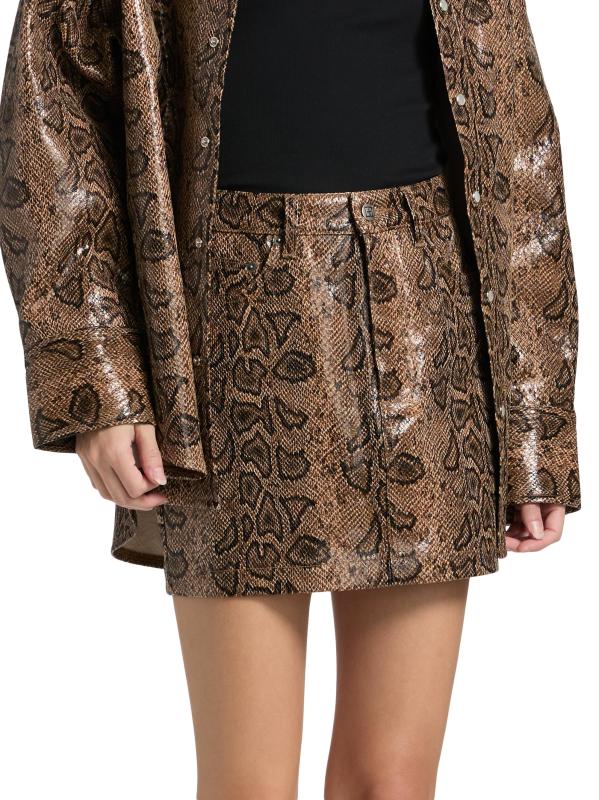 من مجموعة أخطاء العالم الجديد. صُنعت التنورة القصيرة Super X Snakebite من Ksubi من الجلد الصناعي المنقوش على جلد الثعبان. يتميز هذا الطراز بتصميم ضيق بخصر مرتفع.
