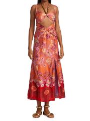 يُظهر هذا الفستان الحريري المتوسط فتحة مميزة عند الصدّار المزين بزخارف نباتية زاهية وشق أمامي عند التنورة.رقبة على شكل قلب مع حزام رسن بدون أكمام ربطة عنق ذاتية عند القفا إغلاق بسحّاب خلفي فيسكوز 100% تنظيف جاف مستوردة