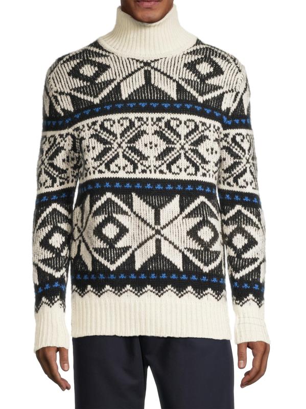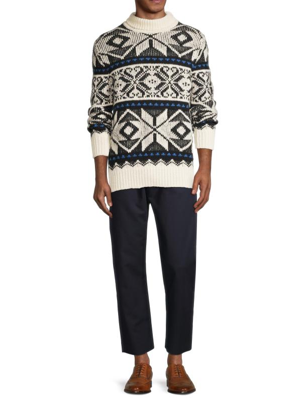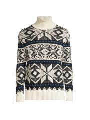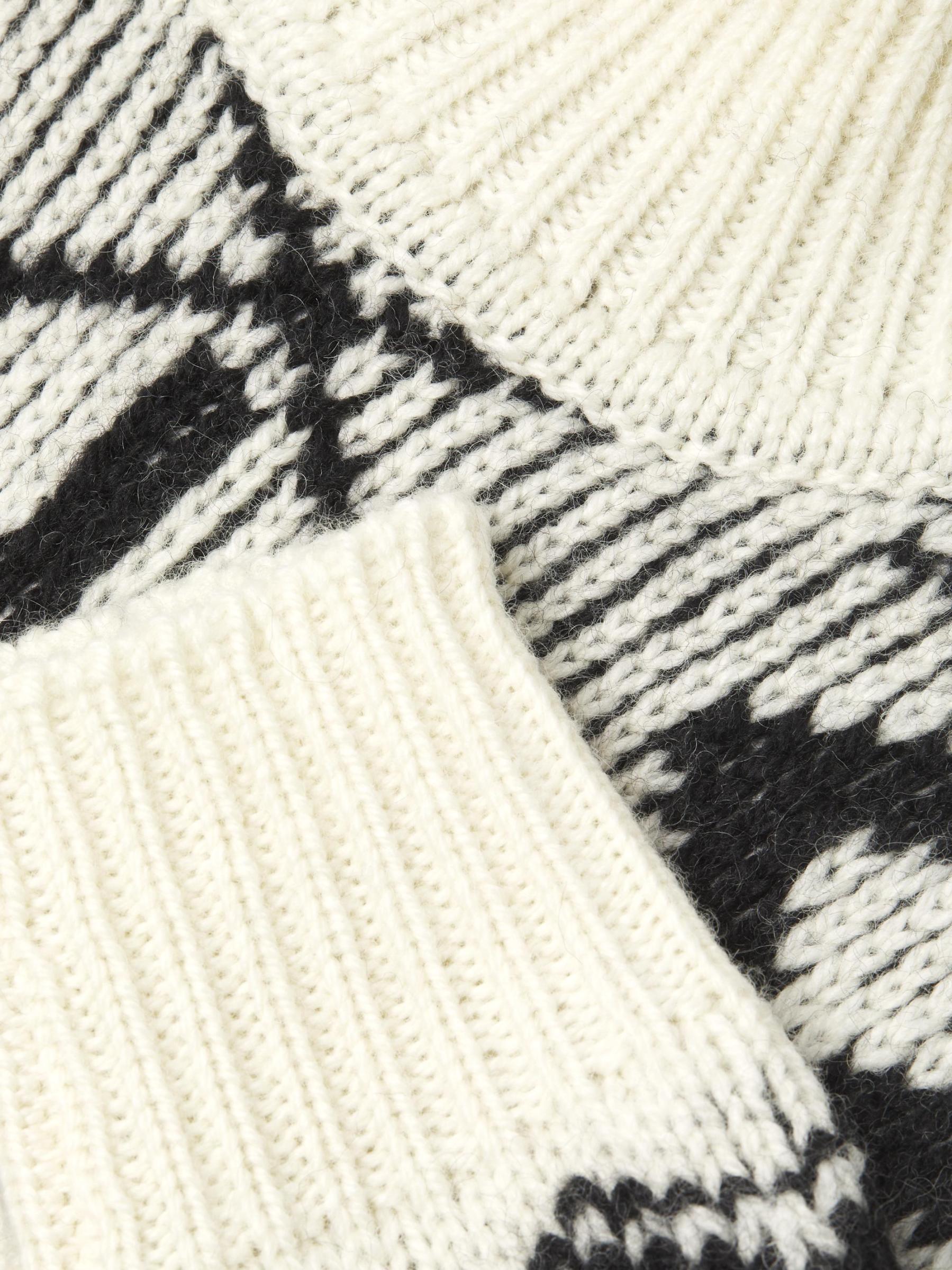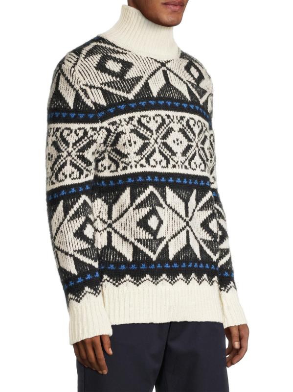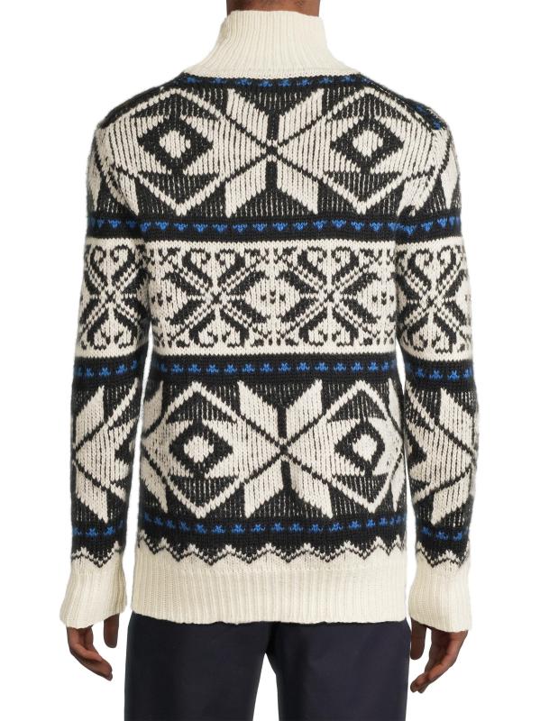 صُنعت هذه السترة ذات الرقبة القصيرة من الصوف النرويجي، وهي محبوكة بنمط شمالي مختلط ومزينة بحزام خصر وأساور محبوكة على شكل أضلاع.