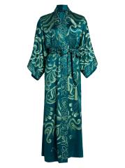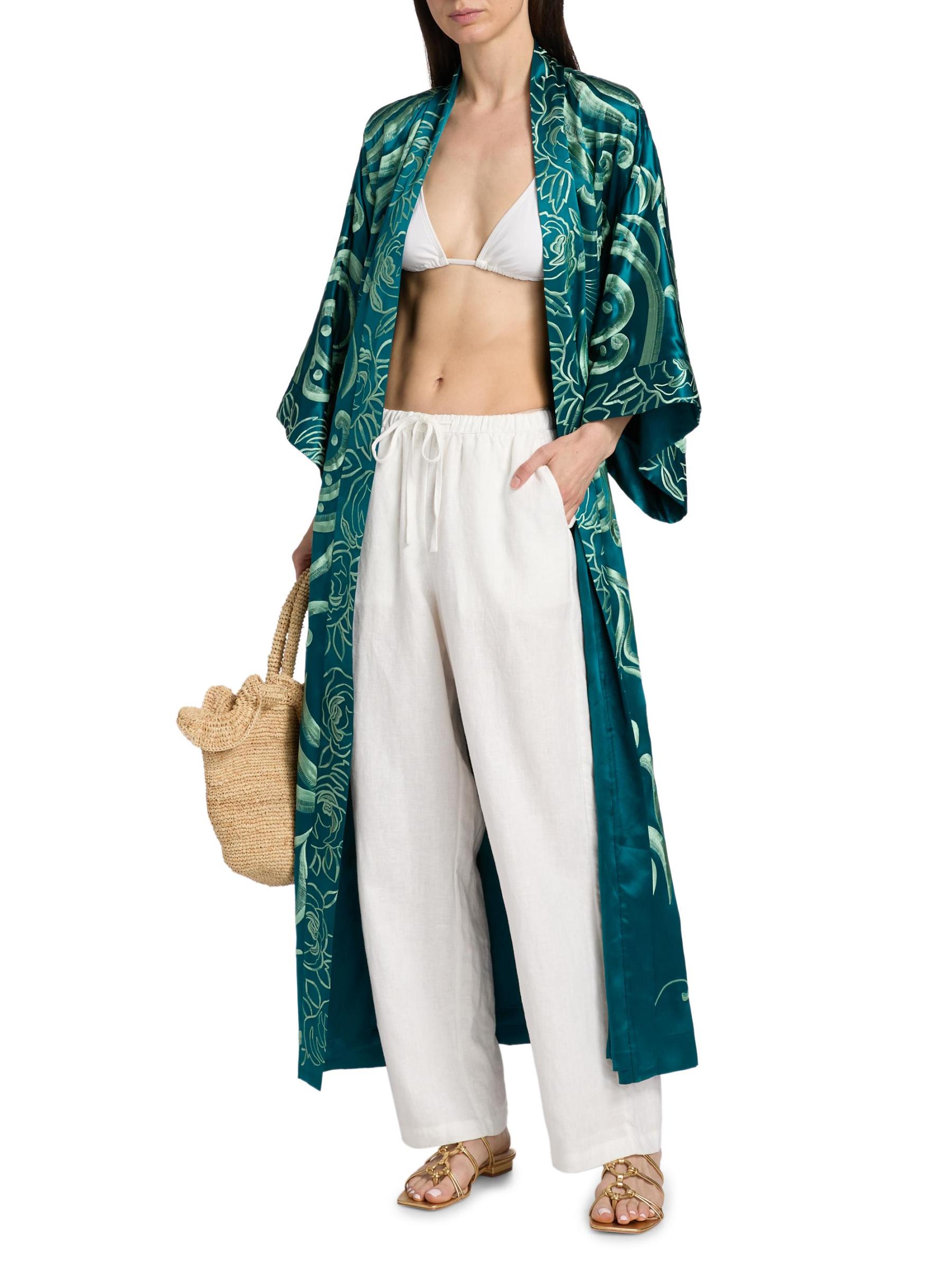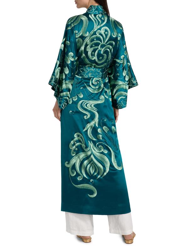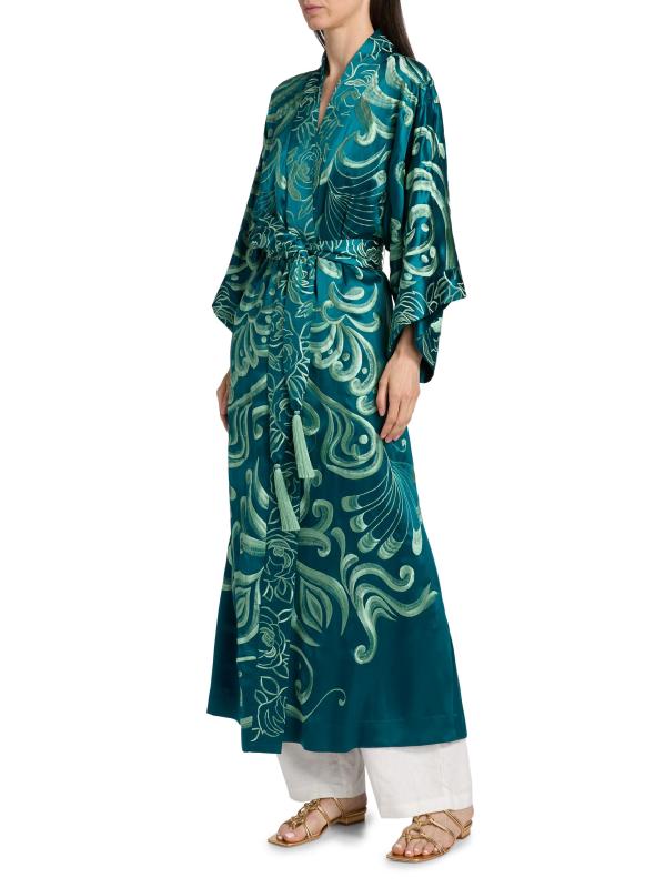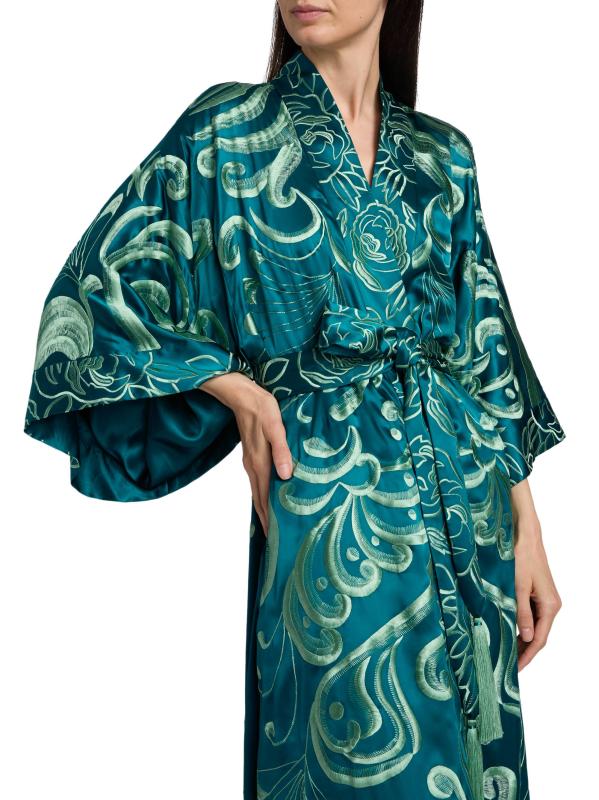 من مجموعة نوفو كوتور. صُمم رداء جوزي ناتوري هذا من الحرير الناعم الفاخر بتطريز معقد. تم تصميم هذا النمط الخالد مع ياقة شال وأكمام مستوحاة من الكيمونو بطول الكوع وحزام قابل للربط الذاتي