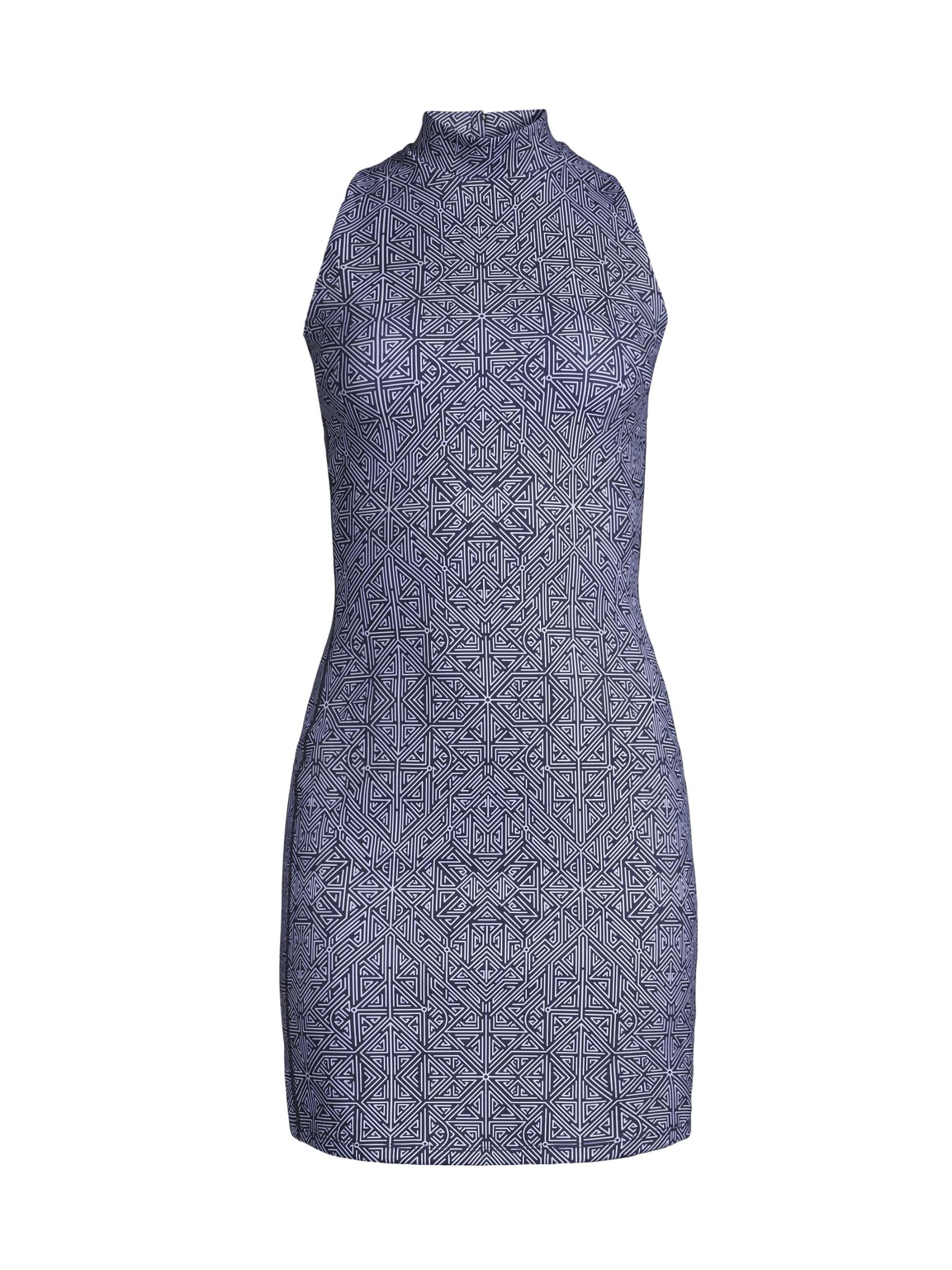 صُنع فستان Nova Labyrinthth من شركة Greyson من نسيج محبوك يمتص الرطوبة بوجهين. يتميز هذا الطراز المريح بياقة مدورة وهمية وحافة قصيرة الطول.