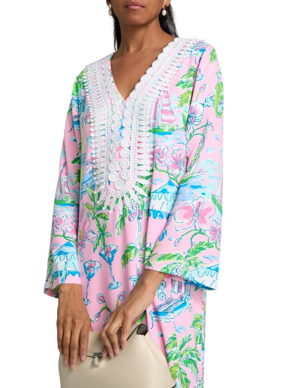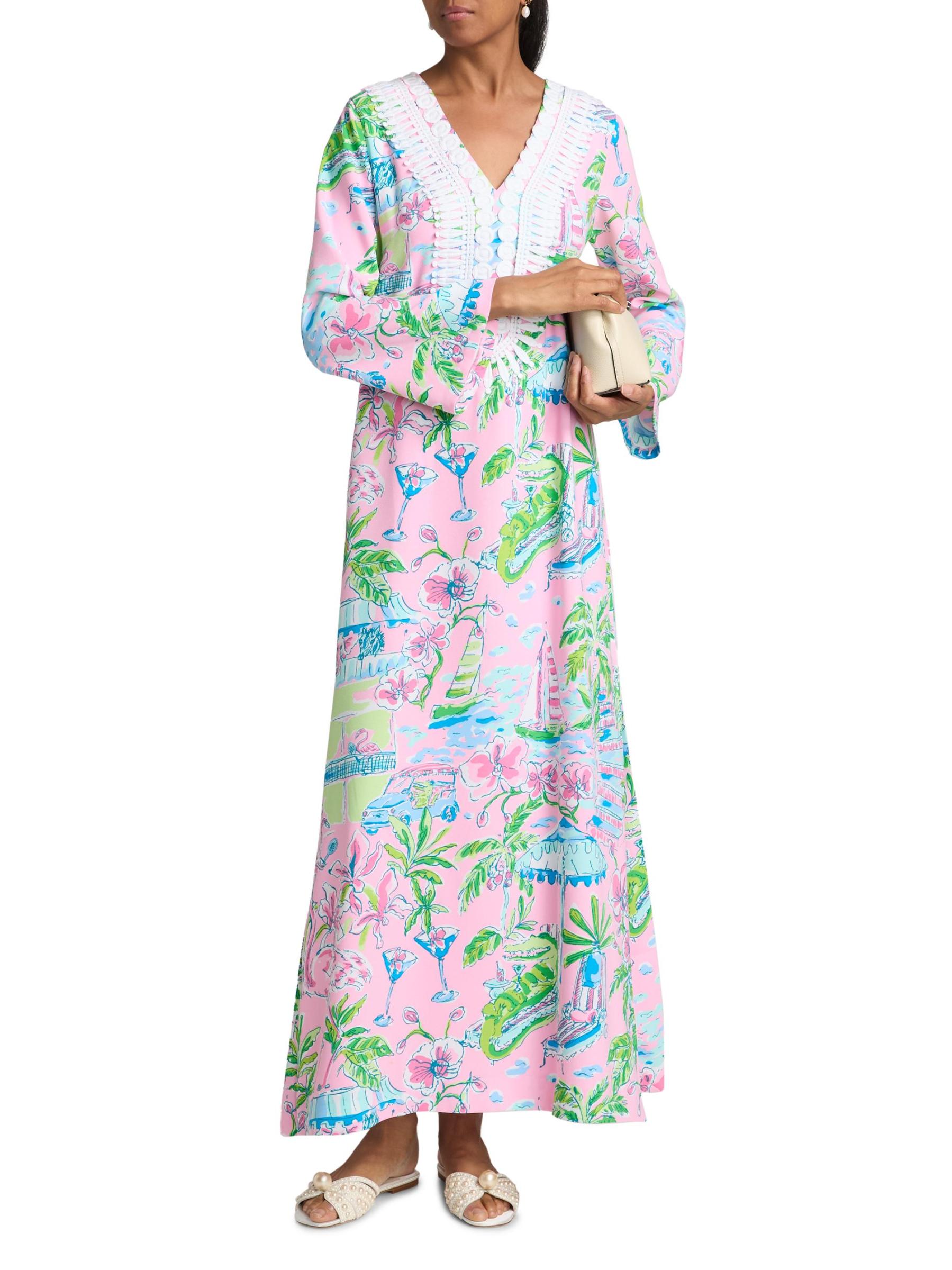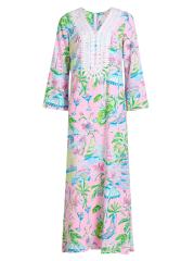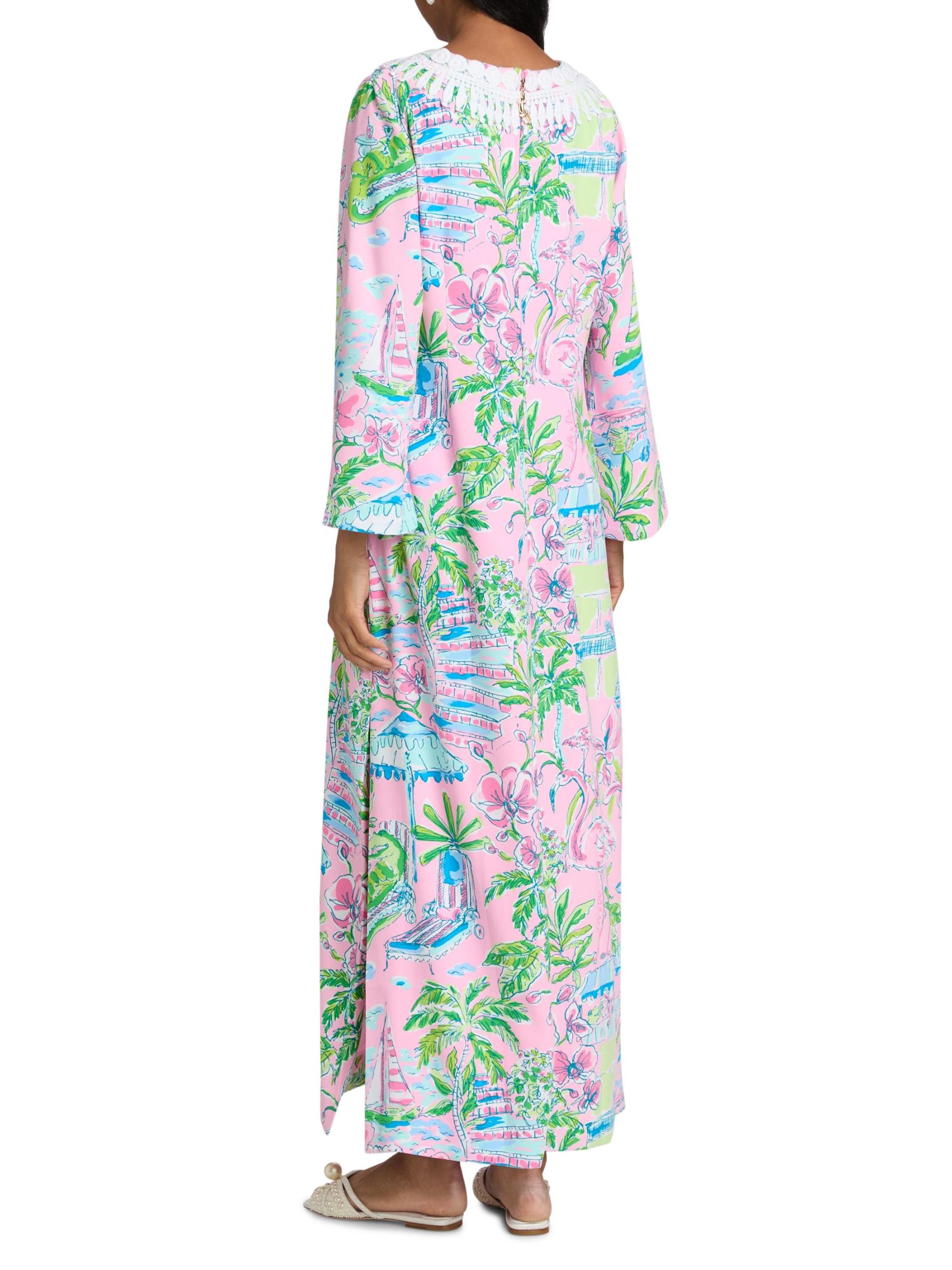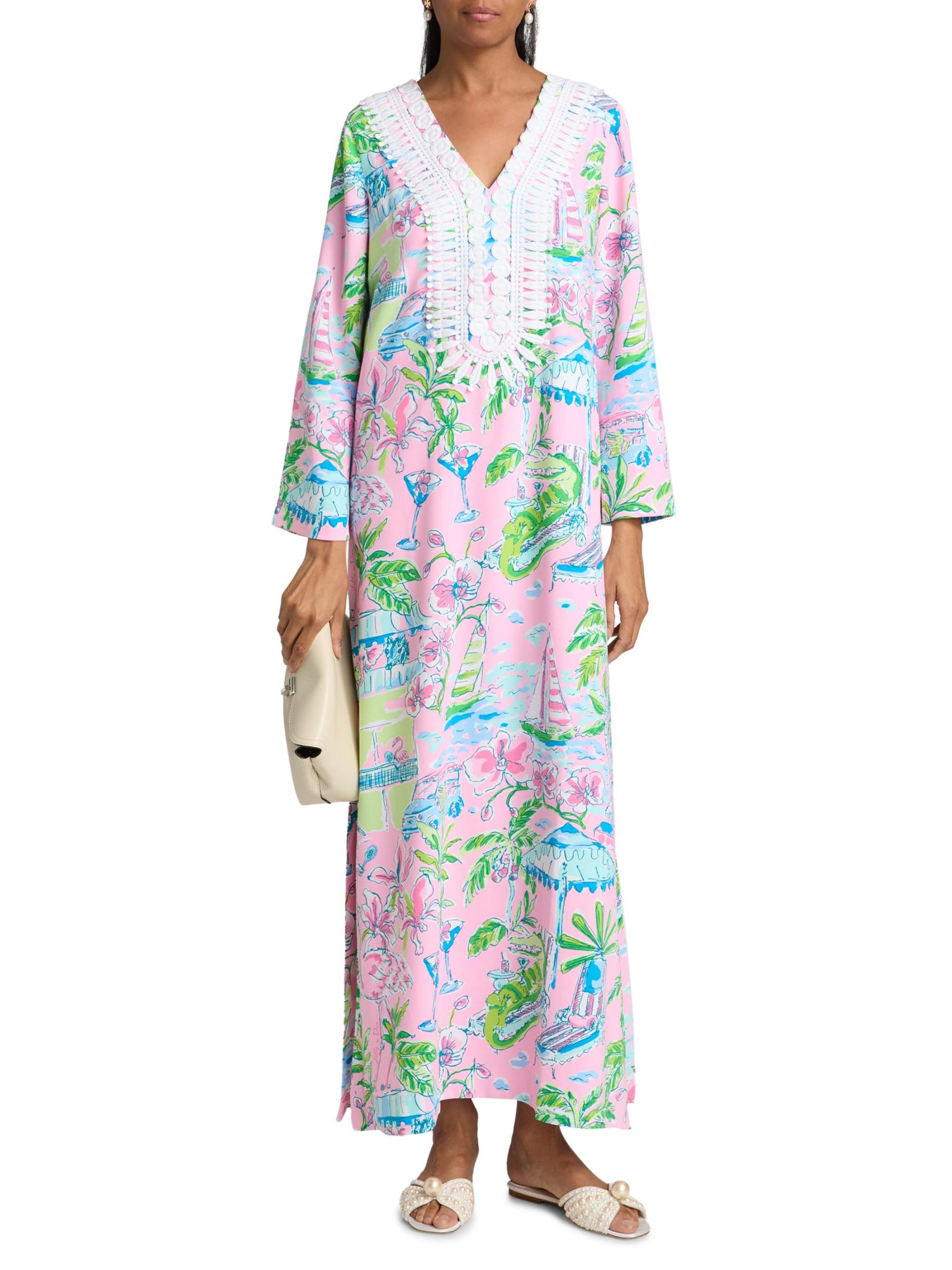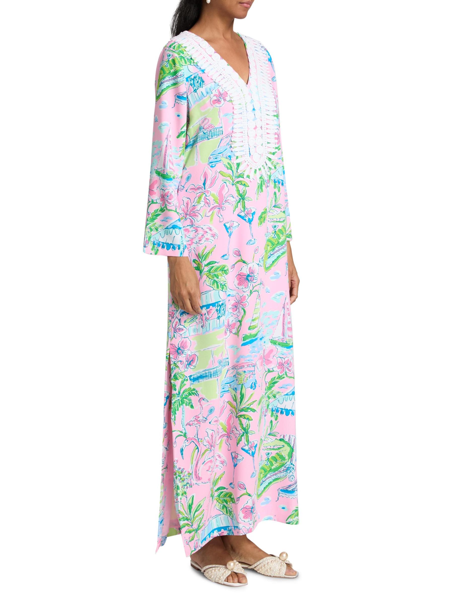 يتميز قفطان Ocleppo maxi من Lilly Pulitzer بنقشة الأزهار الزاهية وتفاصيل الدانتيل المطرزة على طول الرقبة على شكل حرف V والشقوق الجانبية.