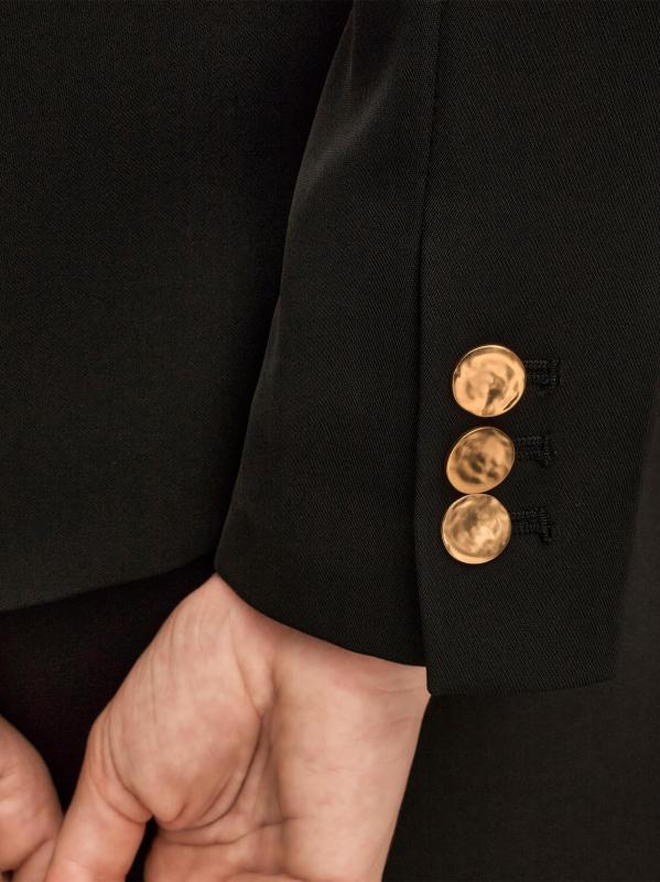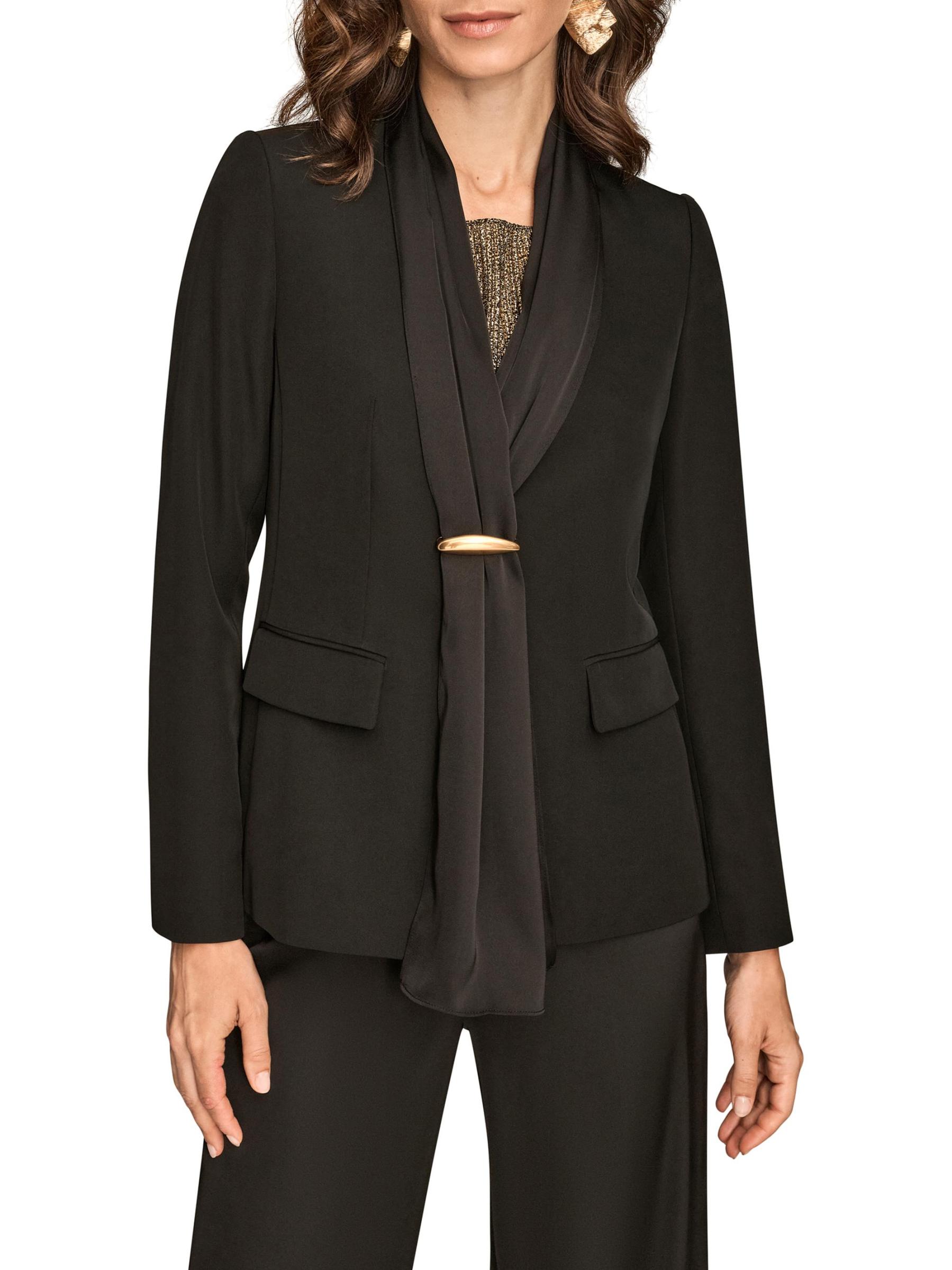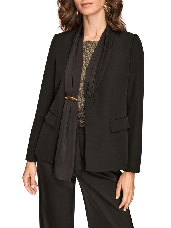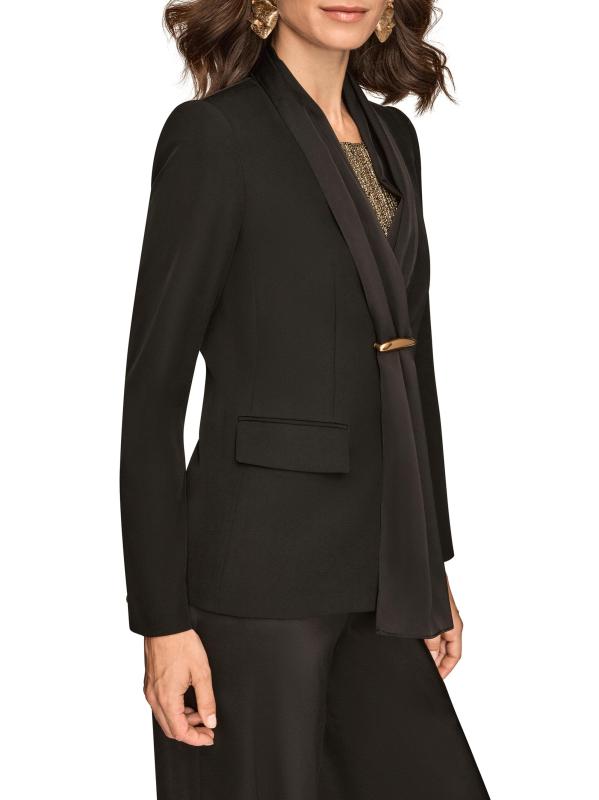 تم تصميم سترة أكتوبر من DKNY برباط ساتان منسدل ومثبت بمشبك معدني عند الصدر.ياقة شال أساور بأزرار بأكمام طويلة جيوب قابلة للطي إغلاق بزر واحد 96% بوليستر/ 4% إليستين البطانة: 95% بوليستر/ 5% سباندكس تنظيف جاف مستوردة