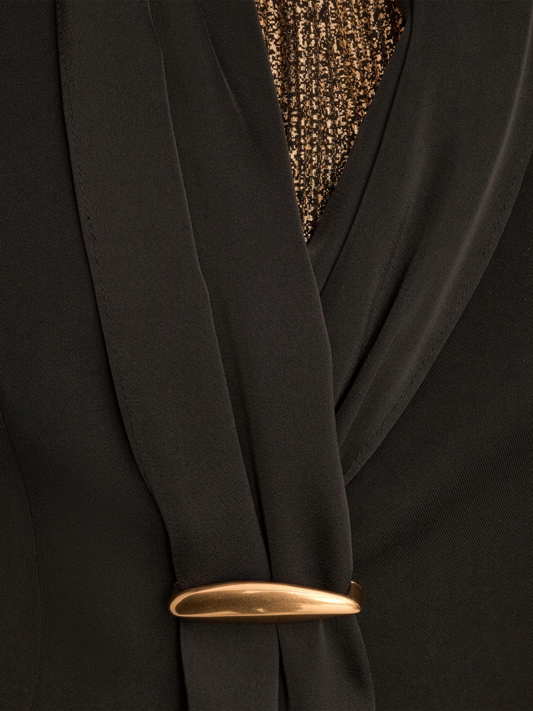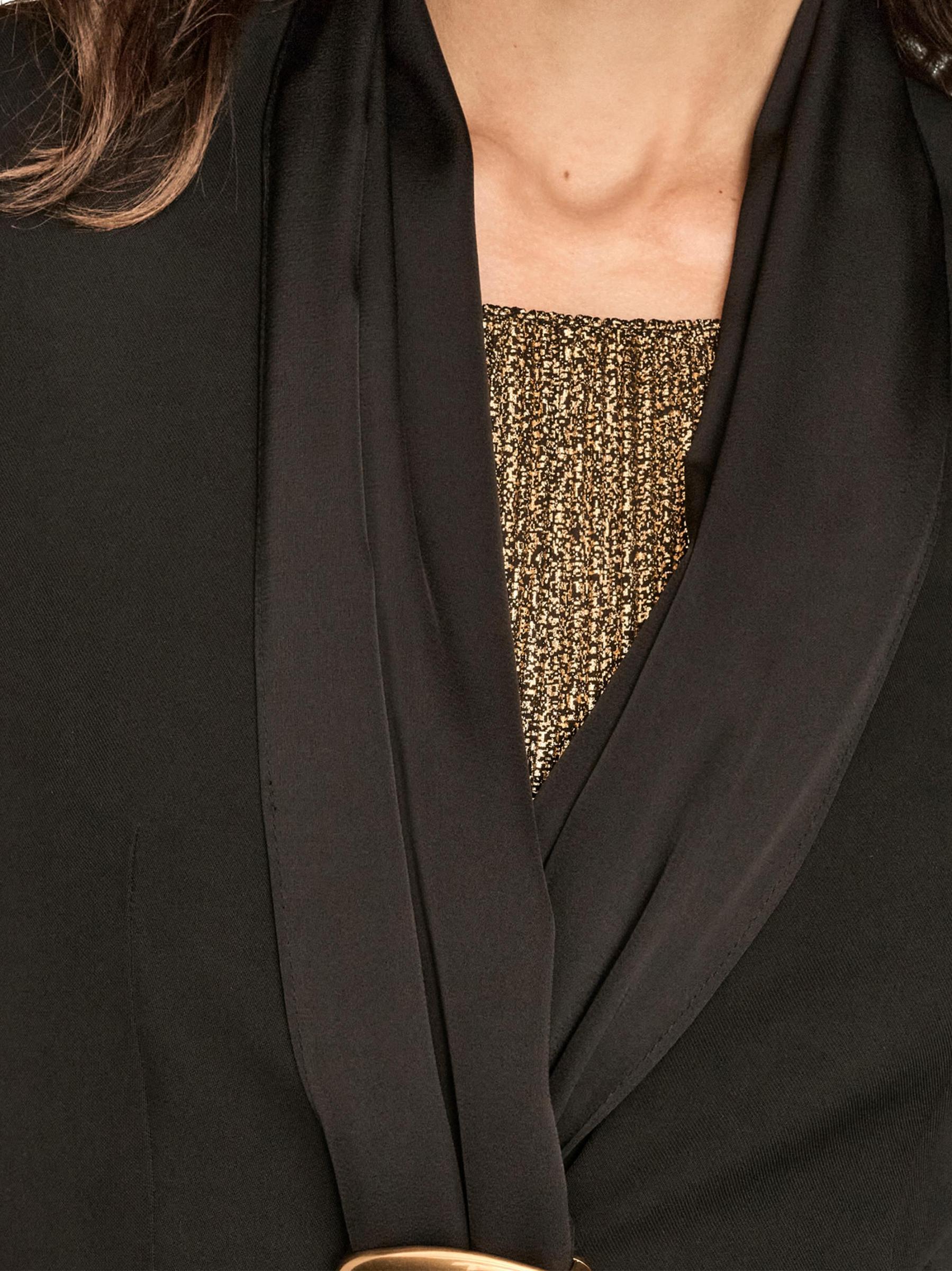 تم تصميم سترة أكتوبر من DKNY برباط ساتان منسدل ومثبت بمشبك معدني عند الصدر.