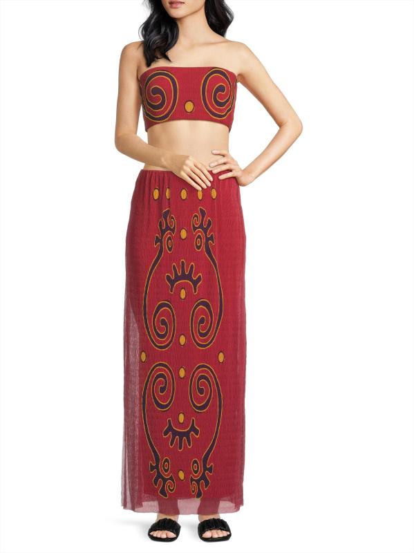 تتميز بلوزة أوديسا من Cala de la Cruz برقبة بدون حمالات وطباعة تجريدية جريئة.