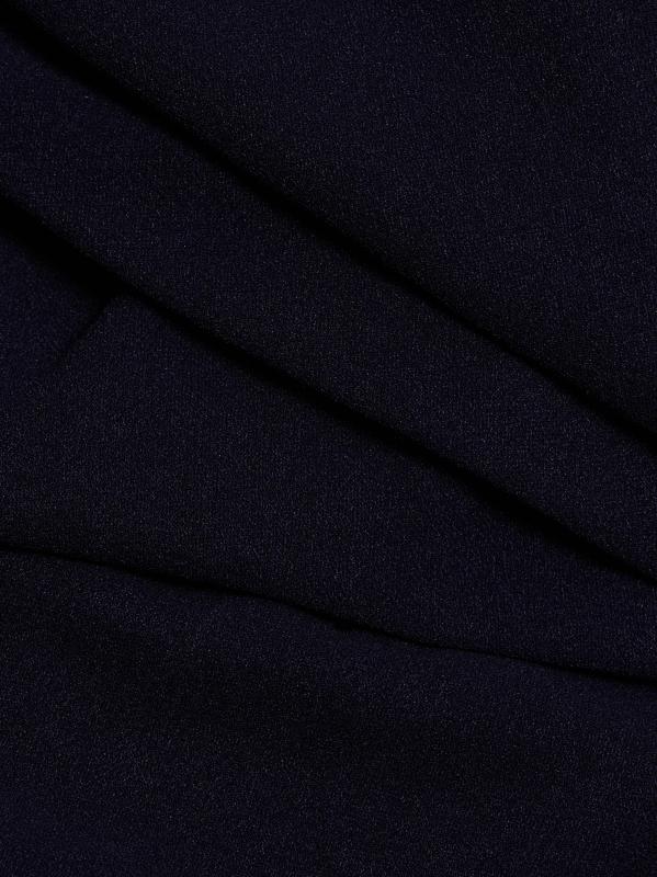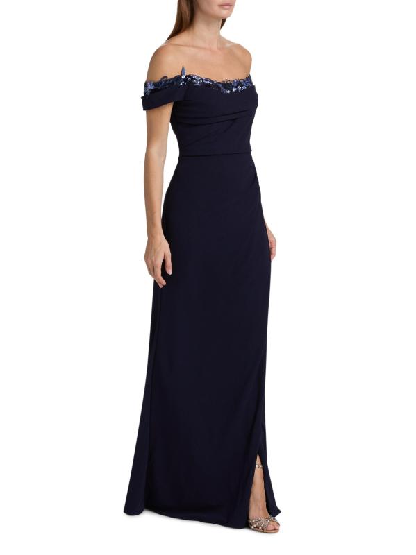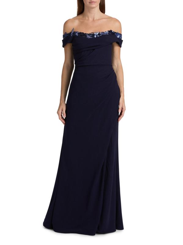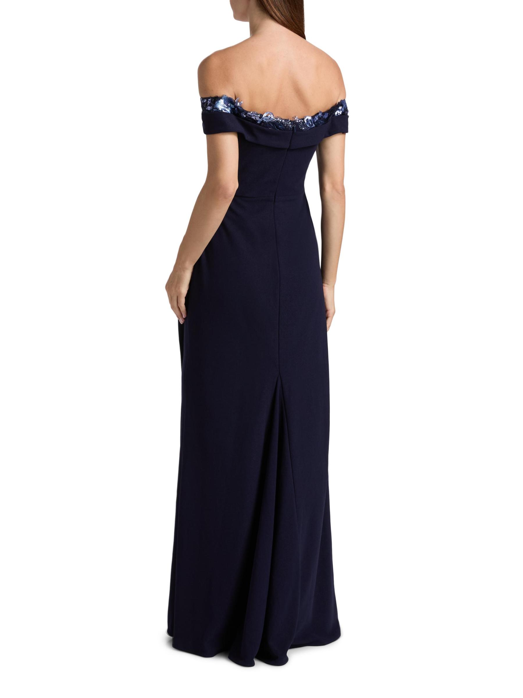 صُنع هذا الفستان من مجموعة Rene Ruiz من الكريب بتصميم مناسب ومتوهج ومزيّن بتطريزات مطرزة بالترتر.