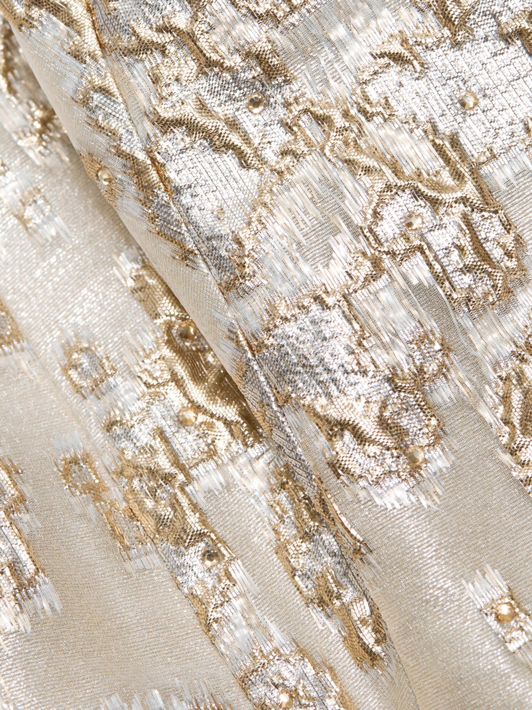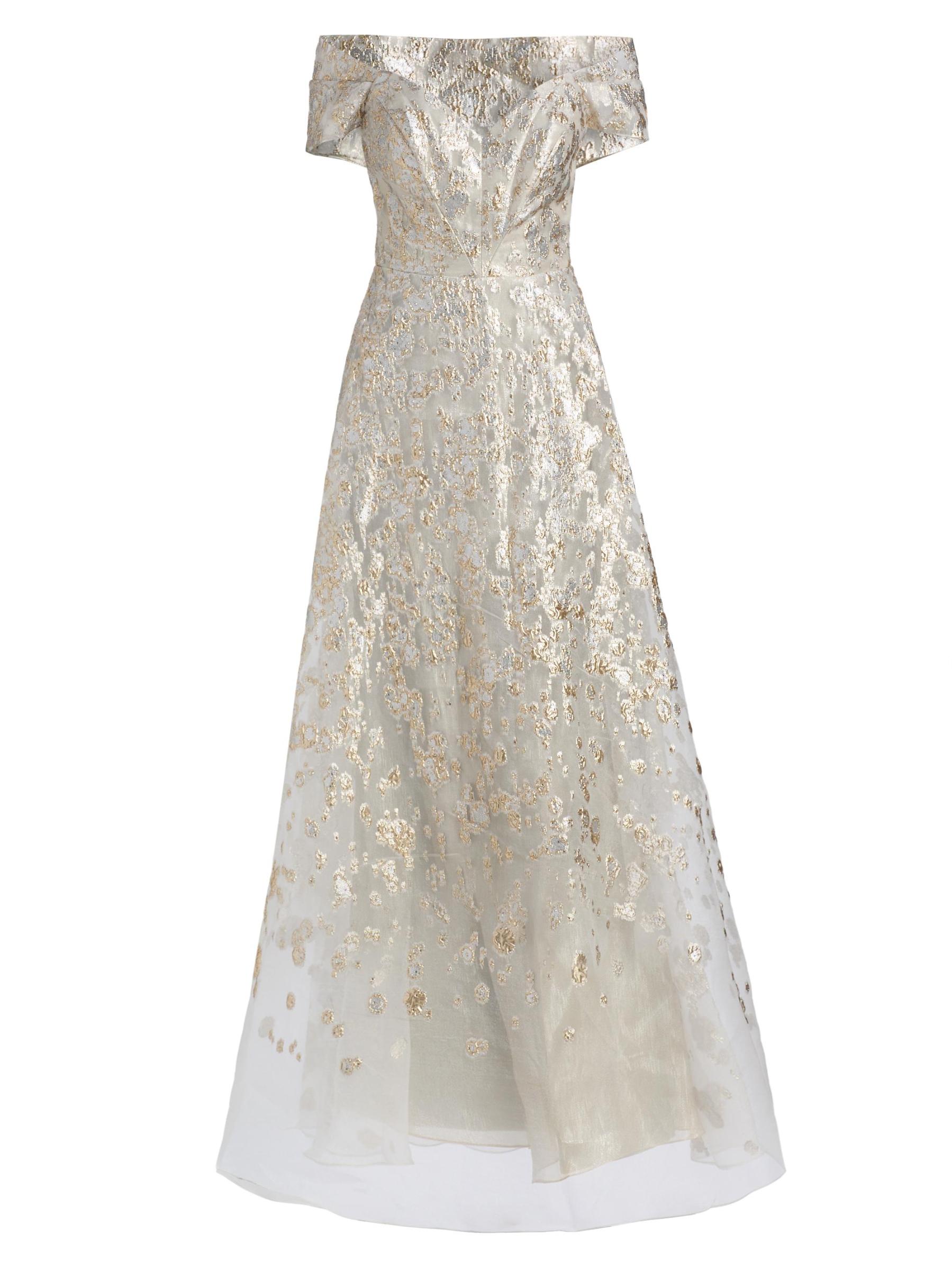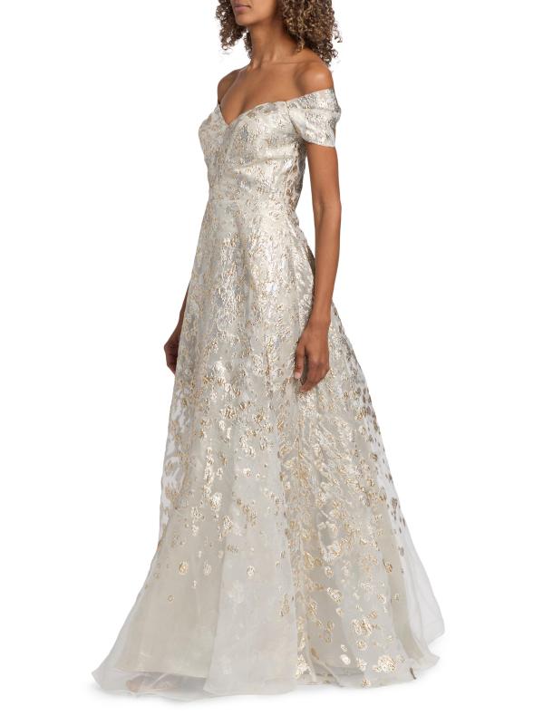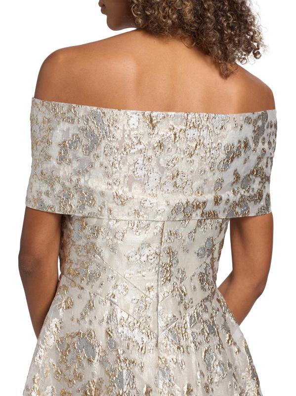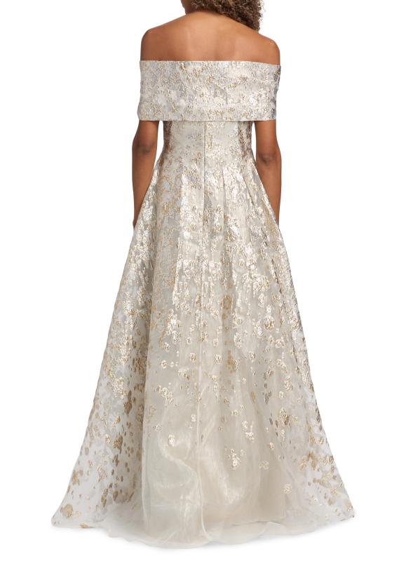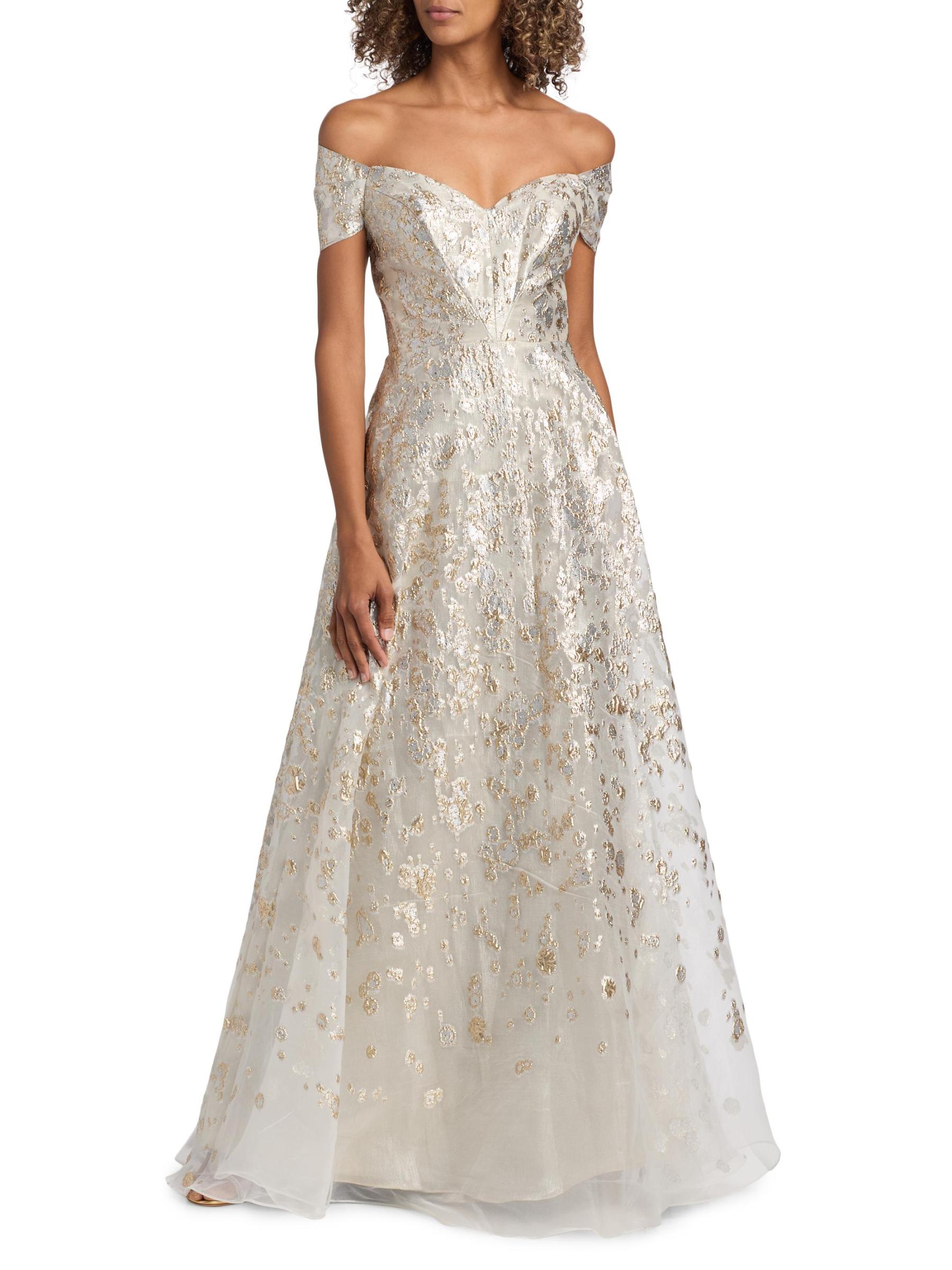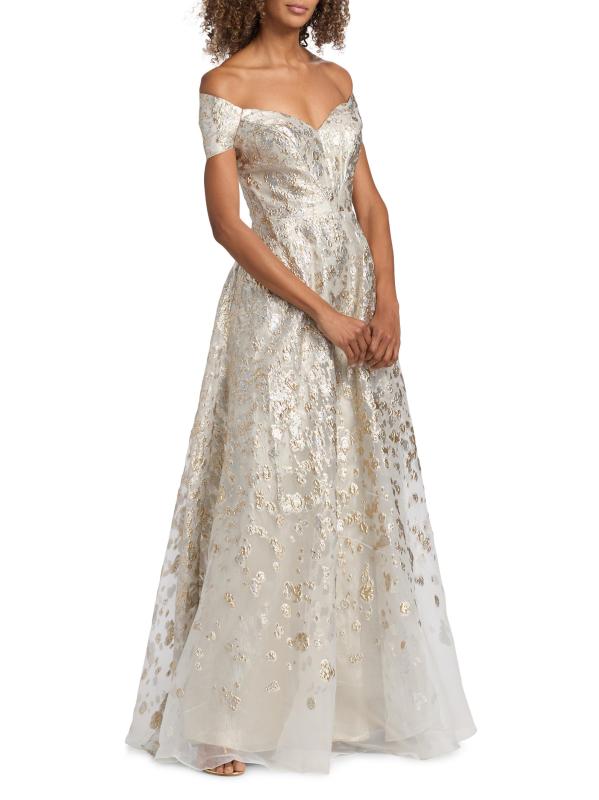 يتميز فستان الحفلة هذا ذو الشكل الهرمي من مجموعة Rene Ruiz بتقويرة مكشوفة الكتفين وتطريز معدني لامع.