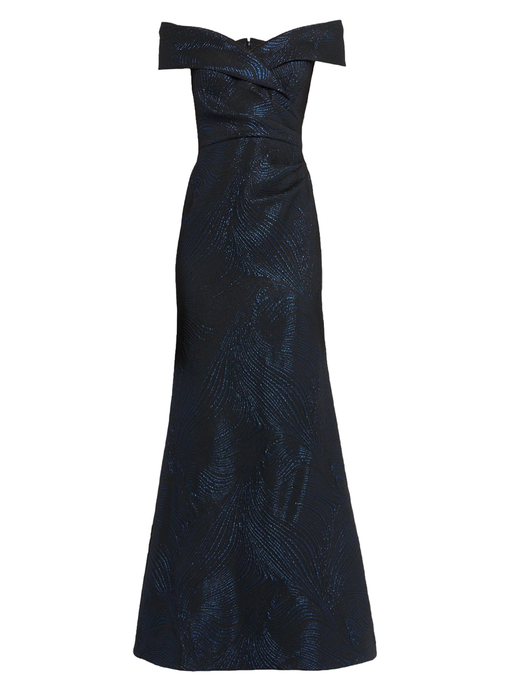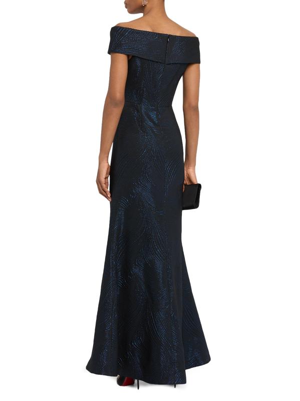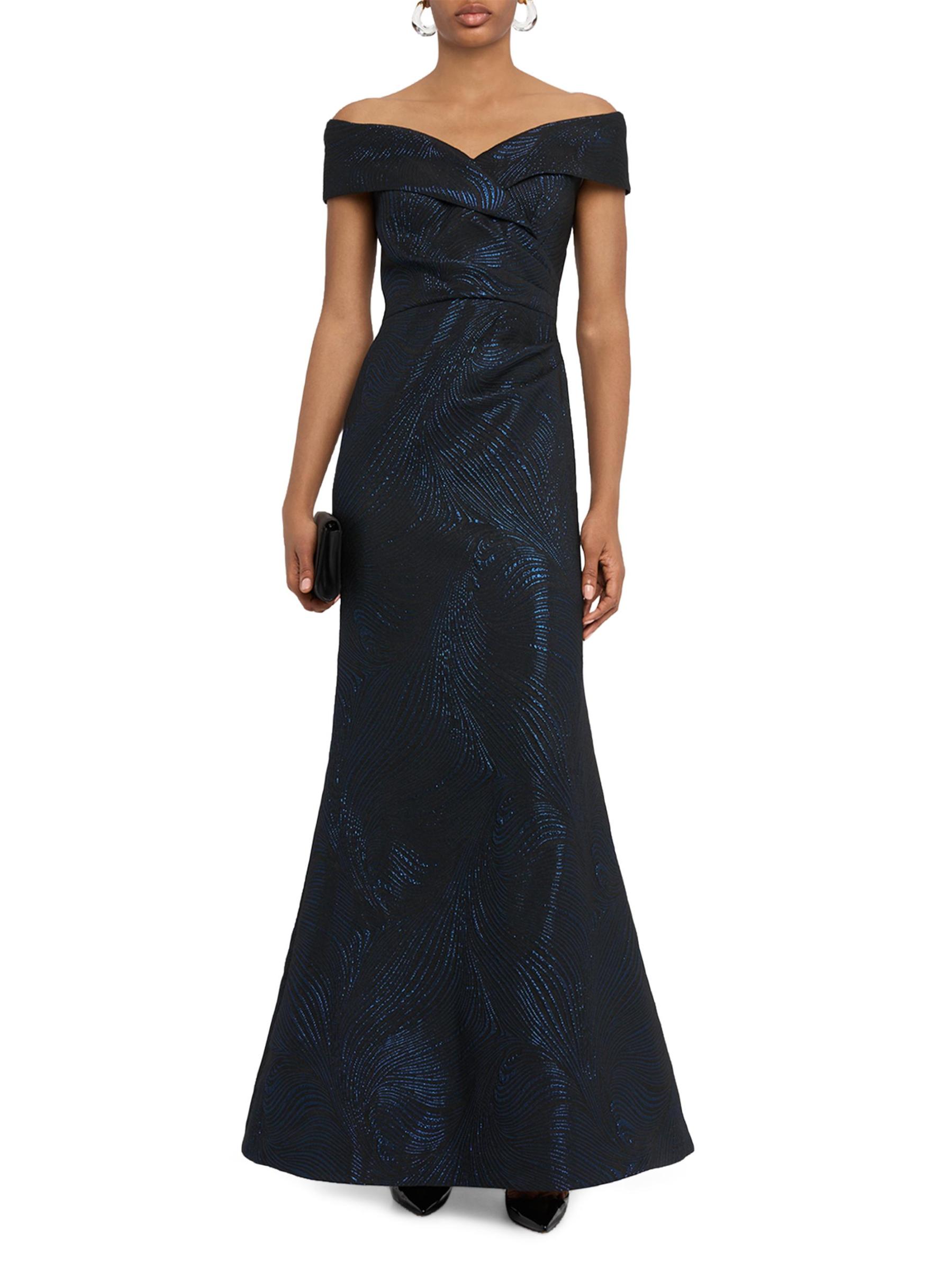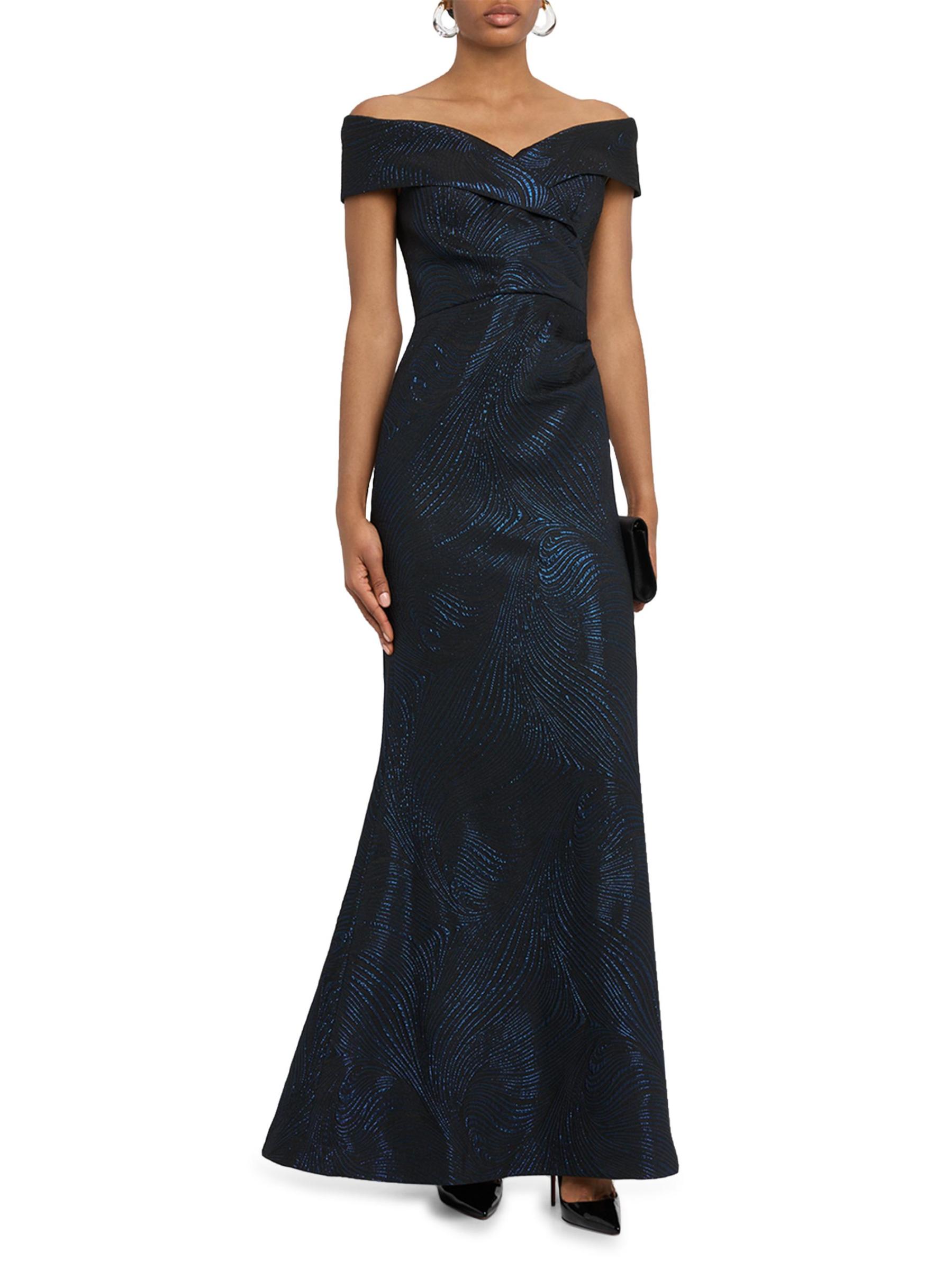صُمم هذا الفستان من Teri Jon من Rickie Freeman ليكون بمثابة بوق، ويتميز بالجاكار المعدني بنقشة متموجة. يمتد خط العنق على شكل قلب إلى أكمام قصيرة على الكتف لإضفاء جاذبية رومانسية.