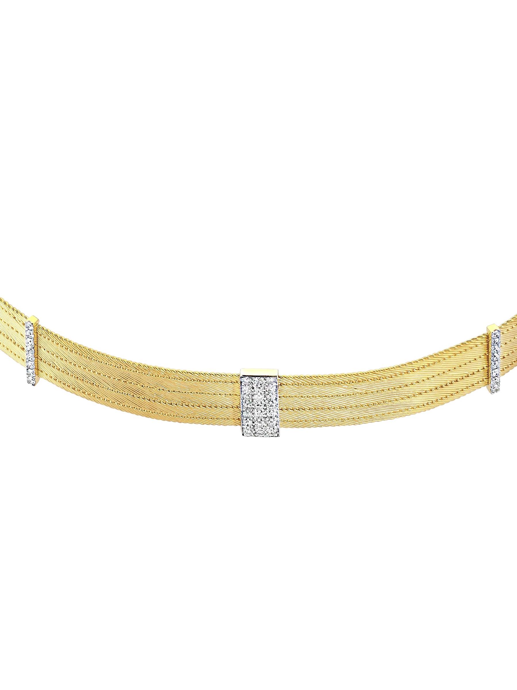 من مجموعة Olden. قلادة Her Story منسوجة يدويًا من الذهب الأصفر المصقول عيار 14 قيراطًا، وهي مزينة بقضبان أنيقة مرصعة بالألماس.