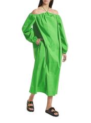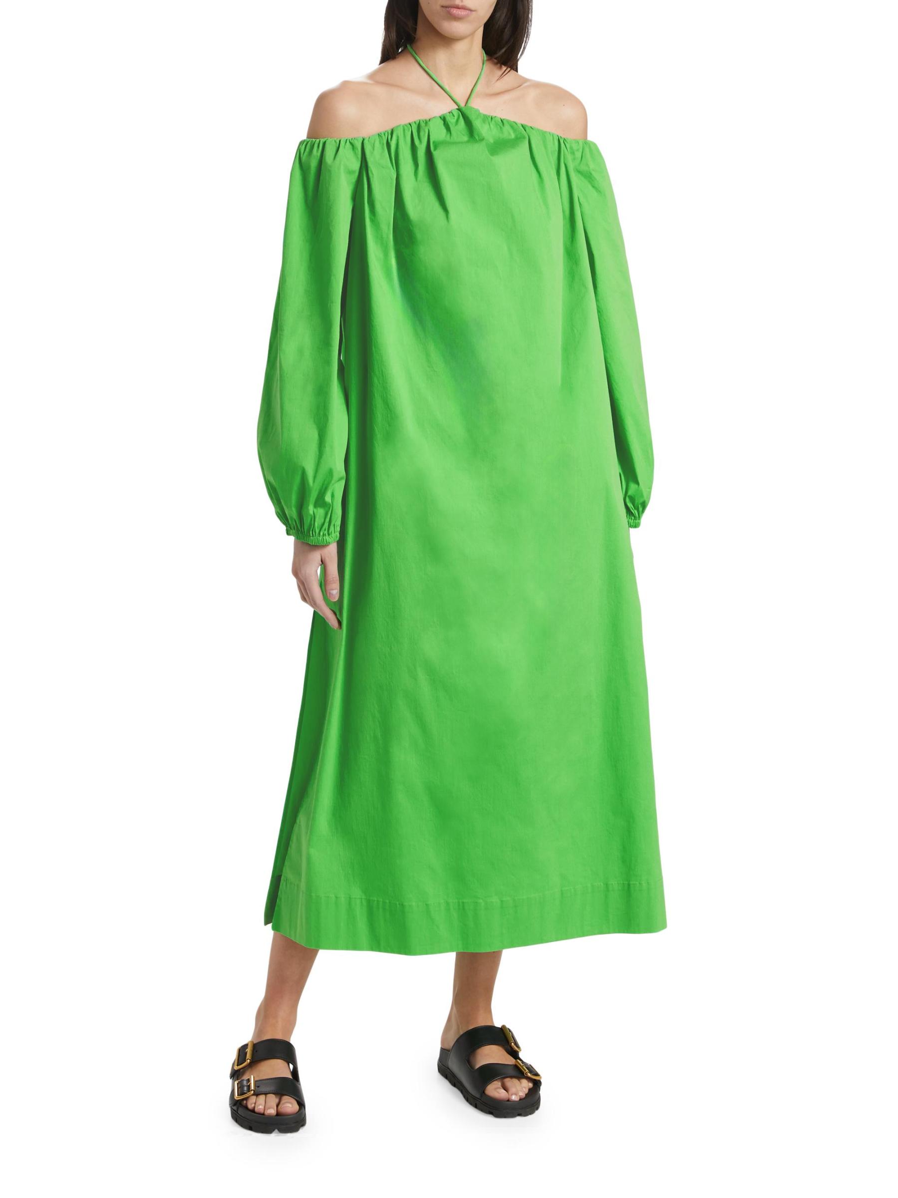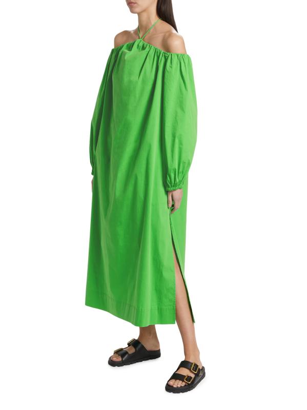 يتميز فستان Oleander من Simon Miller المصنوع من مزيج القطن والبوبلين برقبة رسن وأكمام مكشوفة الكتفين.