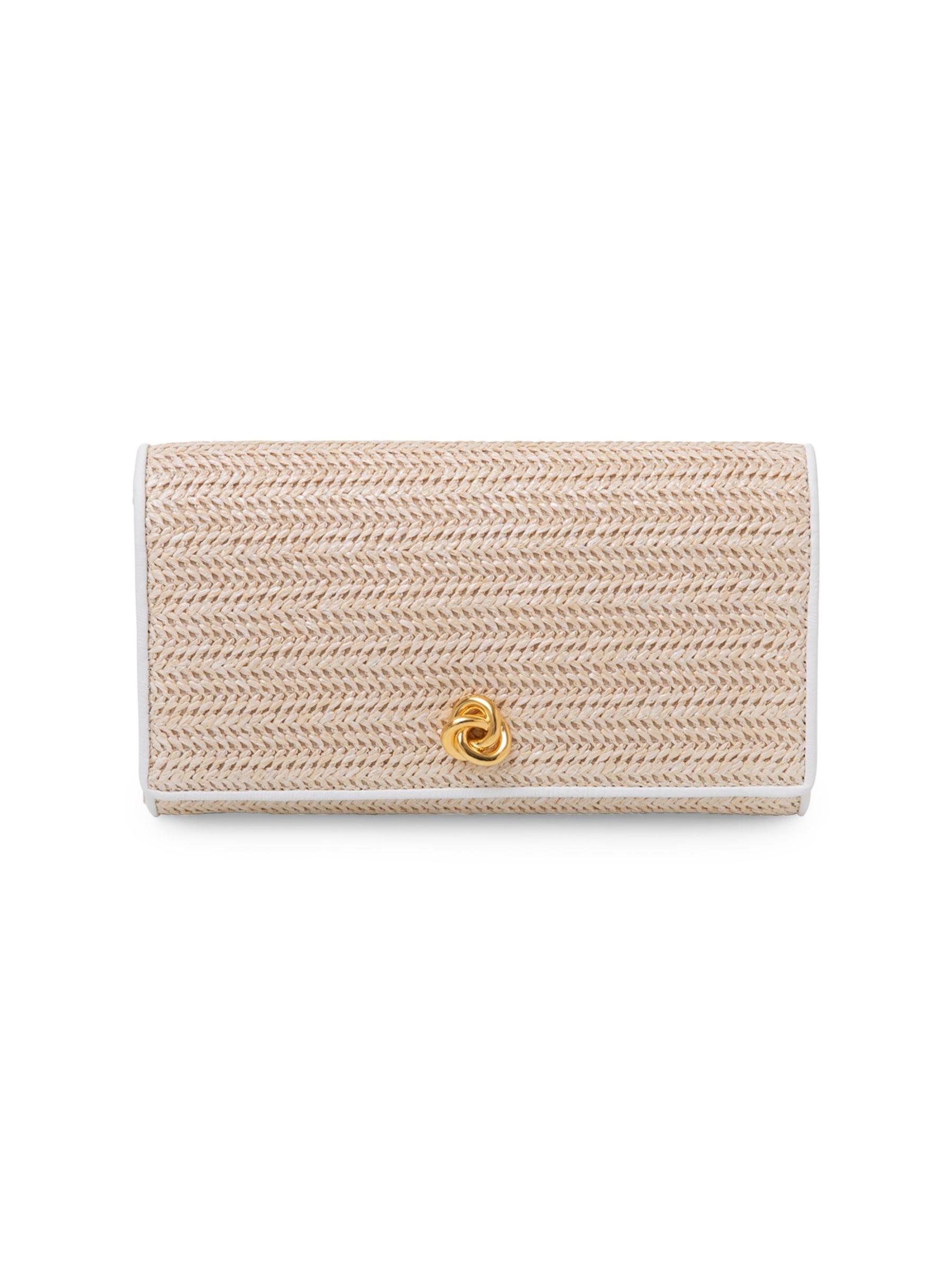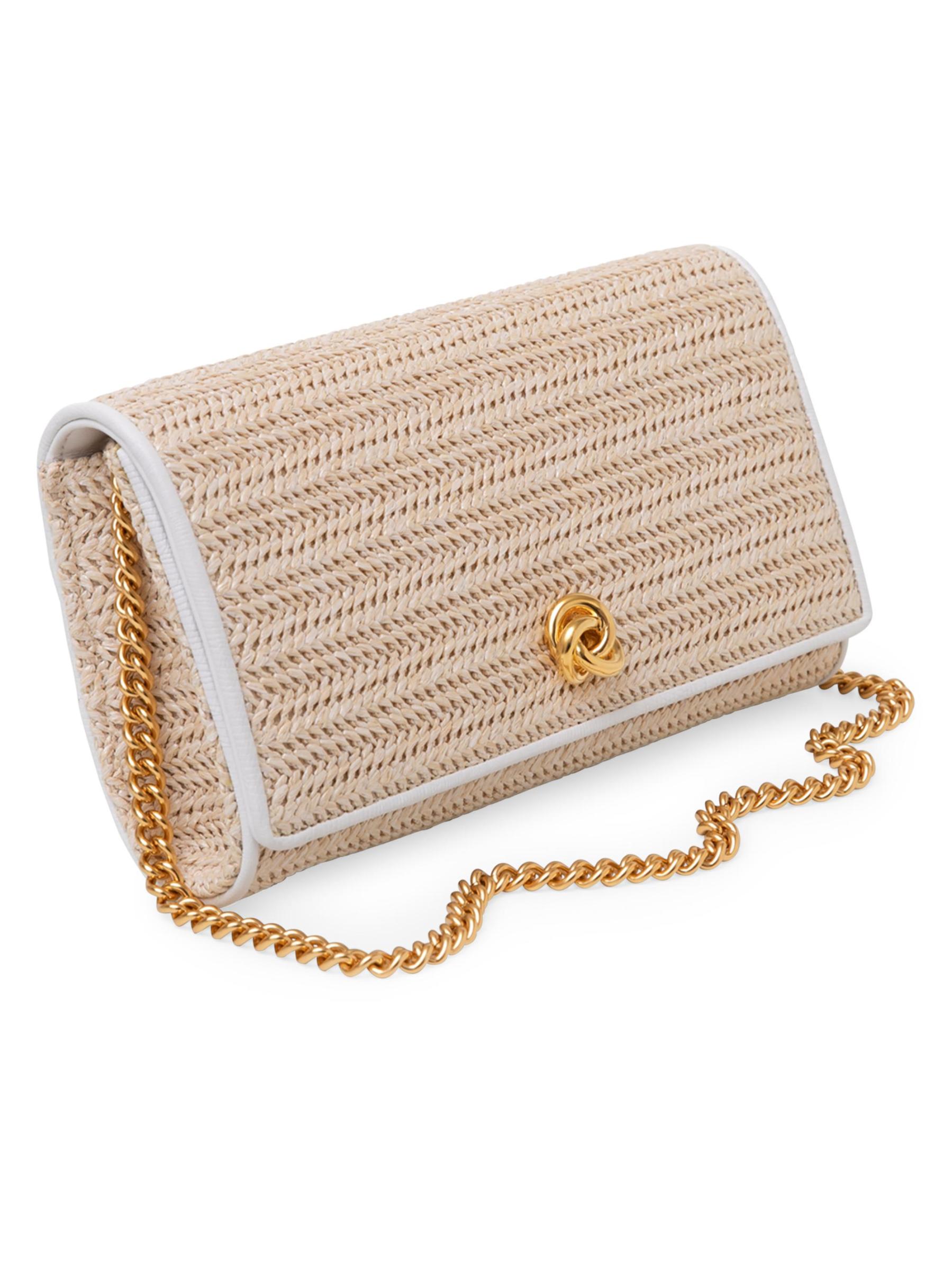 تم تصميم حقيبة Olivia من Michelle Wilhite بلمسة نهائية منسوجة. يتميز الطراز الصغير بتصميم قابل للتحويل مع حزام سلسلة باللون الذهبي وأجزاء صلبة معقودة.