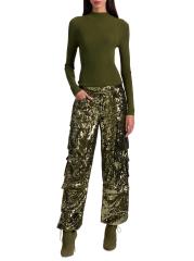 صُمم بنطال Olympia Cargo من Alice + Olivia بمقاس فضفاض وتصميم متوسط الارتفاع، حيث تم تصميمه بالترتر اللامع. تتميز هذه القطعة بجيوب متعددة بغطاء ومرقع وحزام خصر وخطاف للإغلاق.