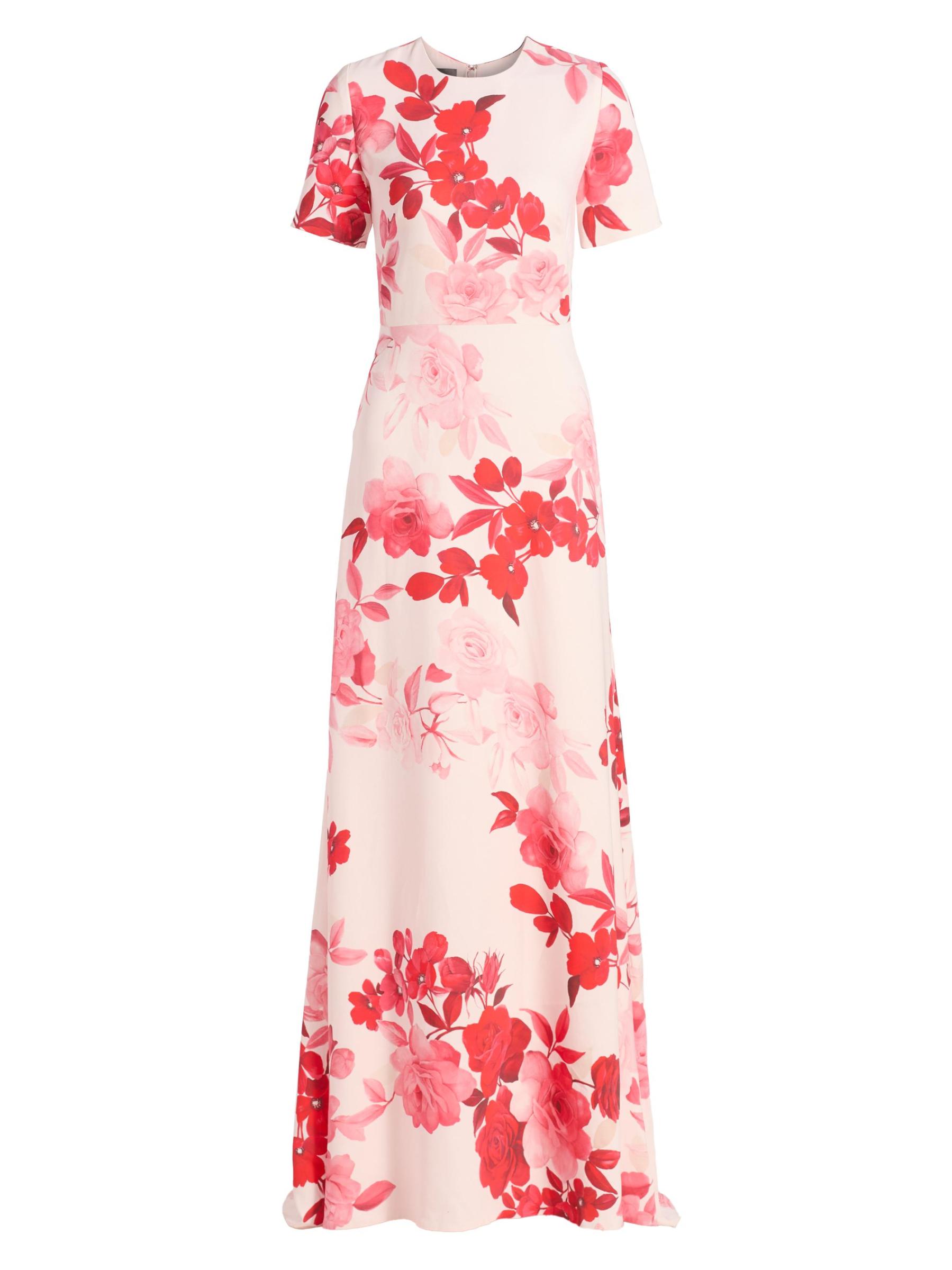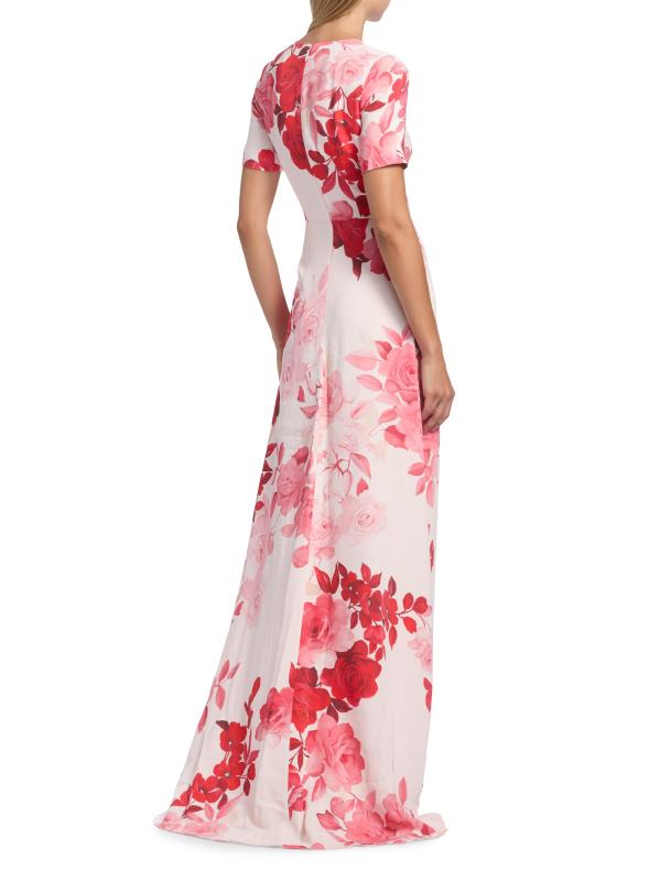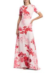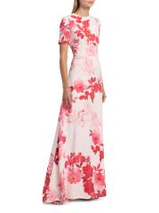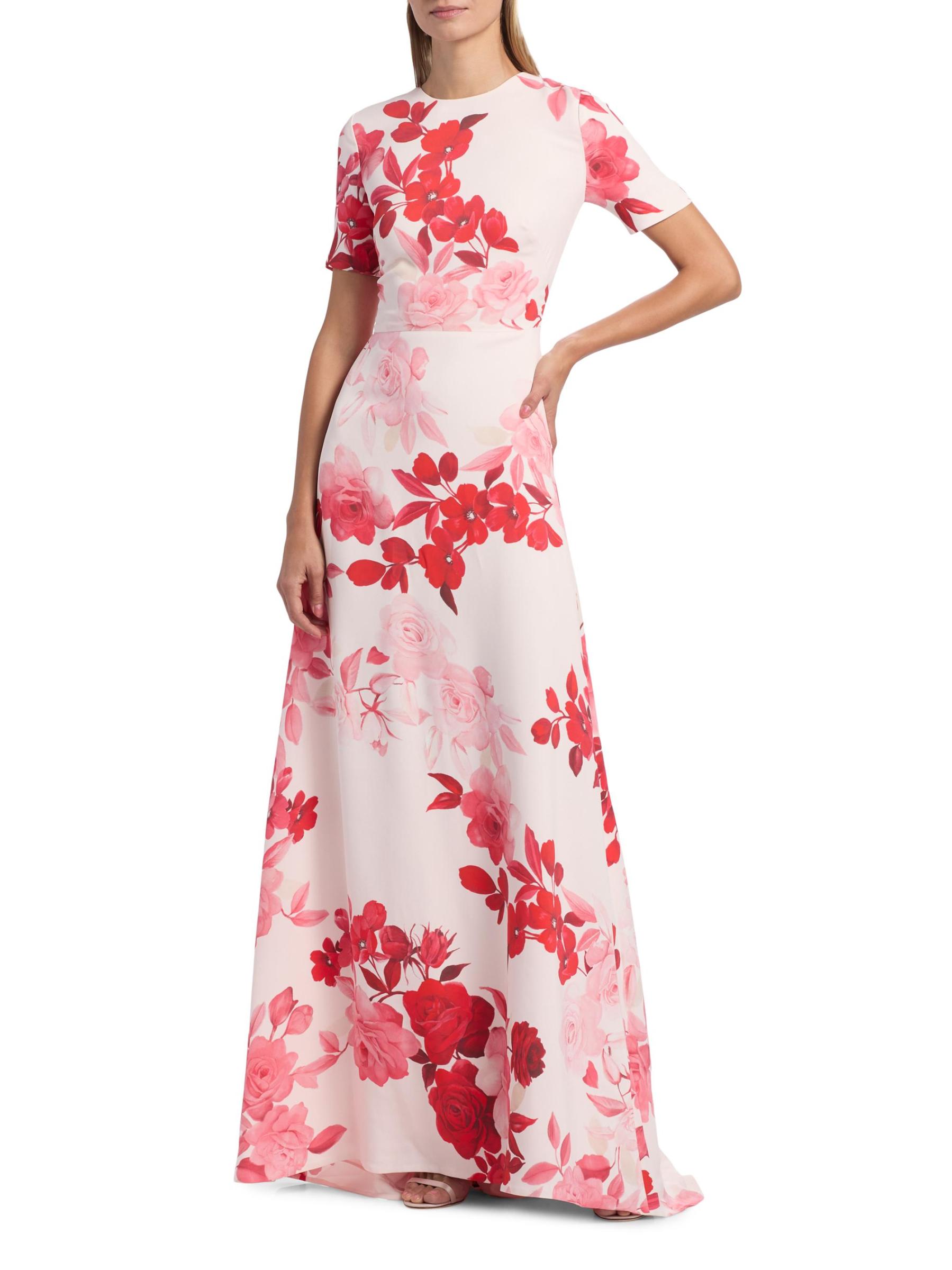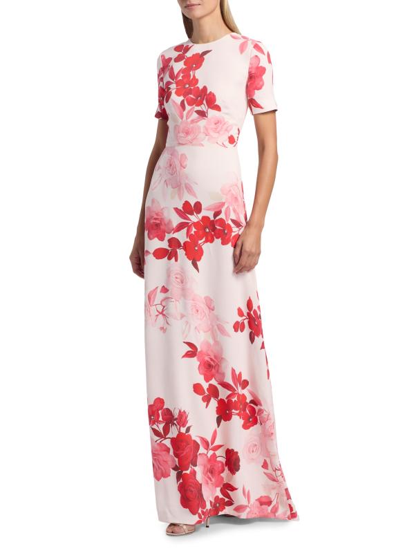 يتميز فستان Monique Lhuillier المصمم على شكل حرف A والمصنوع من الكريب بزخارف أومبري الزهرية وياقة مستديرة وأكمام قصيرة.
