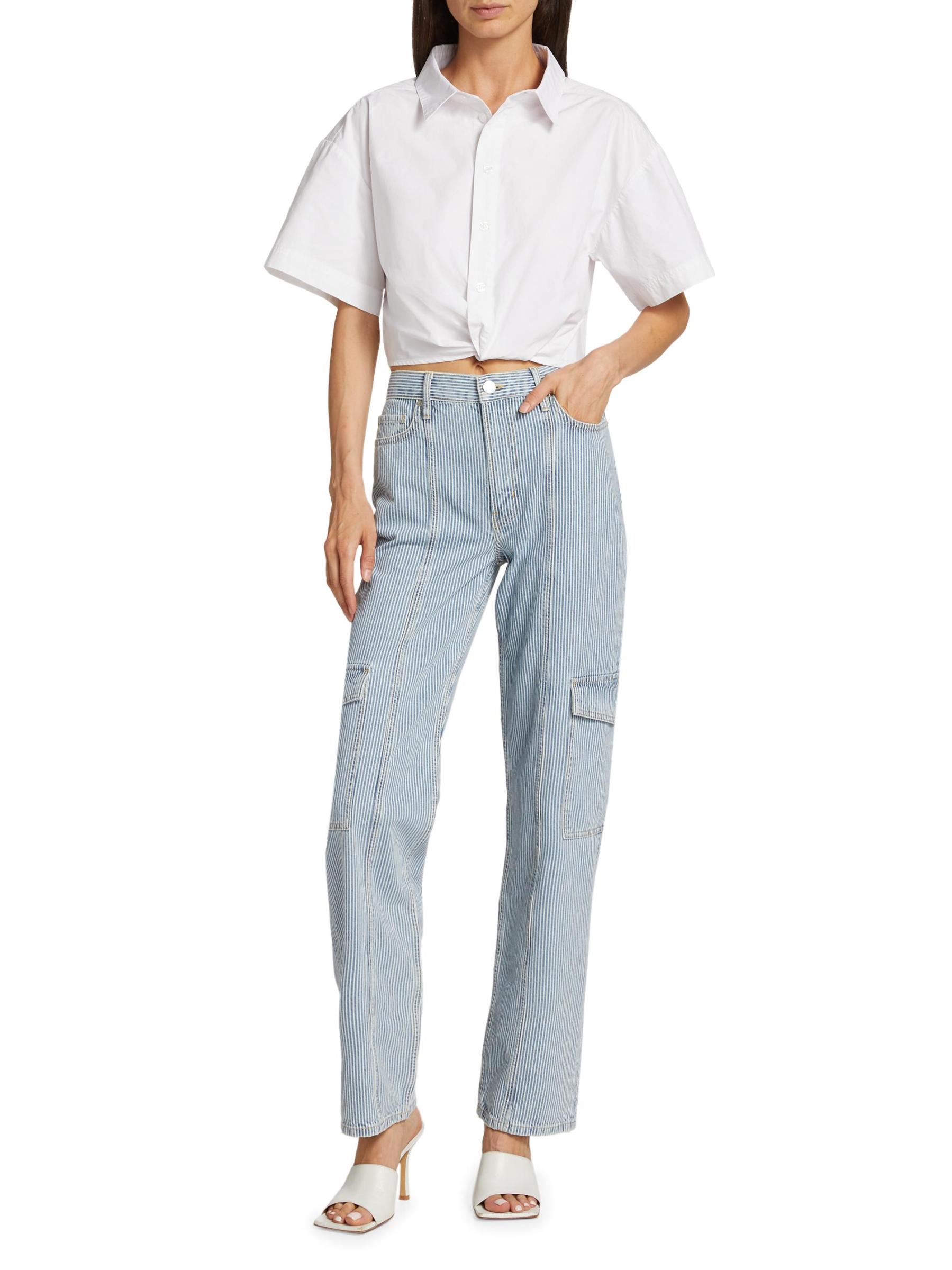 من مجموعة أون ذا ووتر. يتميز بنطال ديانا العملي ذو الساق المستقيمة من Ena Pelly، المصنوع من الدنيم الصلب، ببنية ذات سبعة جيوب، وشعار خلفي مزين بشعار الماركة، وطباعة مخططة مصبوغة بالخيوط.حلقات الحزام طراز بخمسة جيوب جيوب كارجو جانبية سحّاب أمامي مع زر للإغلاق قطن بنسبة 100% يُغسل في الغسالة مستوردة