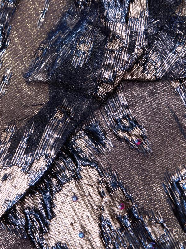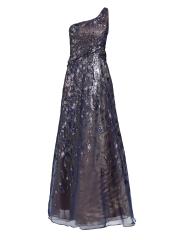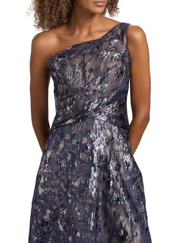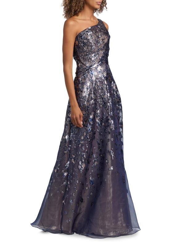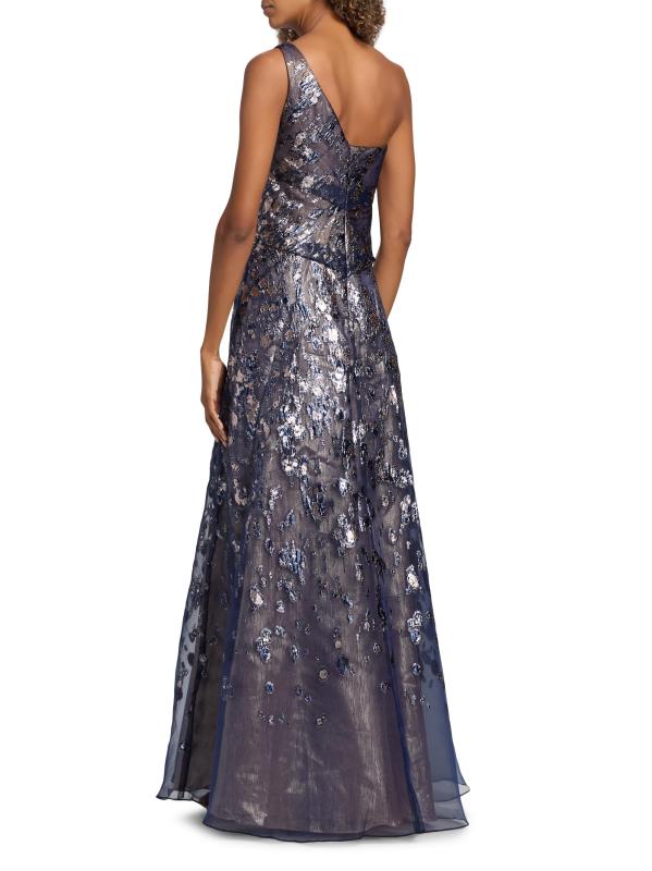 صُمم هذا الفستان بكتف واحد بتصميم مطرز باللون الأزرق المعدني، وهو مصمم بشكل هرمي بطول الأرض.