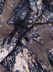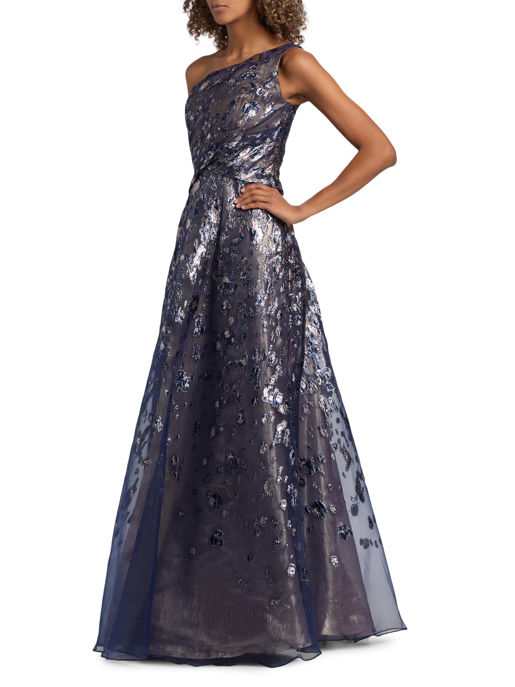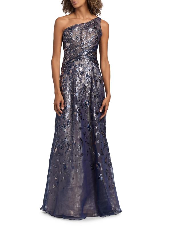 صُمم هذا الفستان بكتف واحد من مجموعة Rene Ruiz بتصميم مطرز باللون الأزرق المعدني، وهو مصمم بشكل هرمي بطول الأرض.