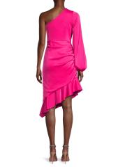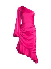 يُعد فستان الكوكتيل المصنوع من الساتان القابل للتمدد من ليف فوستر قطعة مميزة، حيث يتميز بتصميم غير متماثل بكتف واحد، وأكمام مطرزة طويلة، وحاشية تنورة مكشكشة تعزز أناقته.