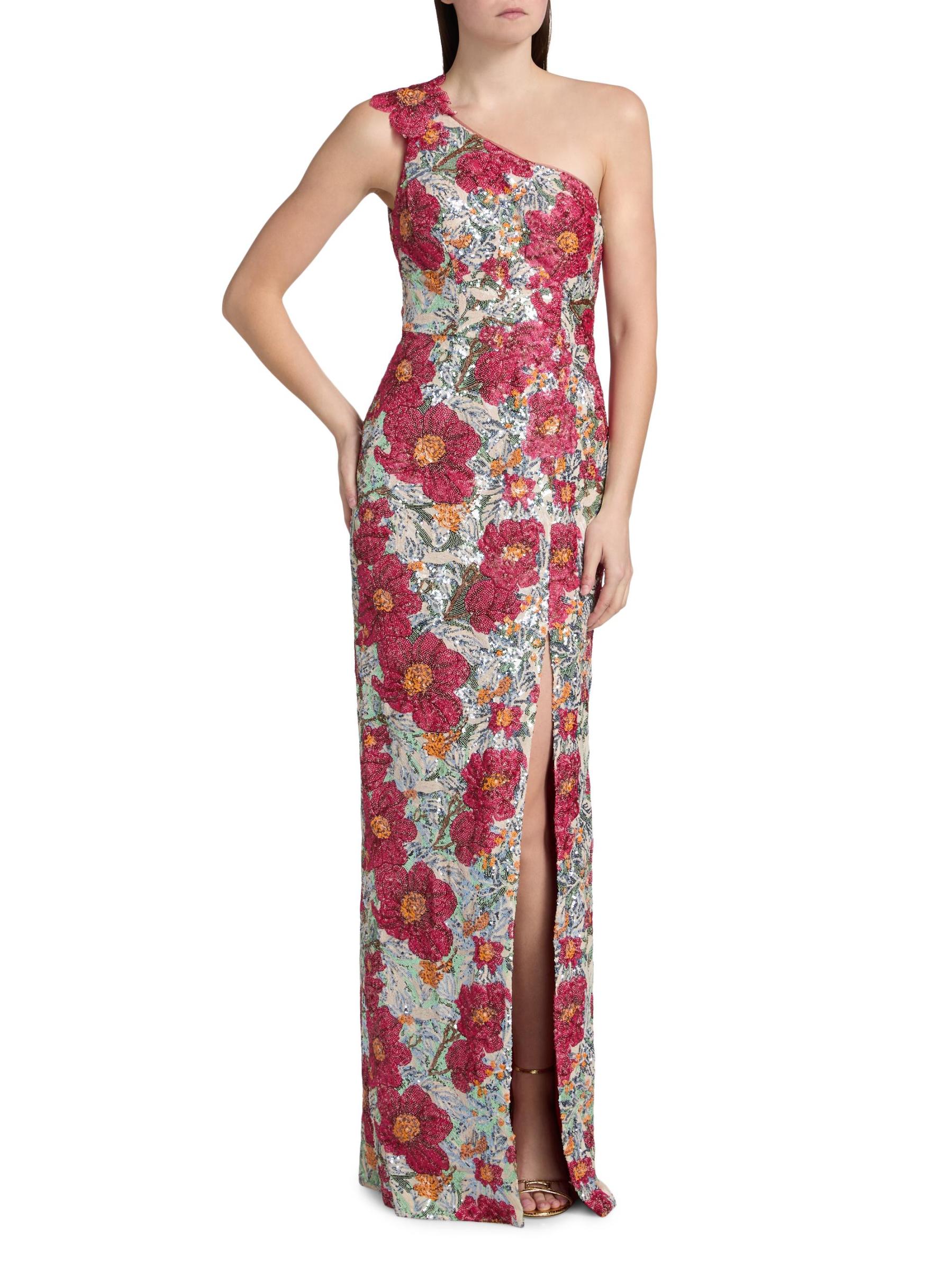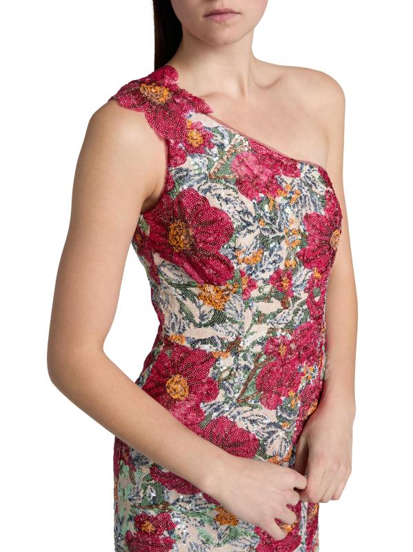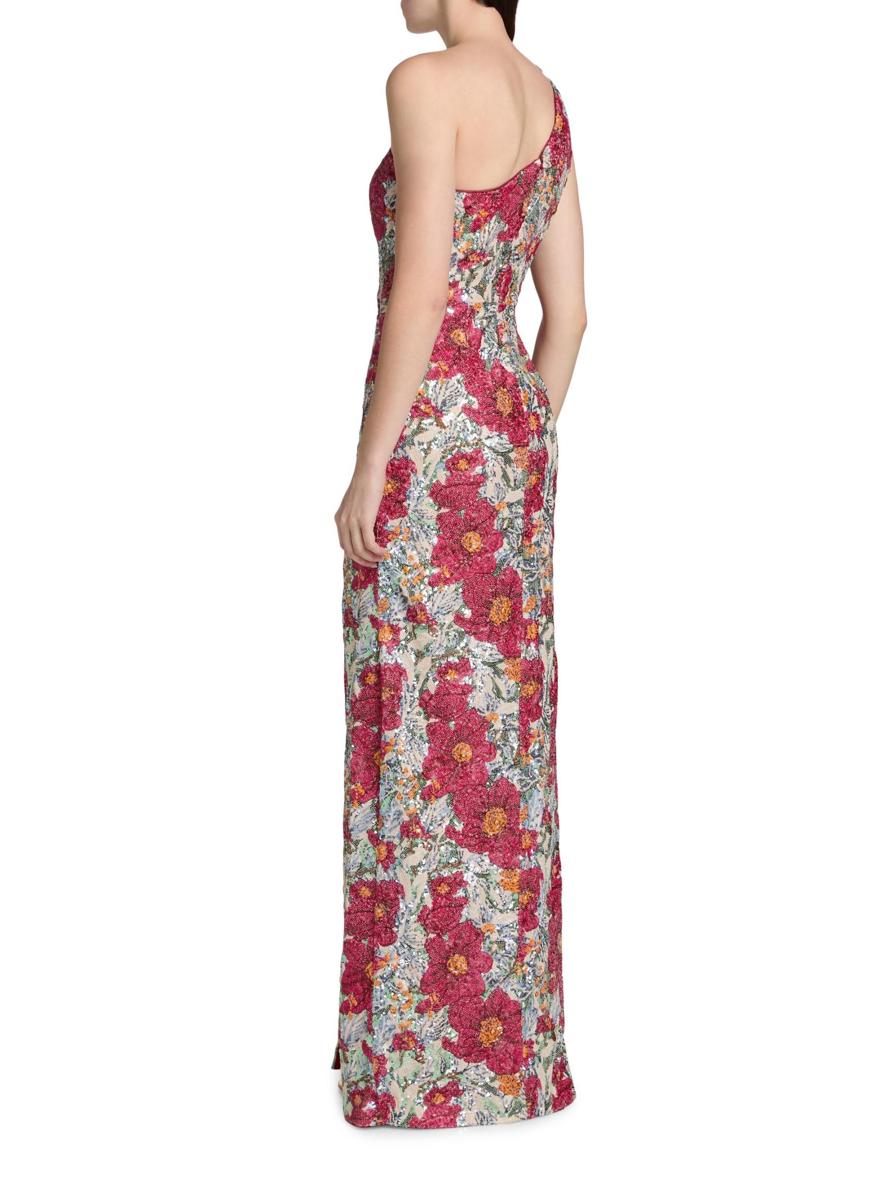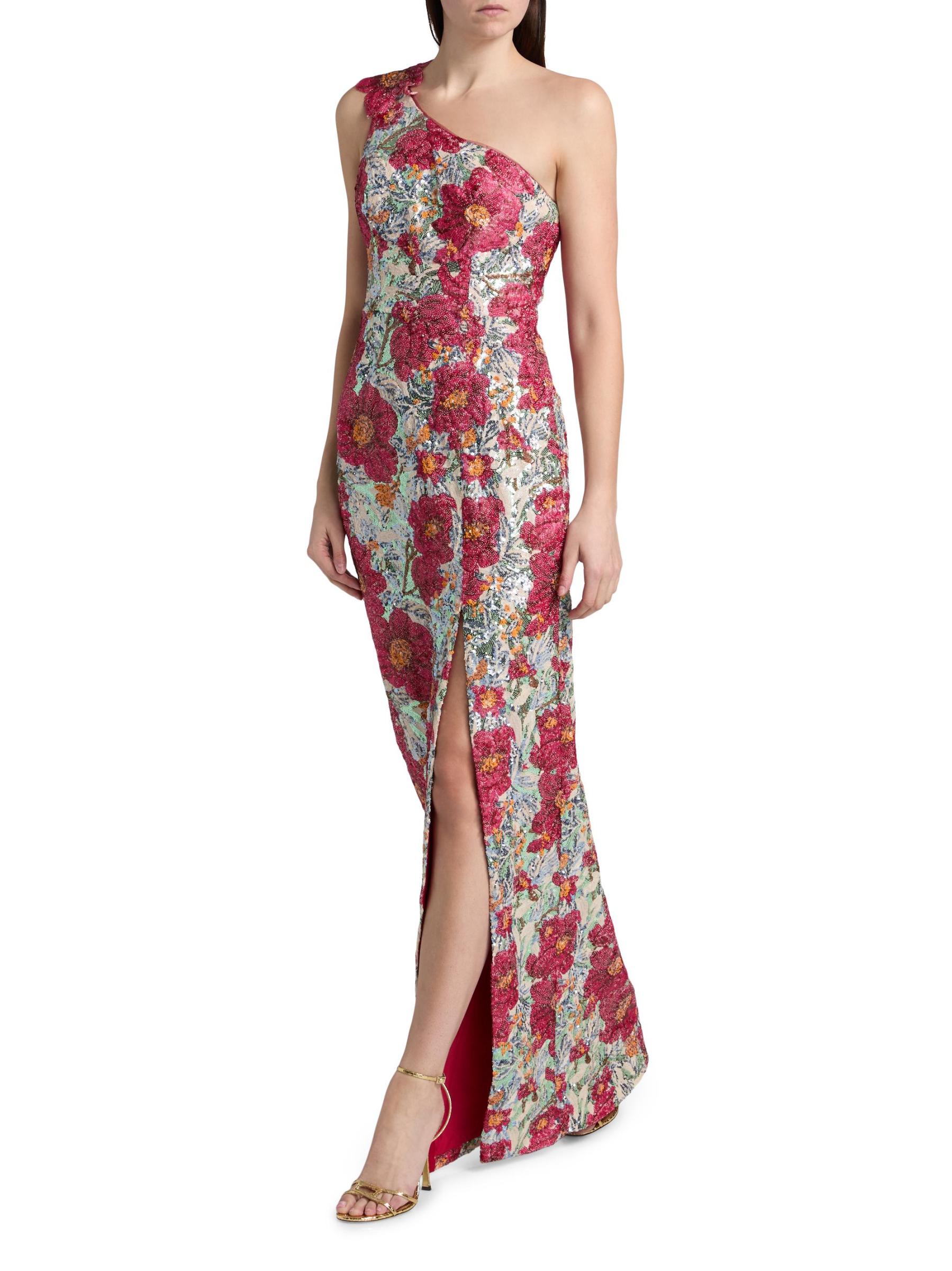 صُمم هذا الفستان ذو الكتف الواحد من مجموعة Rene Ruiz ليشكل على شكل حرف A بطول الأرض، وهو مزين بترتر زهري مذهل.