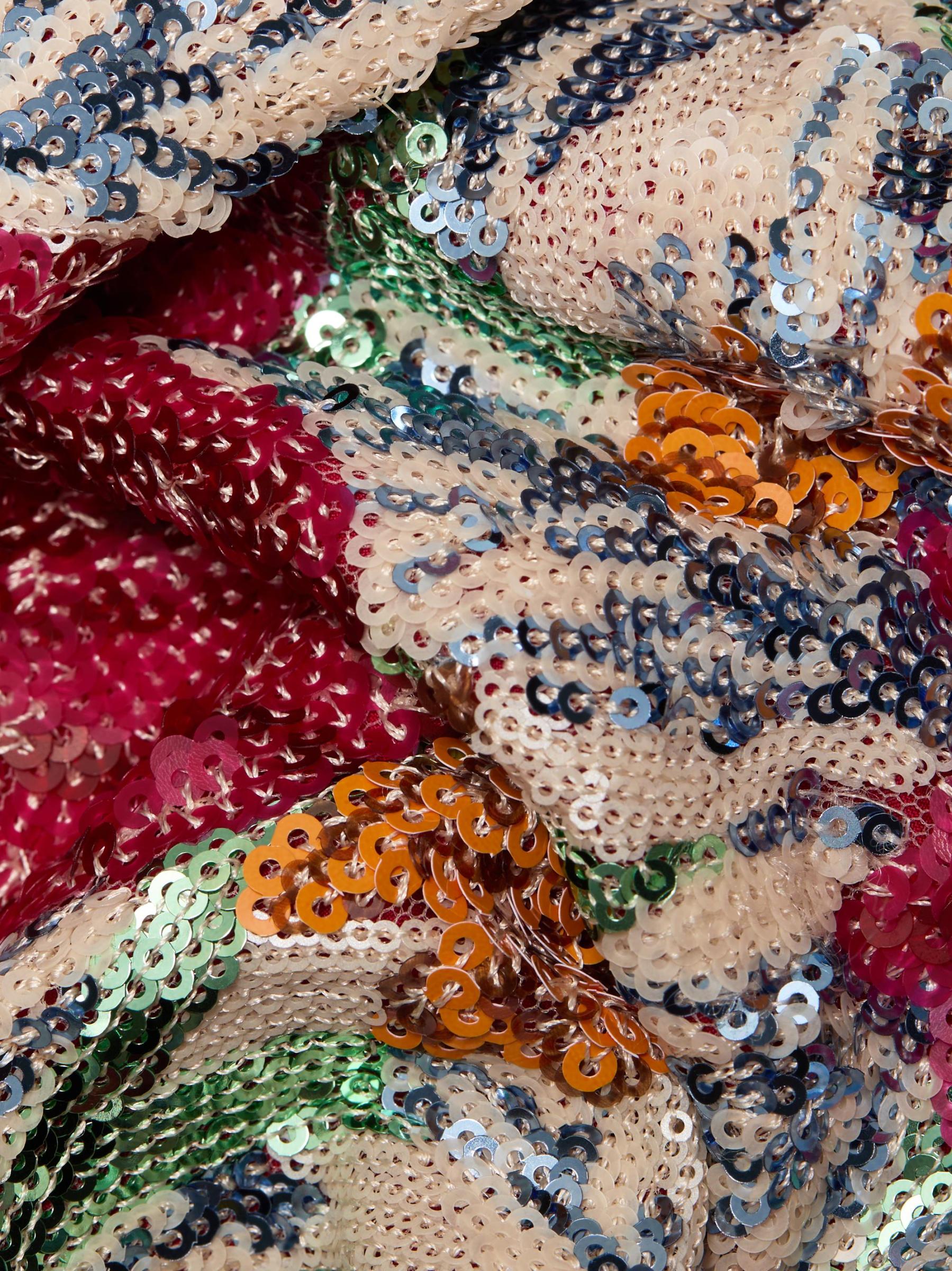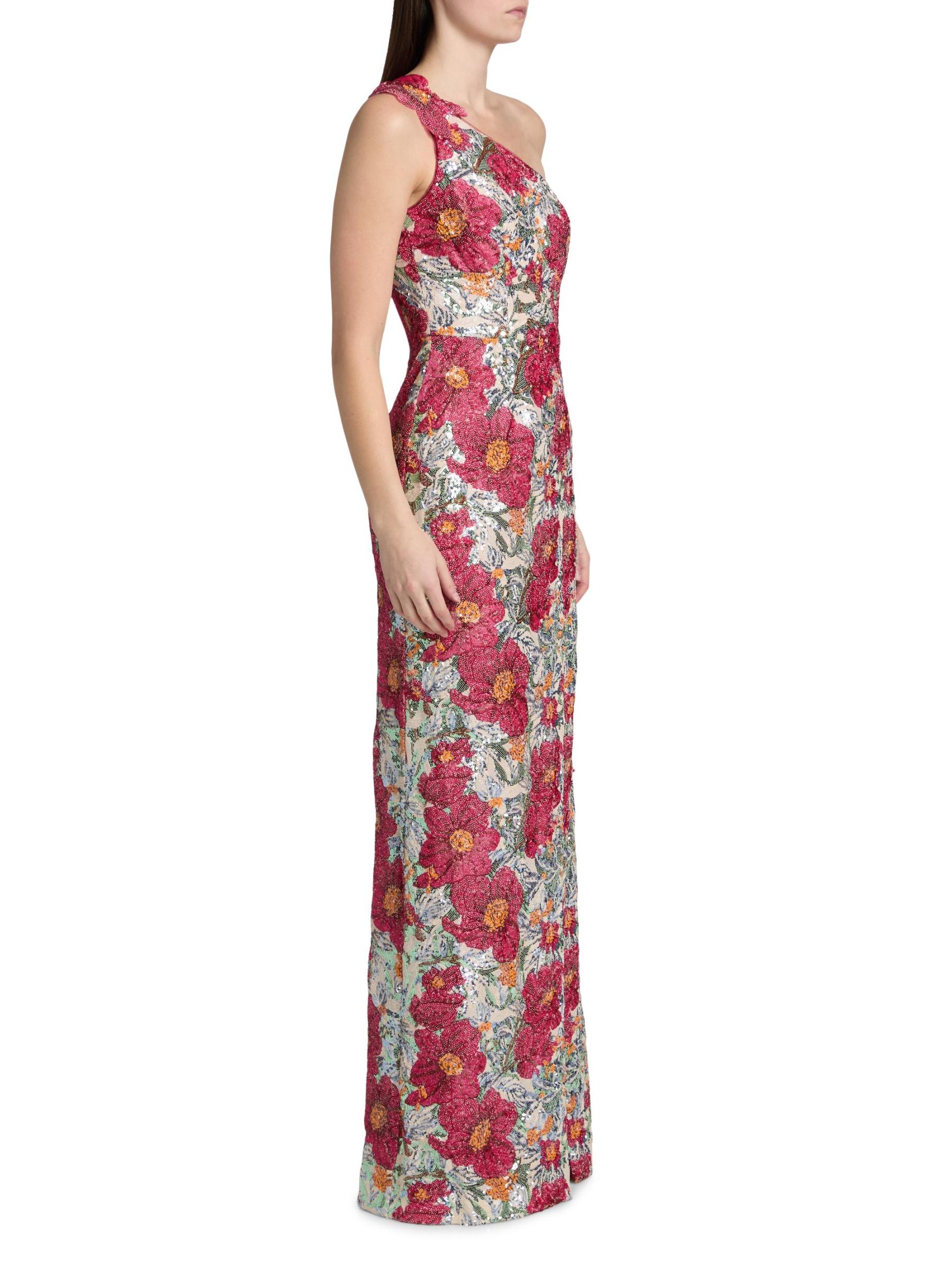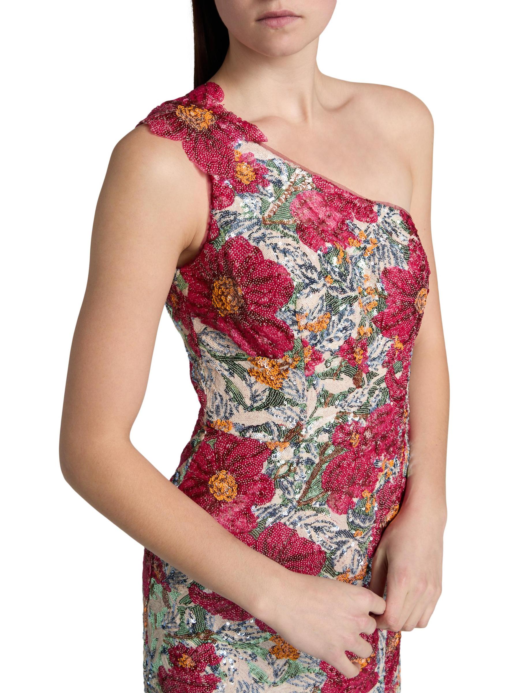 صُمم هذا الفستان ذو الكتف الواحد من مجموعة Rene Ruiz ليشكل على شكل حرف A بطول الأرض، وهو مزين بترتر زهري مذهل.