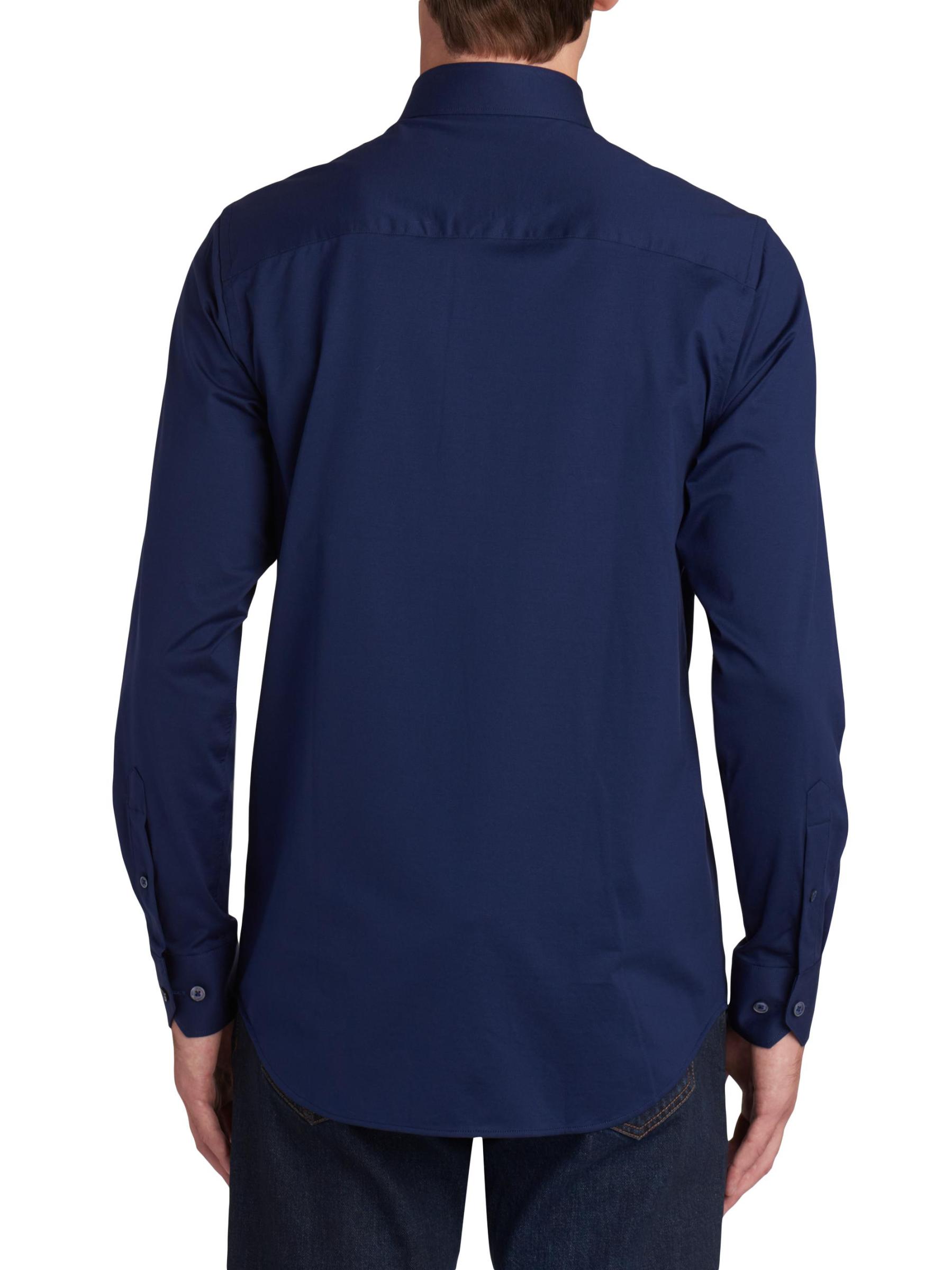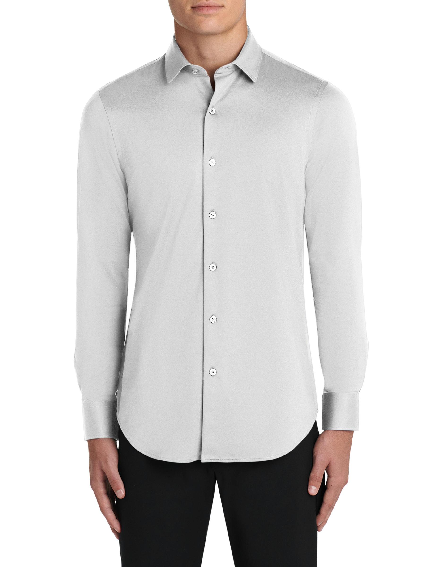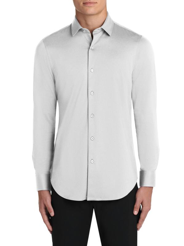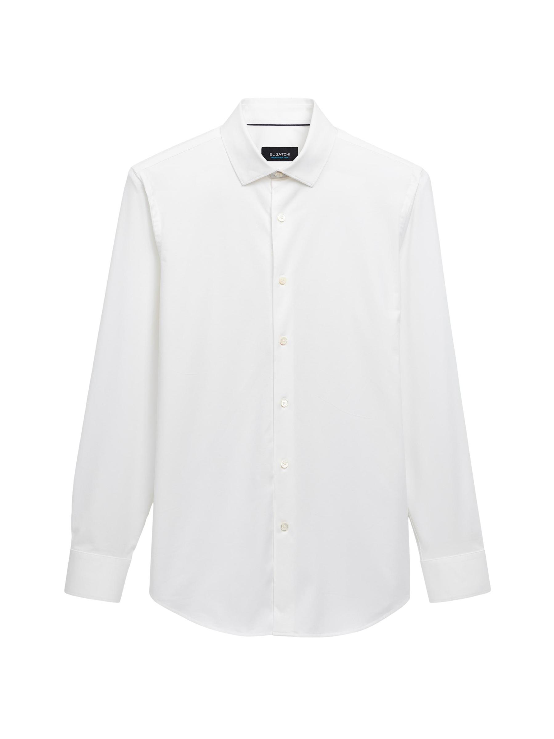 يتميز قميص Bugatchi المريح القابل للتمدد بنقشة الرخام بياقة تقليدية واسعة وأكمام طويلة وأساور مدببة.