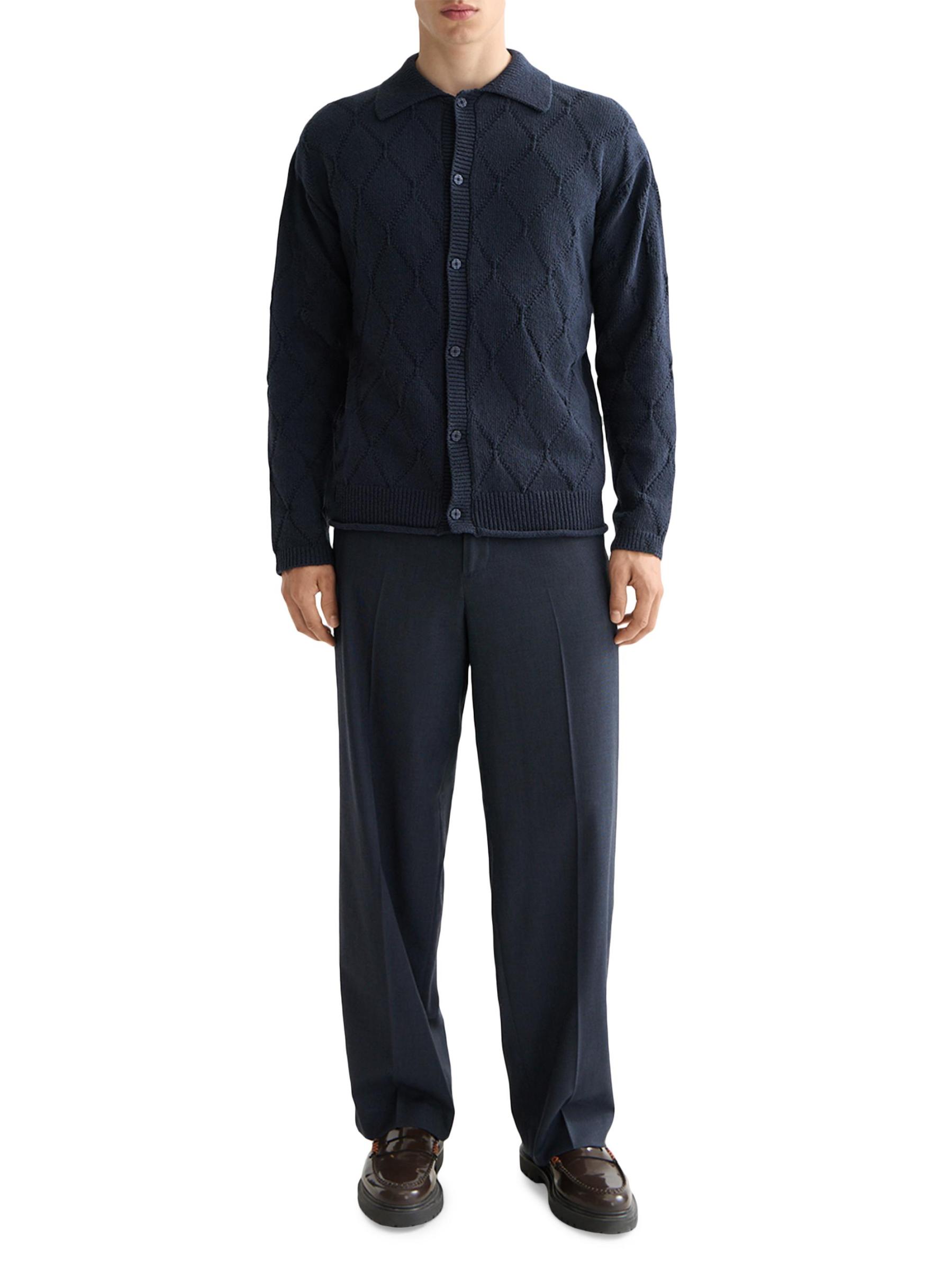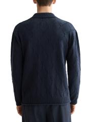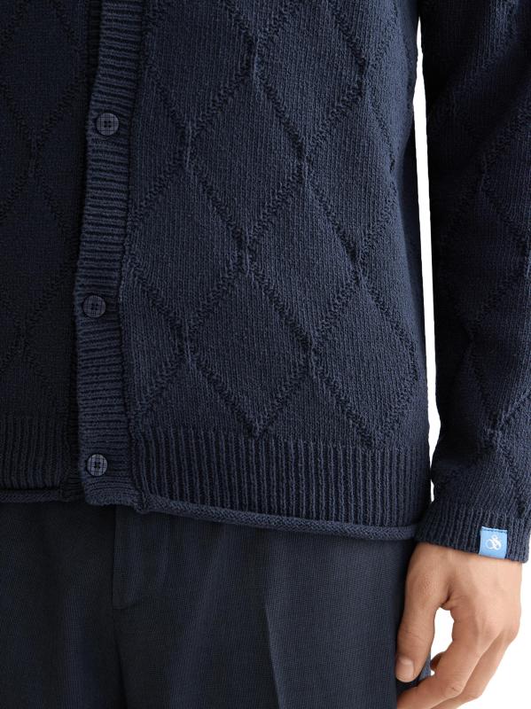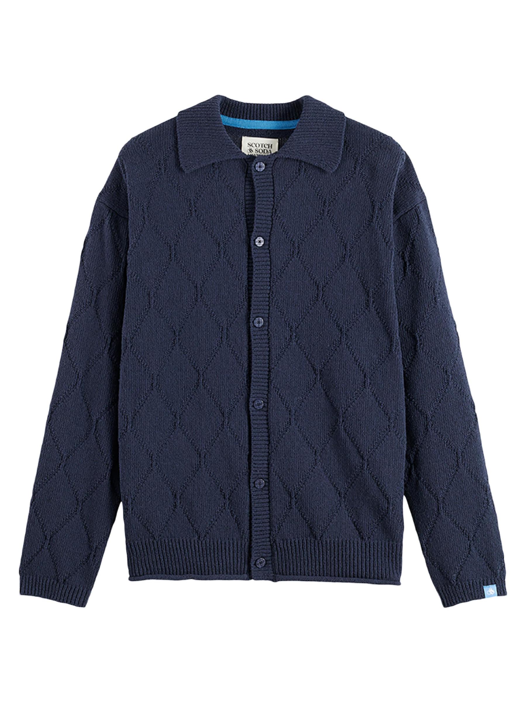 يتميز هذا الكارديجان من سكوتش آند سودا، المحبوك من خيوط من مزيج القطن، بغرزة مخرمة مزخرفة بالألماس. تُكمل القطعة ياقة مطبوعة محبوكة على شكل أضلاع.