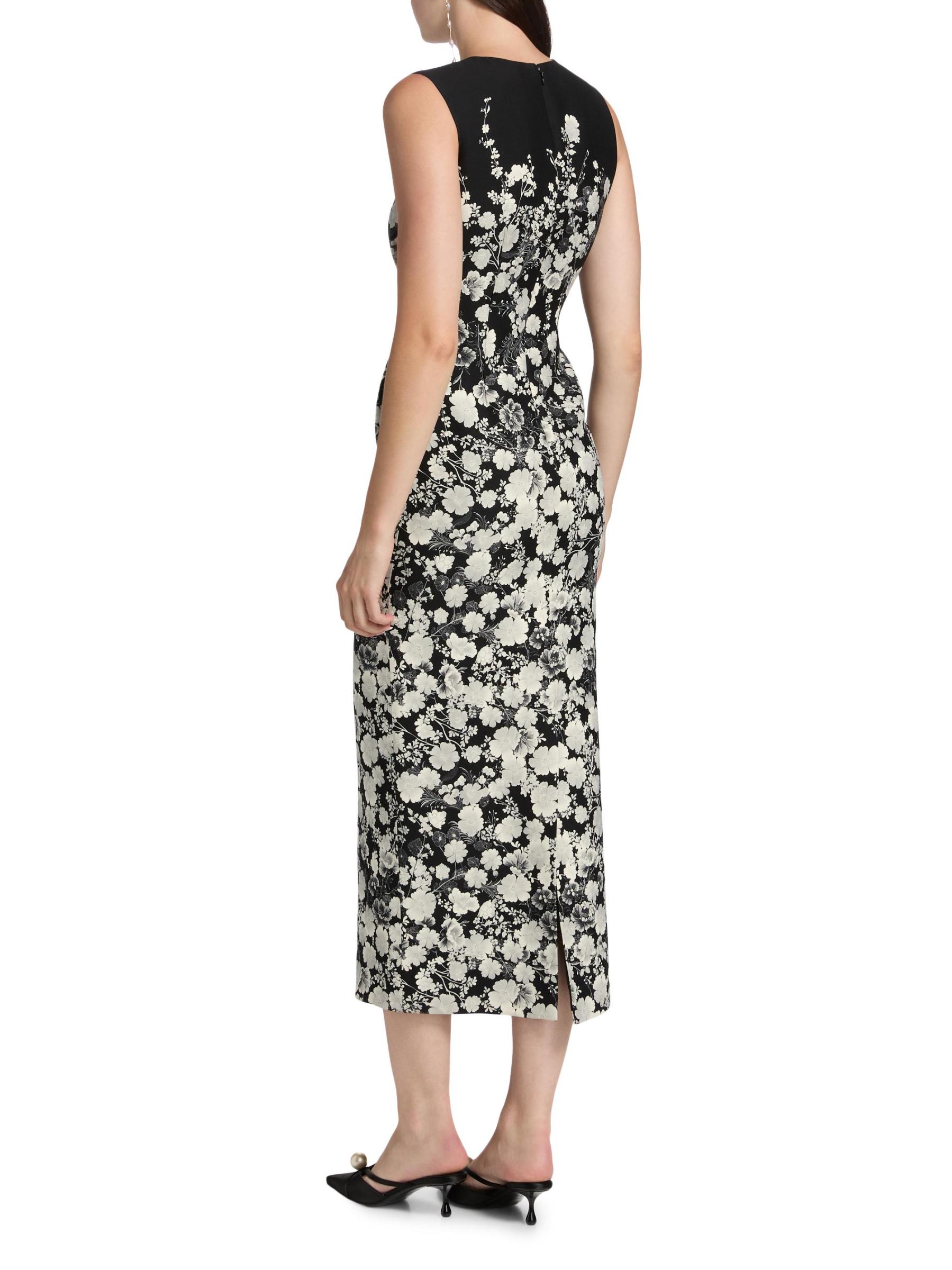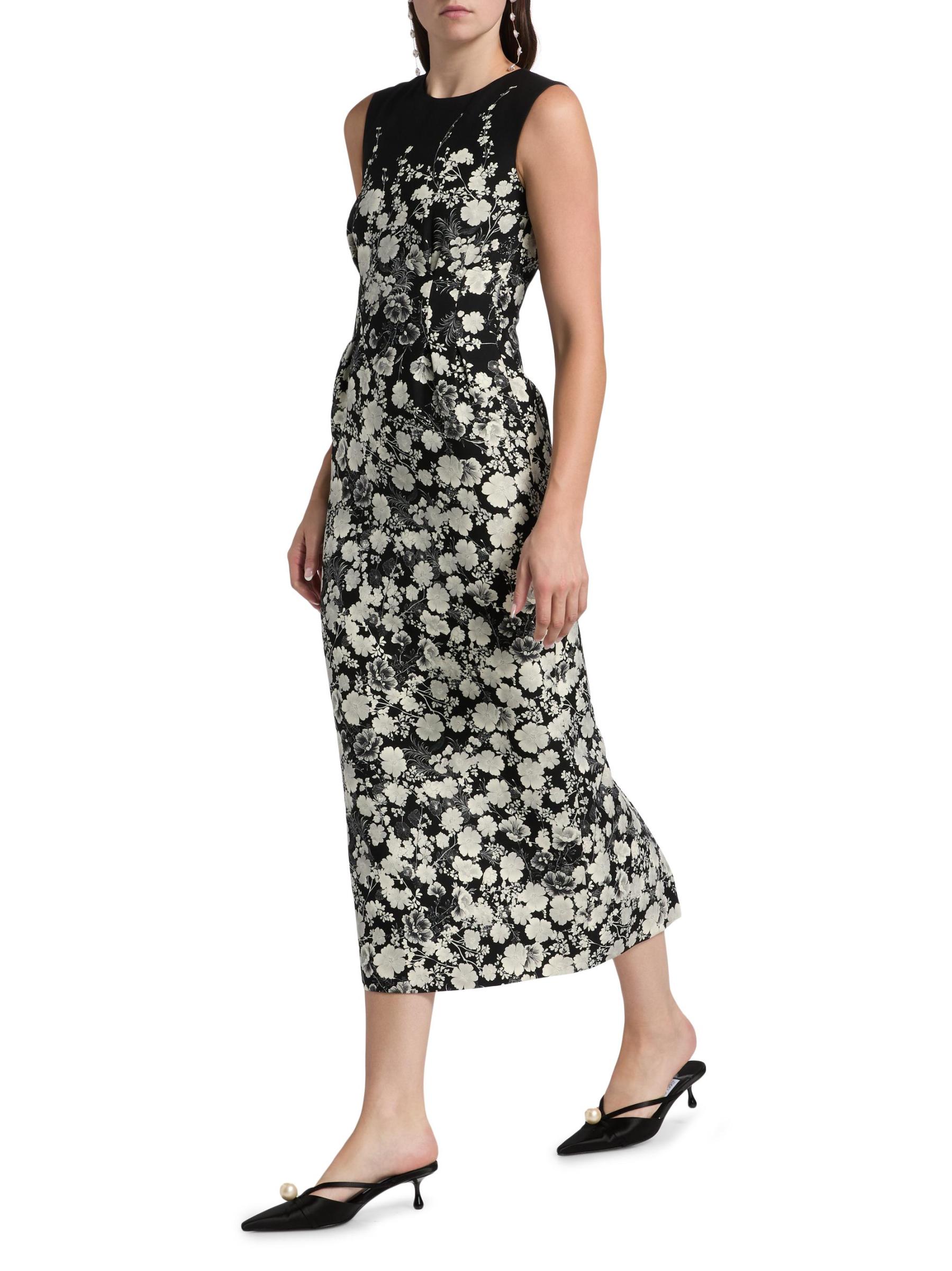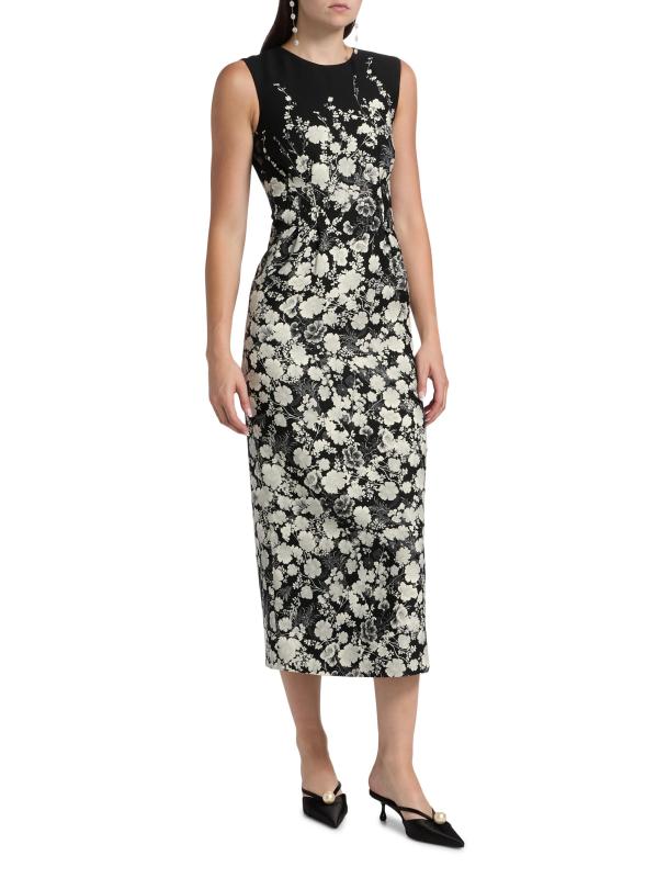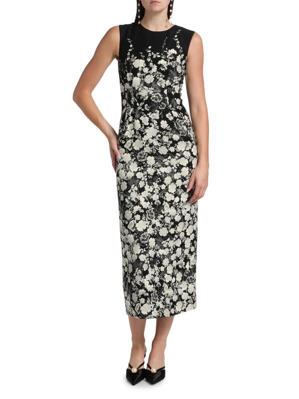 صُمم فستان Ophelia midi من Adam Lippes من مزيج الصوف والحرير بتصميم غمد أنيق مع رقبة كلاسيكية على شكل جوهرة وخصر أنيق. يتميز التصميم بلا أكمام بنقشة زهور ساحرة وفتحة خلفية.