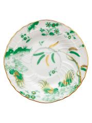 من مجموعة أورو دي دوتشيا. تزين ديوك جي أوندوري، رمز الفضيلة والثروة، صحن الشاي الخزفي هذا بتناغم دقيق مع خلفية زهرية. يتم تعريف مجموعة Oro di Doccia من خلال شكل Vecchio Ginori الشهير وهي متوفرة في مجموعة كاملة من أدوات المائدة والشاي والقهوة.