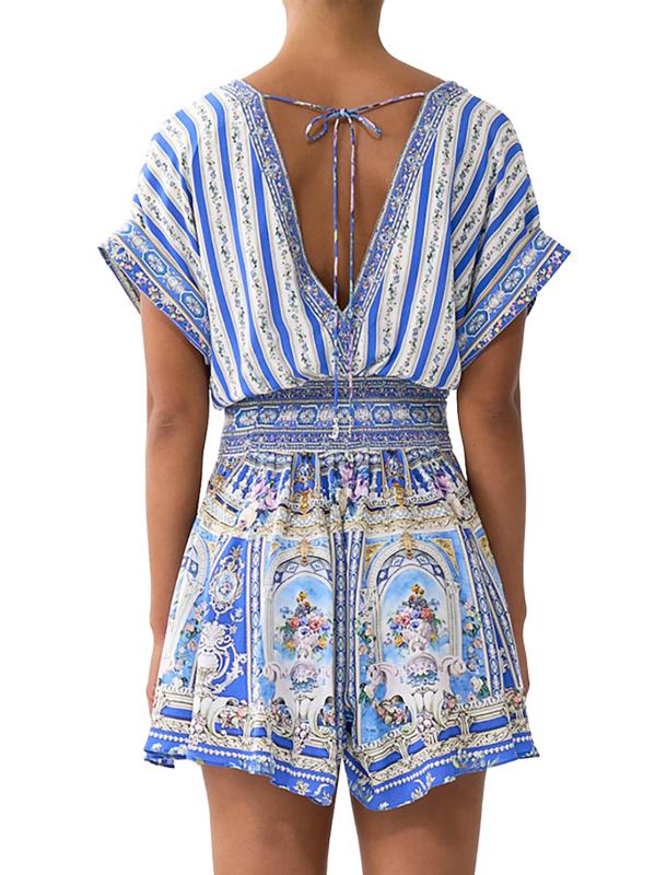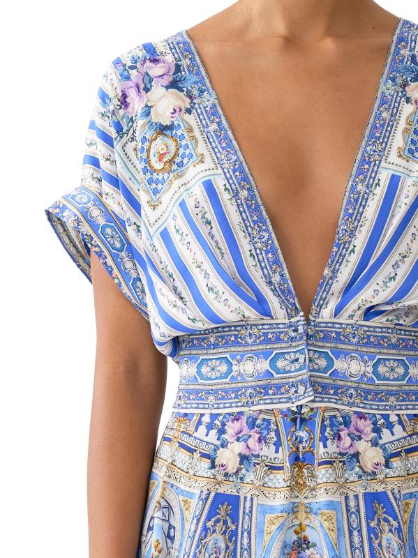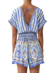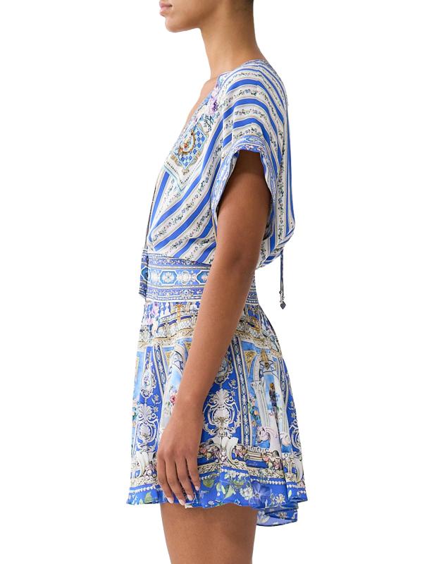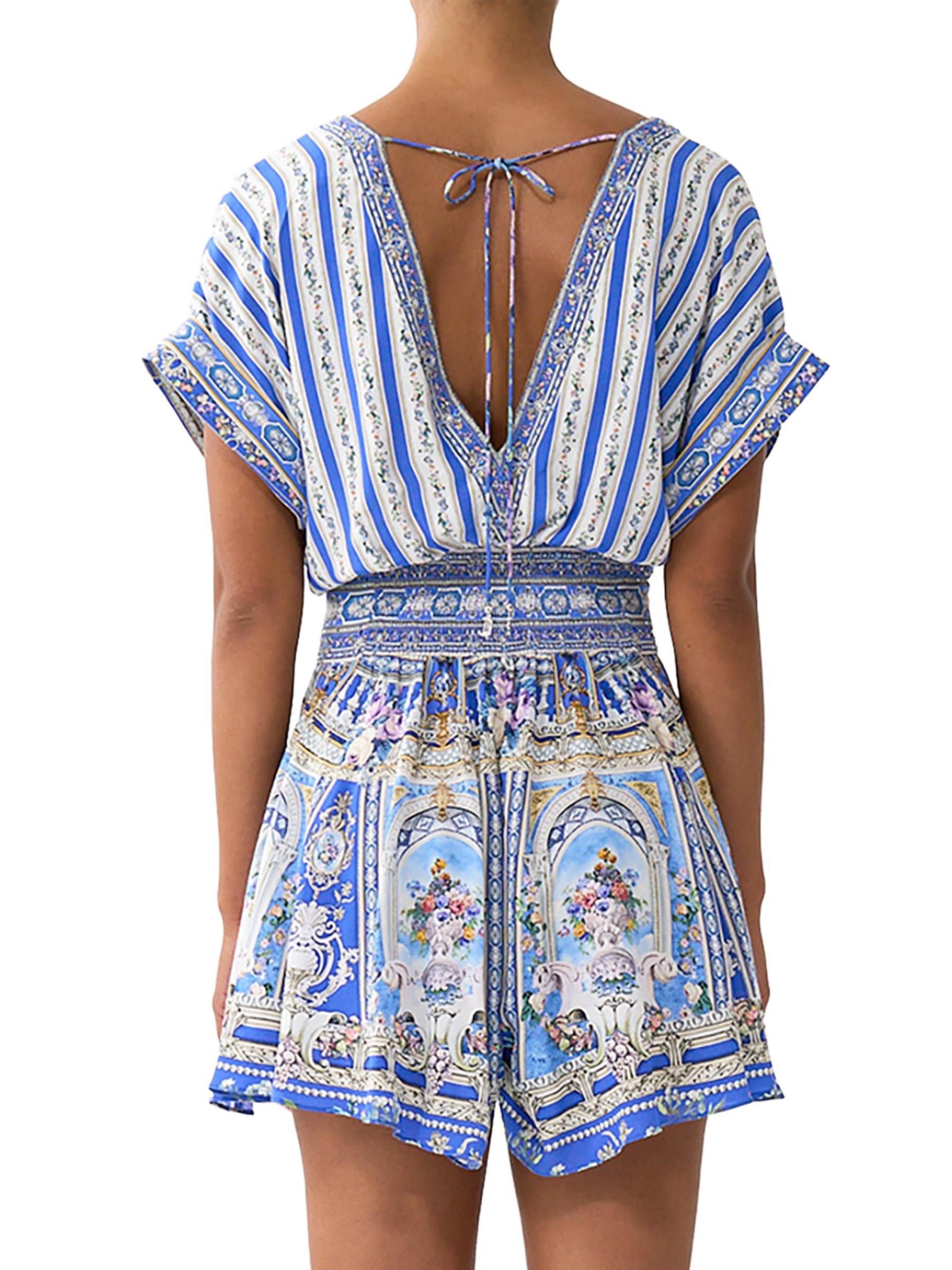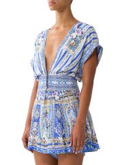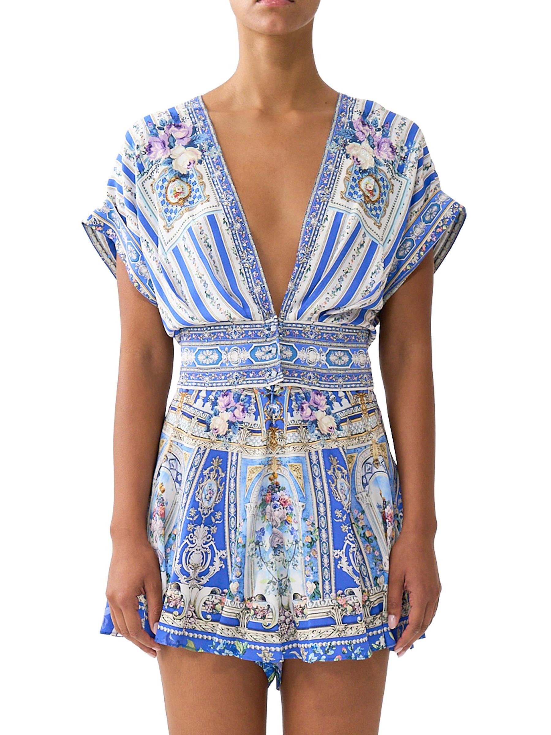 يتميّز الرومبير المرح من كاميلا، المصنوع من الحرير الفاخر، بنقشة العلامة التجارية العثمانية، وخصر محدد بأزرار أمامية، وتقويرة جريئة على شكل حرف V.