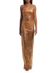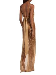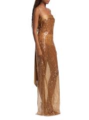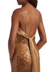يُظهر هذا الفستان ذو القطع المتحيز من Elisabetta Franchi تصميمًا شفافًا مزينًا بالترتر. ويكتمل المظهر بتقويرة مستقيمة مزينة بالساتان وقوس في الخلف.