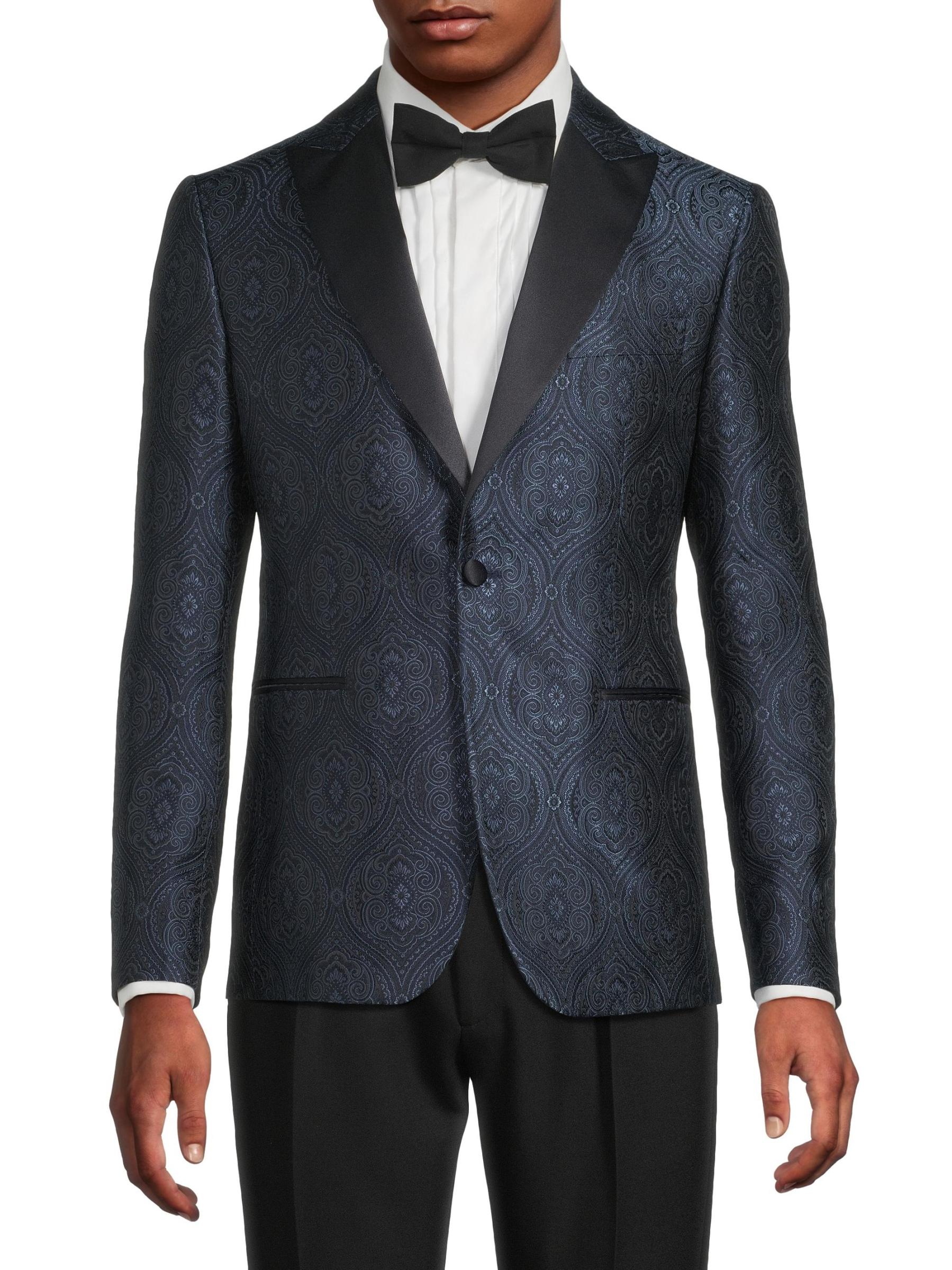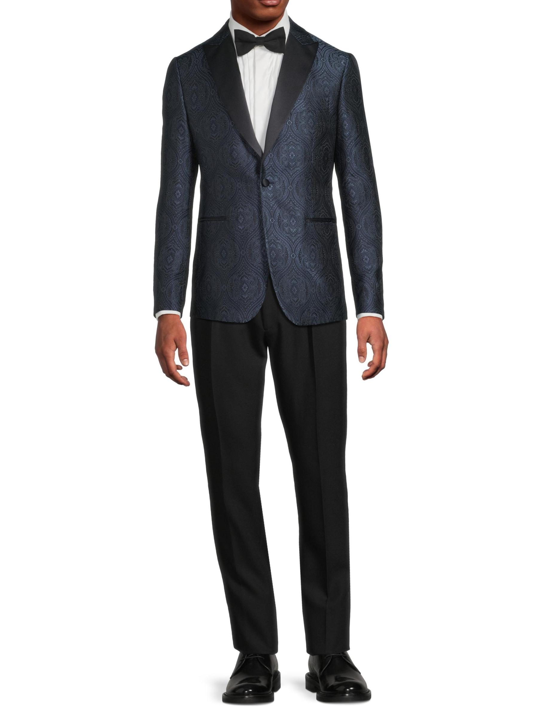 جاكيت عشاء Pal Zileri هذا مصنوع من مزيج من الحرير بتصميم بيزلي منسوج، وهو مصمم بشكل أحادي الصدر ويتميز بزخرفة متباينة من الساتان.