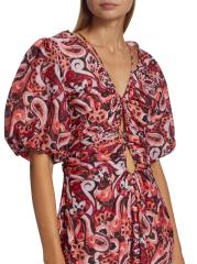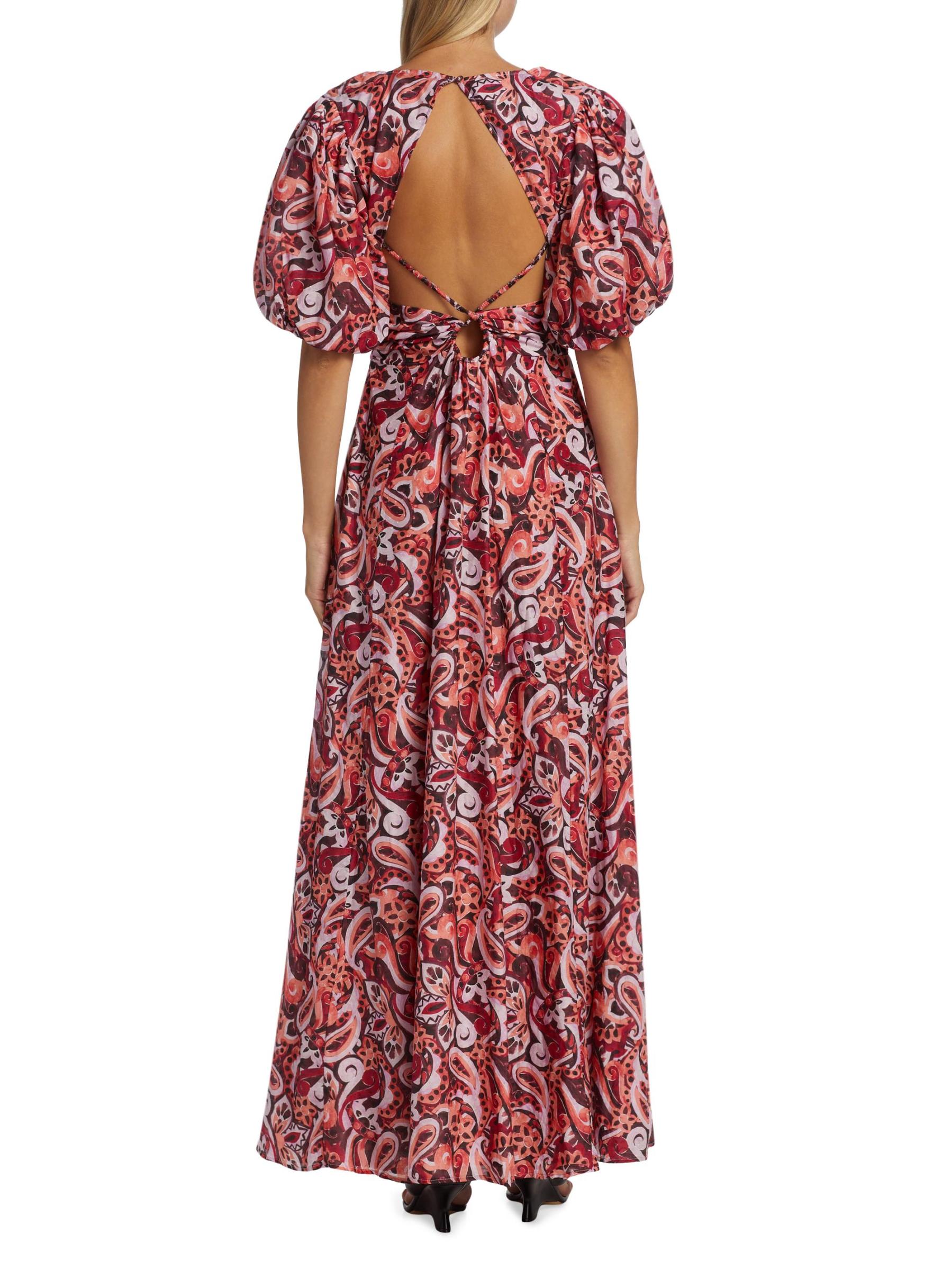 يتميز فستان Pallida الطويل بأكمام قصيرة من Magali Pascal بطبعة فريدة وصدر مجمّع بفتحة وأكمام قصيرة منفوخة. يُكمل الجزء الخلفي المفتوح هذا النمط من مزيج الحرير.