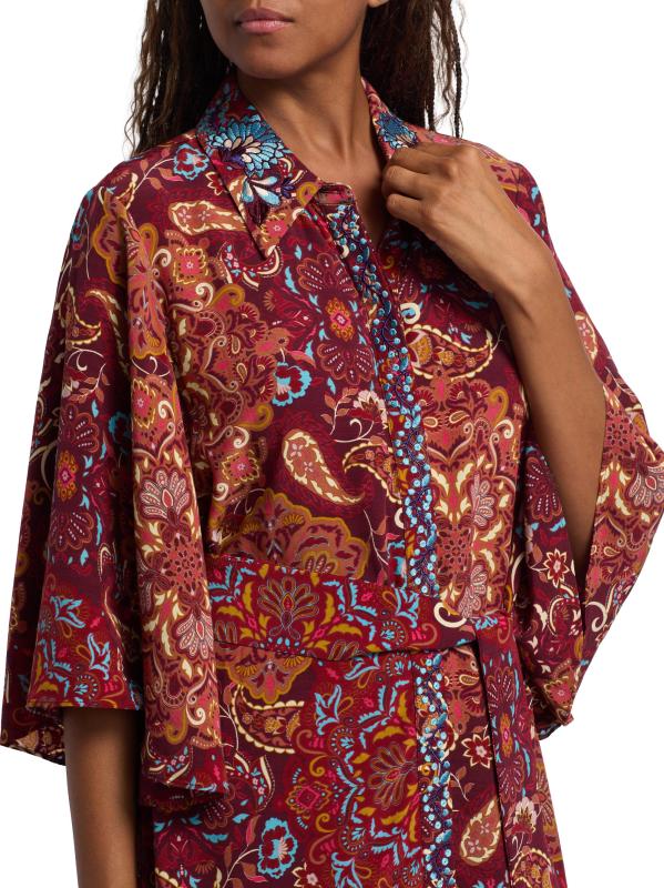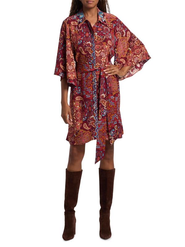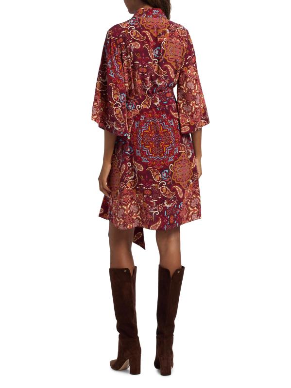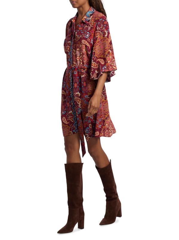 يتميّز فستان Pamela من Figue الذي تم تشطيبه بنقشة بيزلي ذات ياقة واسعة وأكمام منسدلة بطول الكوع وحزام قابل للربط الذاتي.