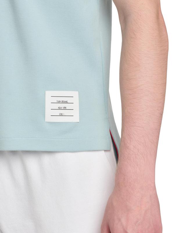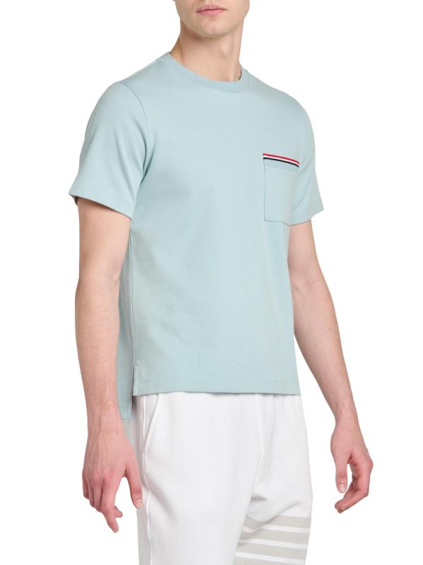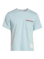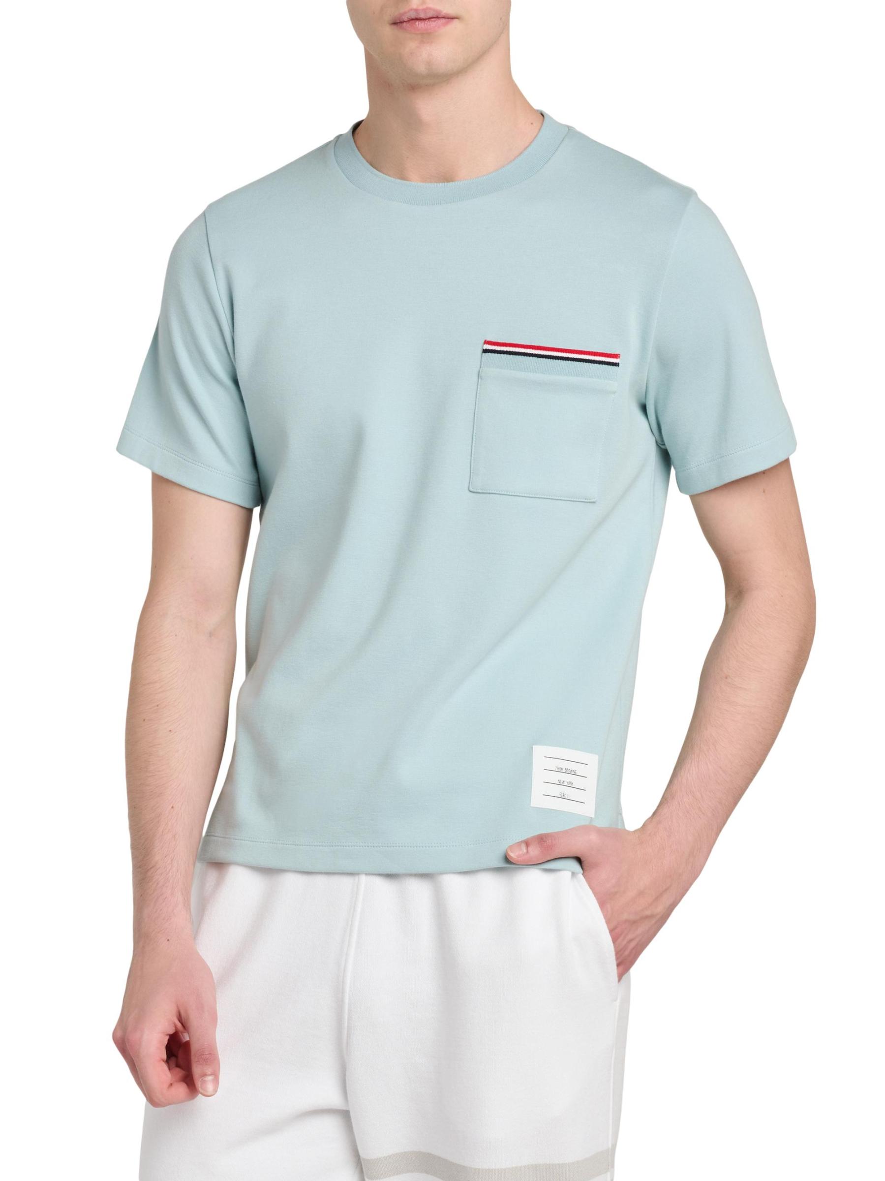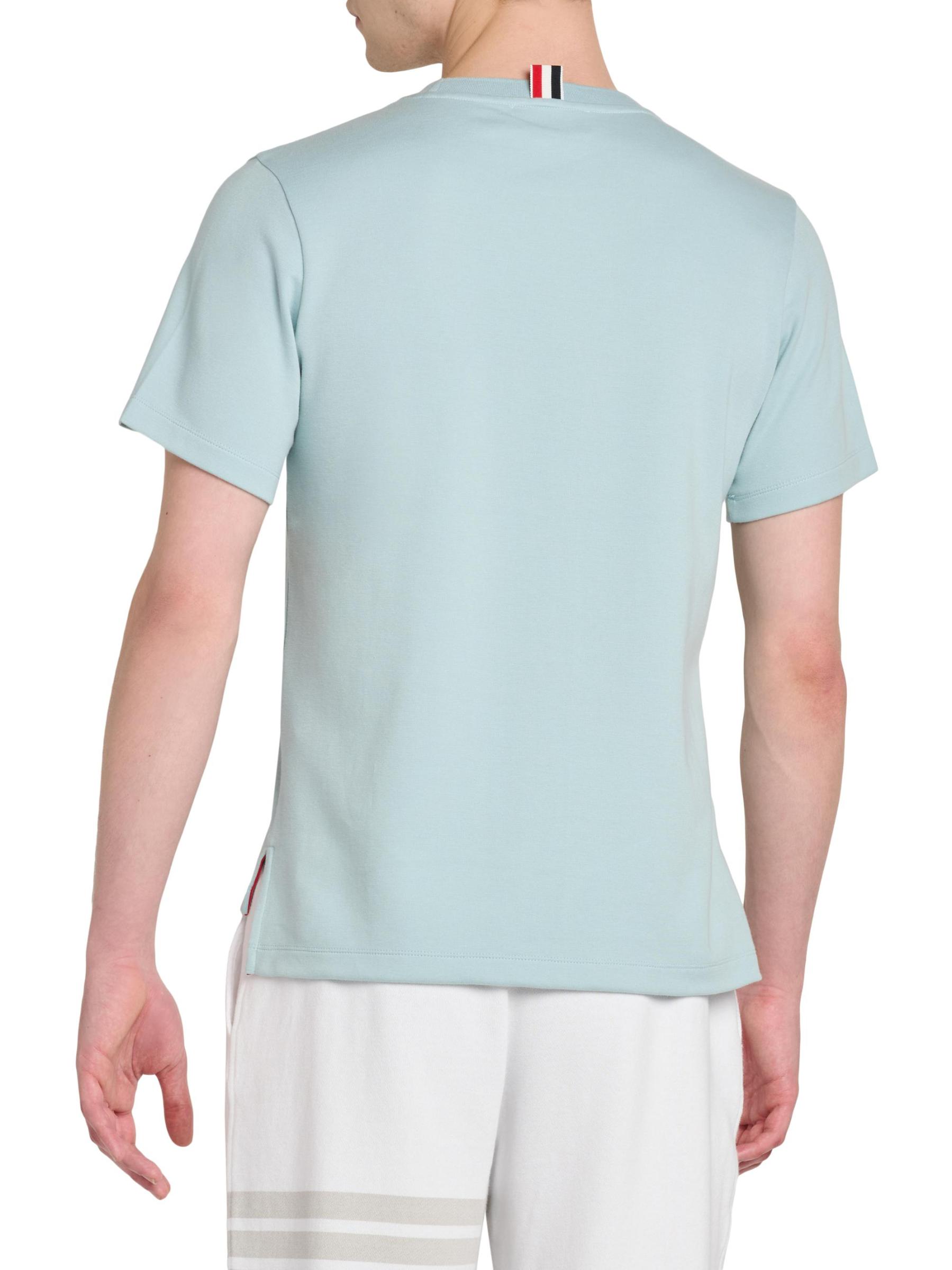 صُمم هذا التيشيرت من Thom Browne من قماش الجيرسي القطني المزوّد برقعة شعار العلامة التجارية على الحافة اليسرى والخطوط الأيقونية في الجيب الخارجي على الصدر.