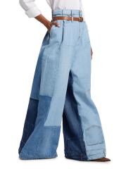تتميّز سراويل الجينز الكبيرة ذات الأرجل الواسعة من A.W.A.K.E. Mode بتصميمها المرقع الذي يجمع بين طبقات مختلفة من الجينز والتفاصيل المثبتة معًا للحصول على مظهر تجريدي.
