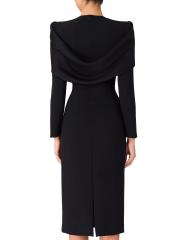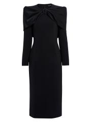 يتميز فستان Penny midi من Jenny Packham، الذي تم تصميمه بشكل غمد، بتفاصيل معقودة في الأمام. تضيف وسادات الكتف هيكلًا إلى هذا المظهر.